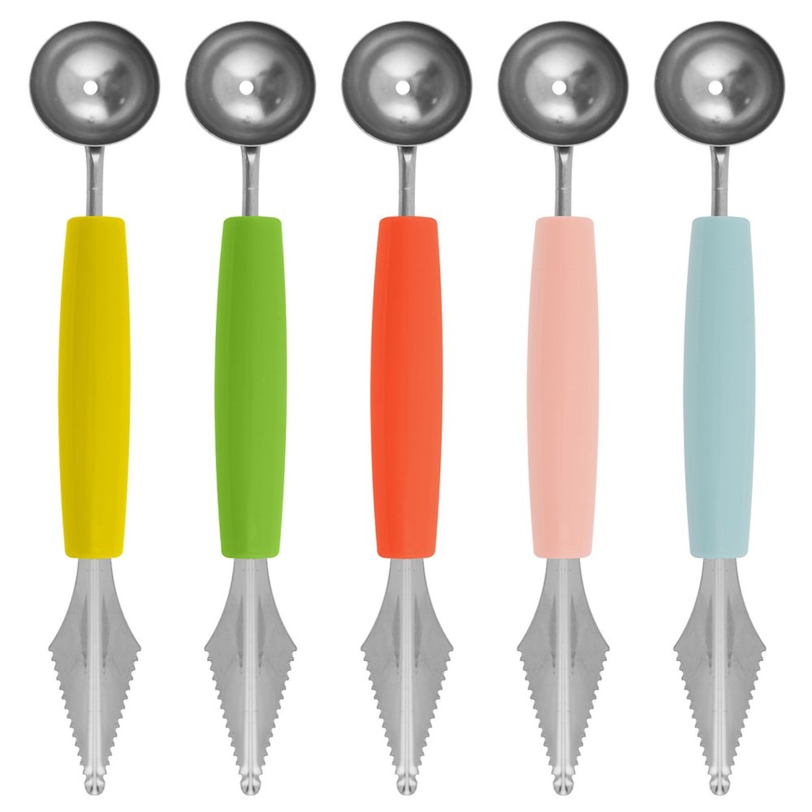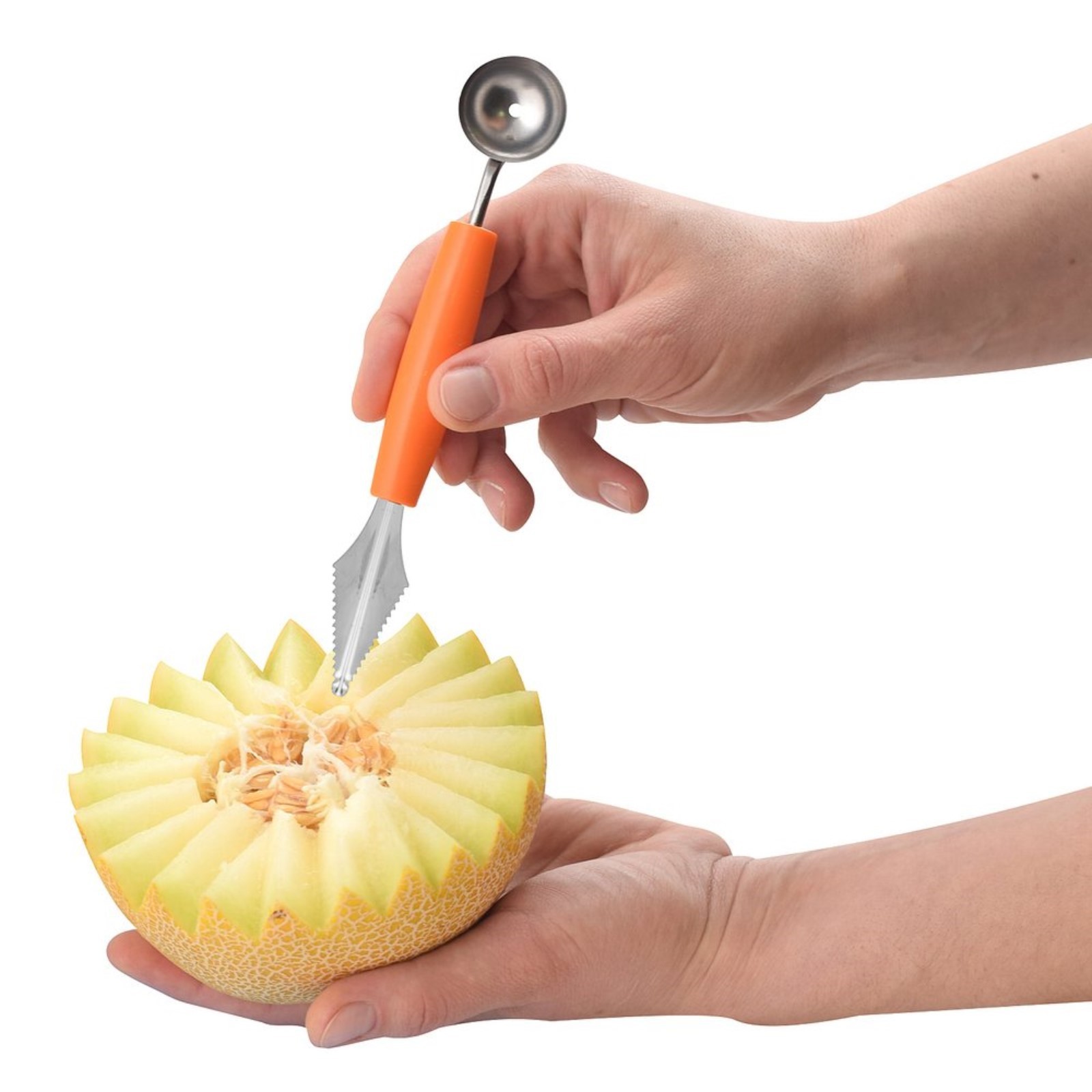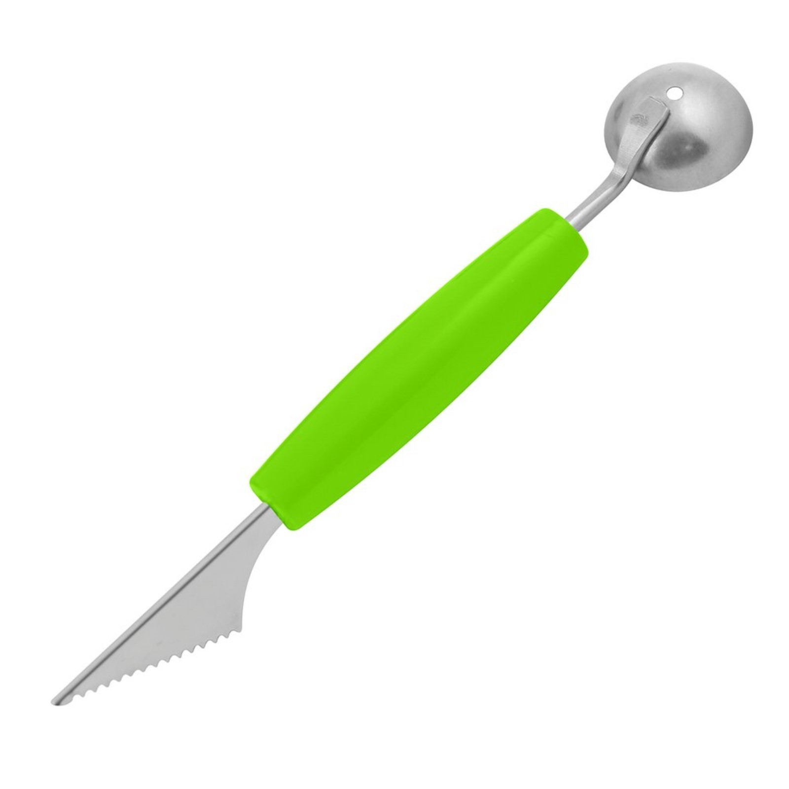 Инструмент представляет собой карбовочной нож V-образной формы с одной стороны и ложку-нуазетку с другой стороны. Карбовочные ножи V-образной формы используются для вырезания канавок и выемок, а ложки-нуазетки - для выемки мякоти из крупных плодов, вырезания шариков и полусфер.