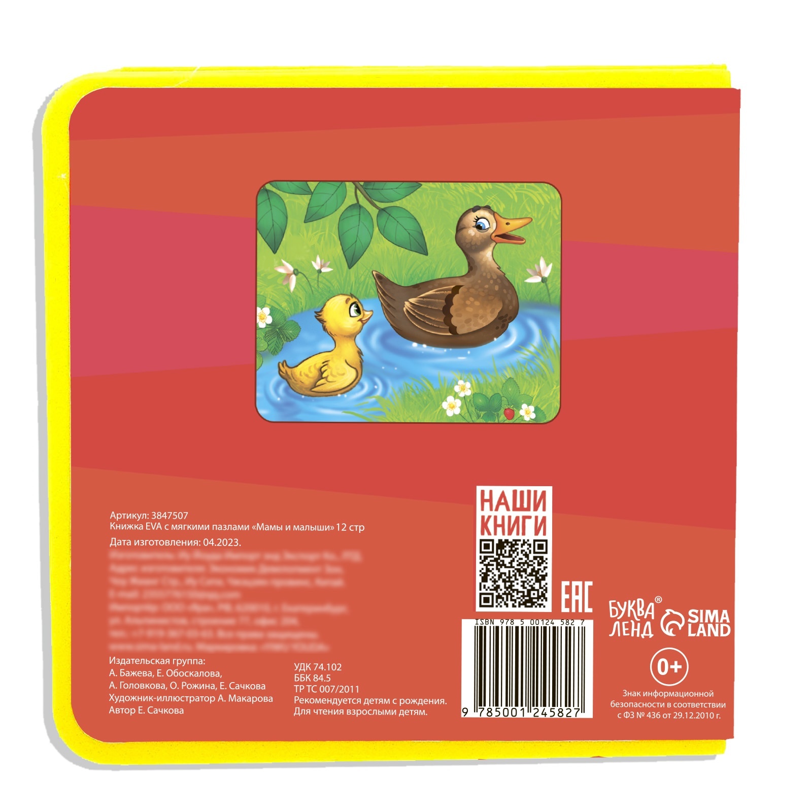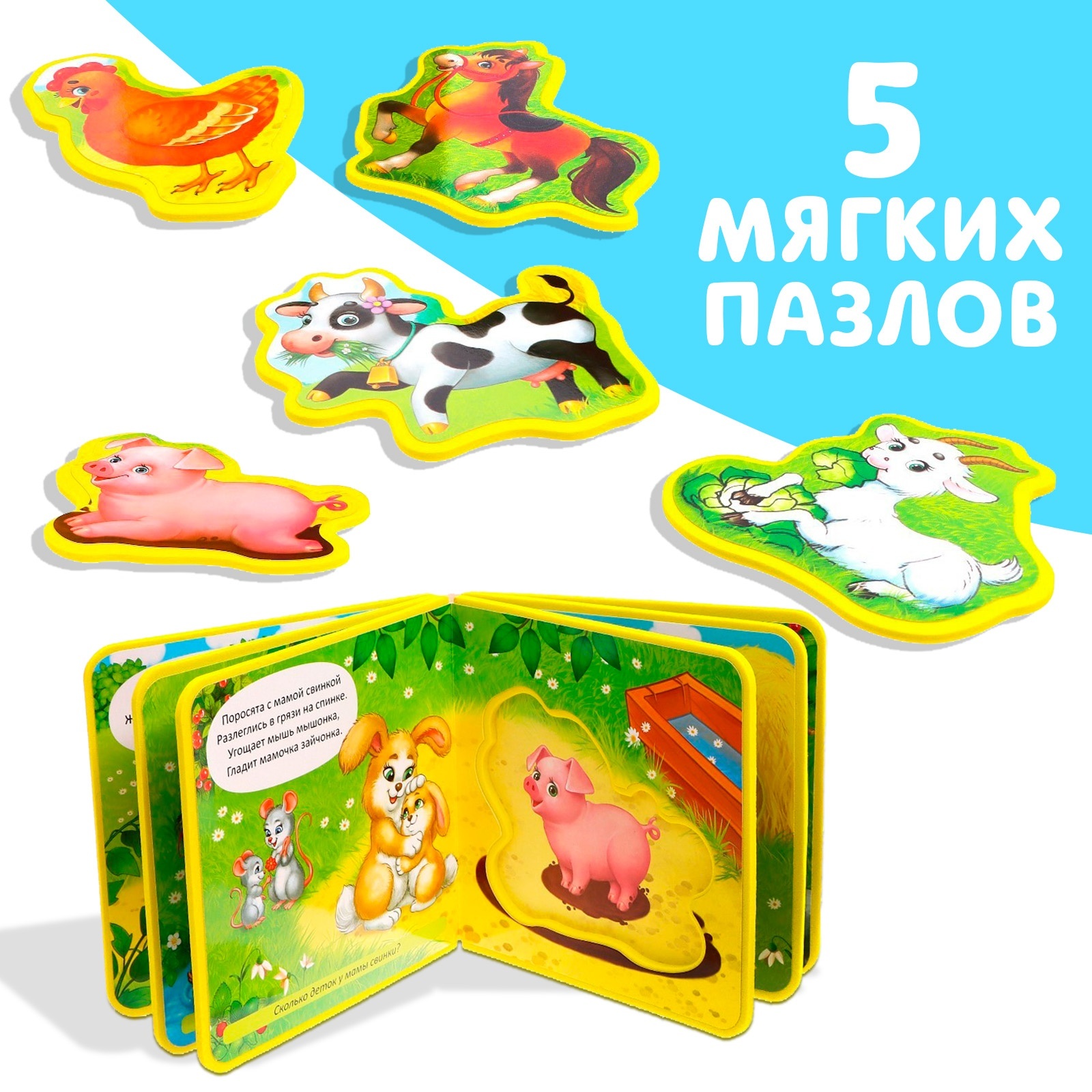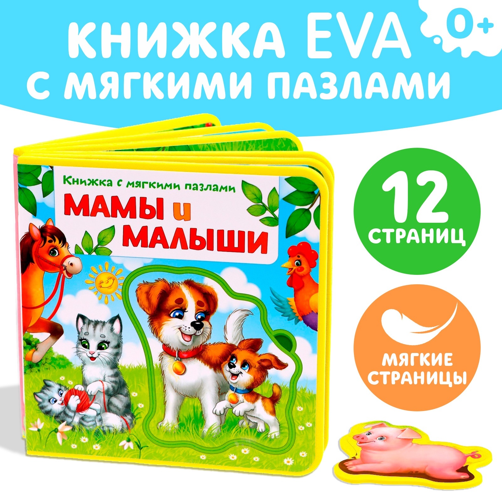 Книжка с мягкими пазлами eva «мамы и малыши», 12 стр.. Мягкая книга сделана из приятного на ощупь пористого материала ЭВА. На каждой странице приклеены яркие иллюстрации с милыми животными и их детёнышами, которые понравятся малышу. У книги нет острых углов, она лёгкая, поэтому безопасна даже для самых маленьких деток. С мягкой книгой малыш получит свои первые знания о домашних животных, которые живут на ферме. А также сможет поиграть с вынимающимися пазлами. Рекомендуем не мочить книгу, так как картон, приклеенный на ЭВА-основу, невлагостойкий. Рекомендована для чтения взрослыми детям с рождения. Набор:Нет|Возраст:От 0 месяцев|Количество страниц:12|Развитие навыков:Моторика|Развитие навыков:Кругозор|Тип:С пазлами|Автор:Сачкова Евгения Камилевна|Страна:Китай  развернуть описание ▼