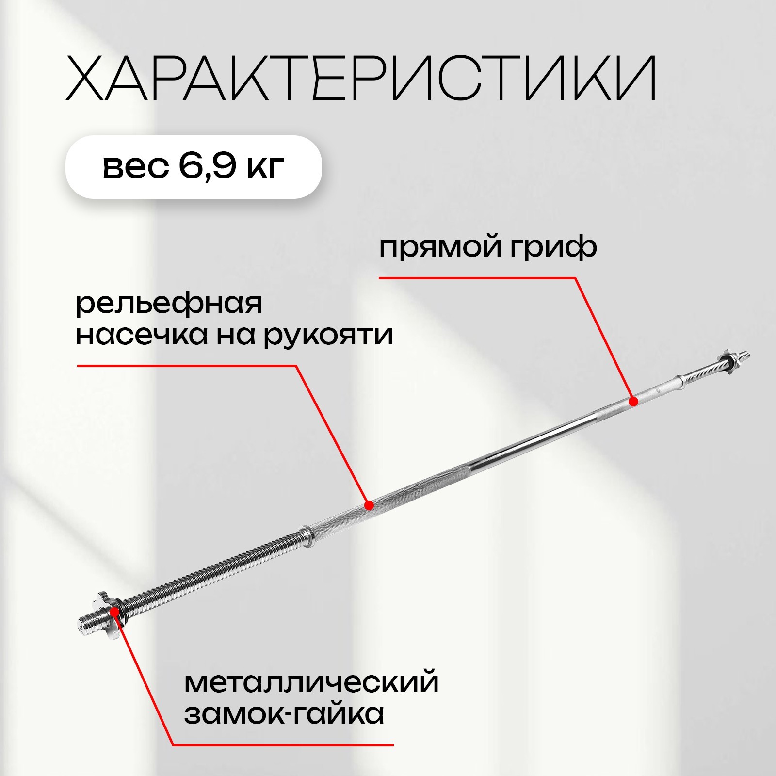 Гриф прямой с замками onlytop, вес 6,9 кг, 180 см, d=20 мм, до 100 кг. Гриф предназначен для сбора штанги на тренировках по тяжёлой атлетике и фитнесу. Замки входят в комплект. Цвет: Хромированный Длина, см: 180 Вес, кг: 6.9 Диаметр посадочного места, мм: 20 Диаметр грифа, мм: 25 Макс. нагрузка на гриф, кг: 100 Материал: Металл Вид грифа: Прямой Фиксаторы диска: Гайки  развернуть описание ▼