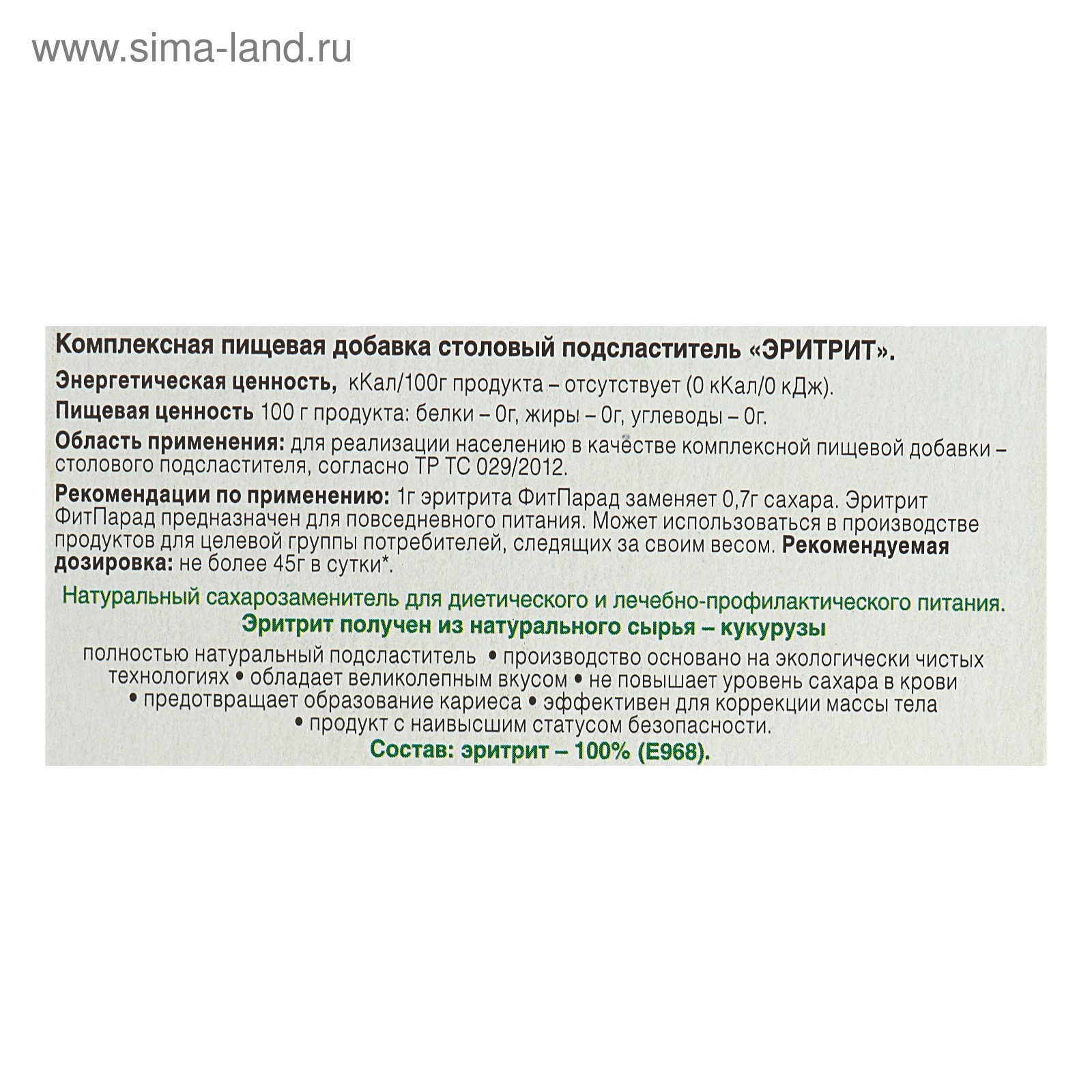 Столовый подсластитель fitparad «эритрит», 400 г. Эритрит (ERYTHRITOL, эритритол) – натуральный сахарозаменитель нового поколения. Является базовым элементом линейки сахарозаменителей ТМ «Фитпарад». Вещество представляет собой кристаллический порошок белого цвета, хорошо растворяющийся в воде, устойчивый к воздействию высоких температур и многих видов микроорганизмов, имеющий низкую гигроскопичность. Вкус эритрита подобен вкусу обычного сахара, оказывает охлаждающее действие. Сладость эритритола составляет 60-80% от сладости сахарозы. Пищевая добавка производится с помощью ферментации натурального крахмалосодержащего сырья, для чего используются некоторые виды дрожжей. Польза эритрита: является полностью натуральным продуктом, способ производства которого основан на экологически чистых технологиях;калорийность составляет 0 ккал, что позволяет использовать его при диетическом питании с целью снижения веса;не повышает уровень сахара в крови, поэтому может включаться в меню страдающих сахарным диабетом;является эффективным средством для предотвращения образования кариеса и зубного налета. Рекомендации по применению: 1 г эритрита «Фитпарад» заменяет 0, 7 г сахара. Рекомендуемая дозировка: не более 45 г в сутки. Состав: эритрит 100% (Е-968) Согласно многочисленным исследованиям, эритритол является безвредным, нетоксичным веществом для человека. Подсластитель быстро выводится из организма с мочой в неизмененном виде, не метаболизируется, не всасывается в кишечнике. Эритрит часто называют инновационным заменителем сахара XXI века благодаря большому количеству полезных свойств. Польза эритрита:является полностью натуральным продуктом, способ производства которого основан на экологически чистых технологиях;калорийность составляет 0 ккал, что позволяет использовать его при диетическом питании с целью снижения веса;не повышает уровень сахара в крови, поэтому может включаться в меню страдающих сахарным диабетом;является эффективным средством для предотвращения образования кариеса и зубного налета. Рекомендации по применению: 1 г эритрита «Фитпарад» заменяет 0, 7 г сахара. Рекомендуемая дозировка: не более 45 г в сутки. Состав: эритрит 100% (Е-968) parts count: 0 Срок годности, мес: 24 Вес, г: 400 Вид упаковки: Коробка Ароматизированные: Нет Продукты: Да Форма выпуска: Песок Вид: Натуральный  развернуть описание ▼