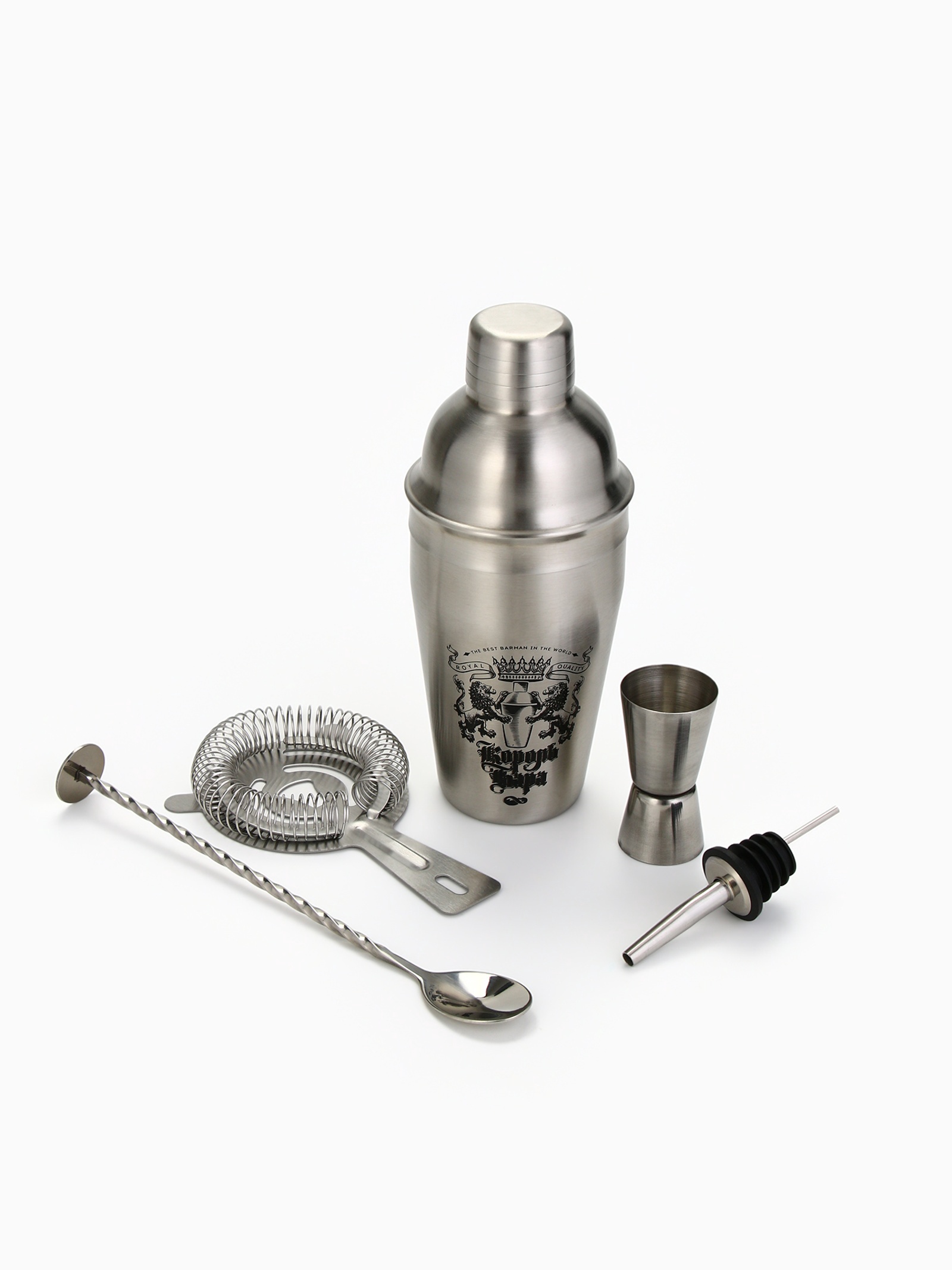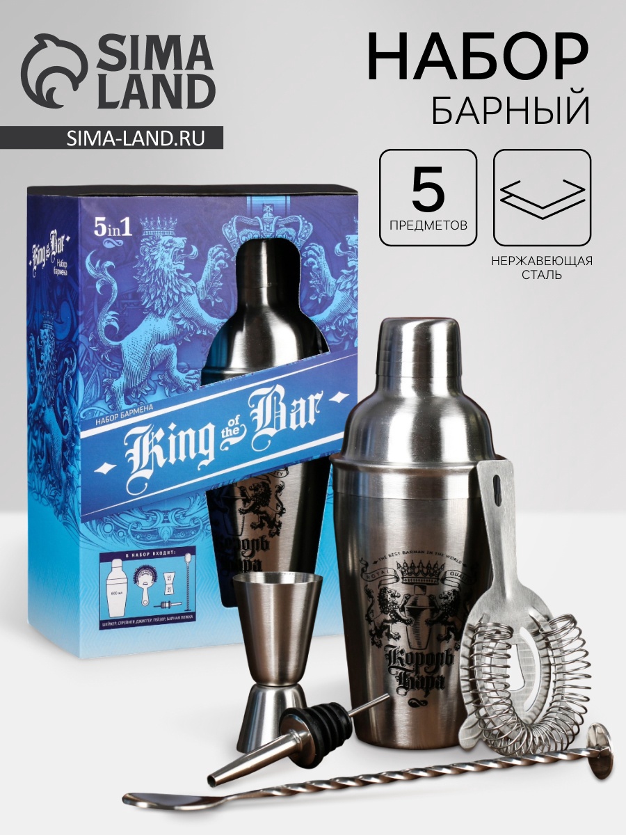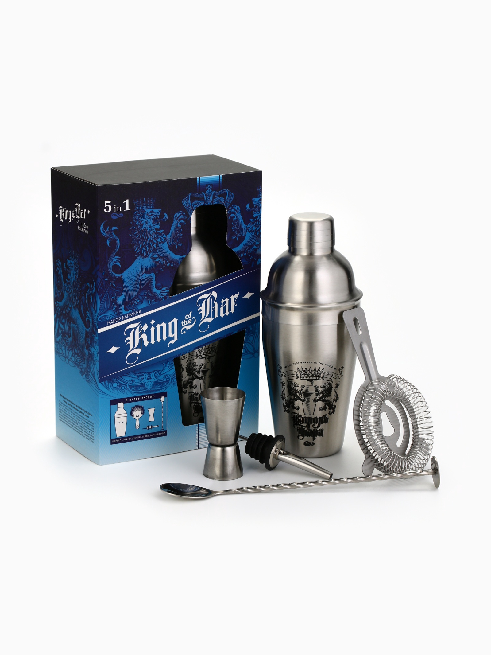 Набор для приготовления коктейлей «король бара»: 5 предметов. Составляющие набора: - Пробка-дозатор для бутылки - Мерник-джиггер для приготовления коктейлей 50/25 мл - Барная ложка - Стрейнер - Шейкер 600 мл Набор:Да|Цвет:Серебристый|Цвет:Чёрный|Для кого:Унисекс|В наборе, шт.:5|Объём, мл:600|Вид упаковки:Подарочная коробка|Рисунок:Да|Крышка:Да|Материал крышки:Нержавеющая сталь|Тематика праздника:Универсальная тематика|Тематика праздника:23 Февраля|Адресат:Без адресата|Материал:Нержавеющая сталь|Тип покрытия:Без покрытия|Составляющие набора:Ложка|Составляющие набора:Шейкер|Возраст:Для взрослых|Капсульное дно:Нет|Можно мыть в посудомоечной машине:Нет|Комплектация:Шейкер|Комплектация:Гейзер|Комплектация:Стрейнер|Комплектация:Джиггер|Комплектация:Ложка|Страна:Китай  развернуть описание ▼