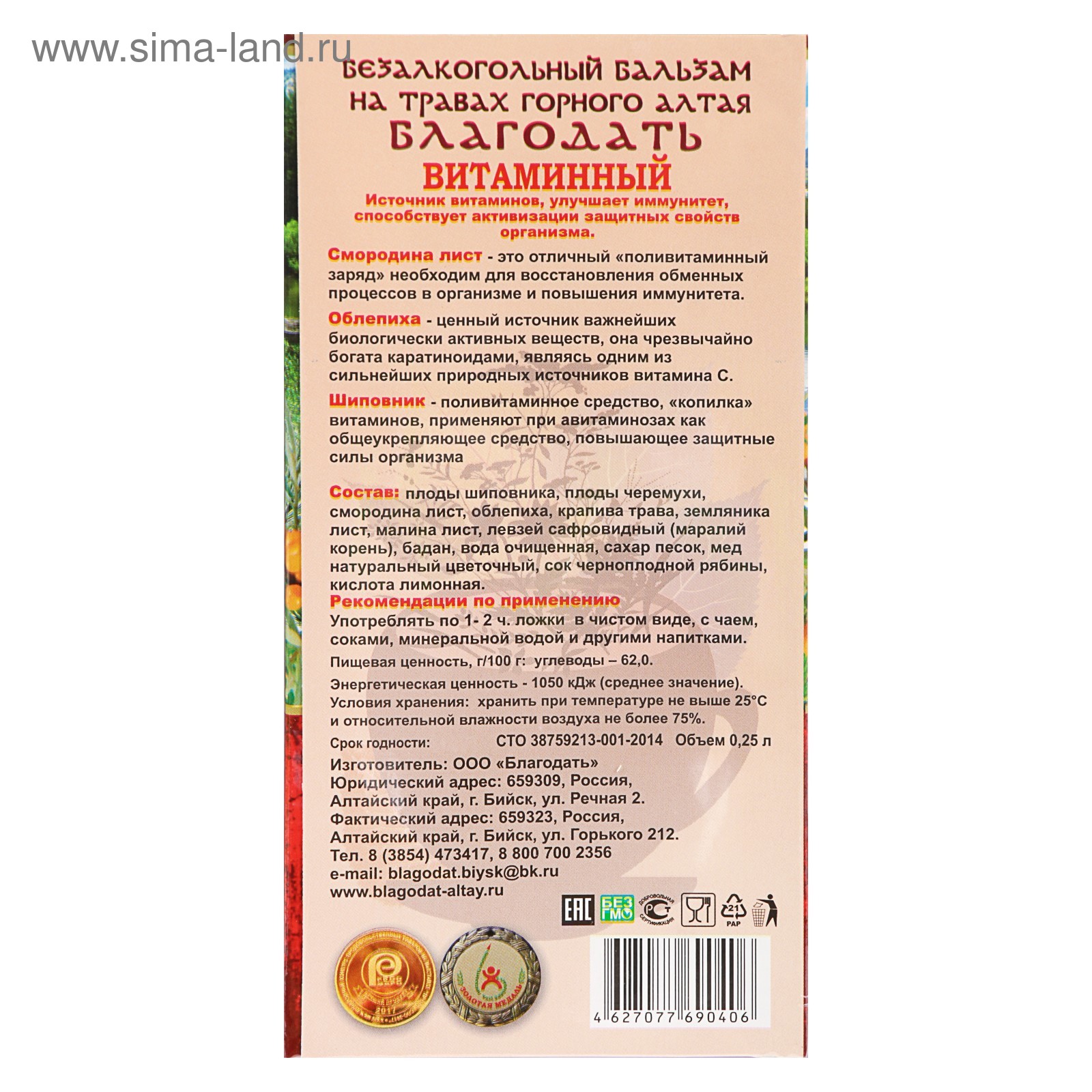 Бальзам безалкогольный "благодать" витаминный, 250 мл. Бальзам «Благодать» — это отличный поливитаминный заряд, который восстанавливает обменные процессы и повышает иммунитет. БАД содержит изобилие полезных веществ, необходимых для гармоничного развития и функционирования организма. Состав: плоды шиповника, плоды черёмухи, смородины лист, облепиха, крапивы трава, земляники лист, малины лист, левзея сафровидная (маралий корень), бадан, вода очищенная, сахар-песок, мёд натуральный цветочный, сок черноплодной рябины, кислота лимонная. Рекомендации по применению: употреблять по 1–2 ч. ложки в чистом виде либо смешивать с чаем, соком, минеральной водой, молоком и другими напитками. Срок годности, мес: 24 Вес, г/Объём, мл: 250 Вкус: Ассорти Вид: Бальзам : 0 Назначение: Для иммунной системы Для кого: Универсальный Необходимое количество флаконов на курс: 2 Группа витаминов: Витамины C Форма выпуска: Бальзам Показания: Укрепление иммунитета Компоненты: Облепиха Компоненты: Шиповник Действие: Общеукрепляющее  развернуть описание ▼