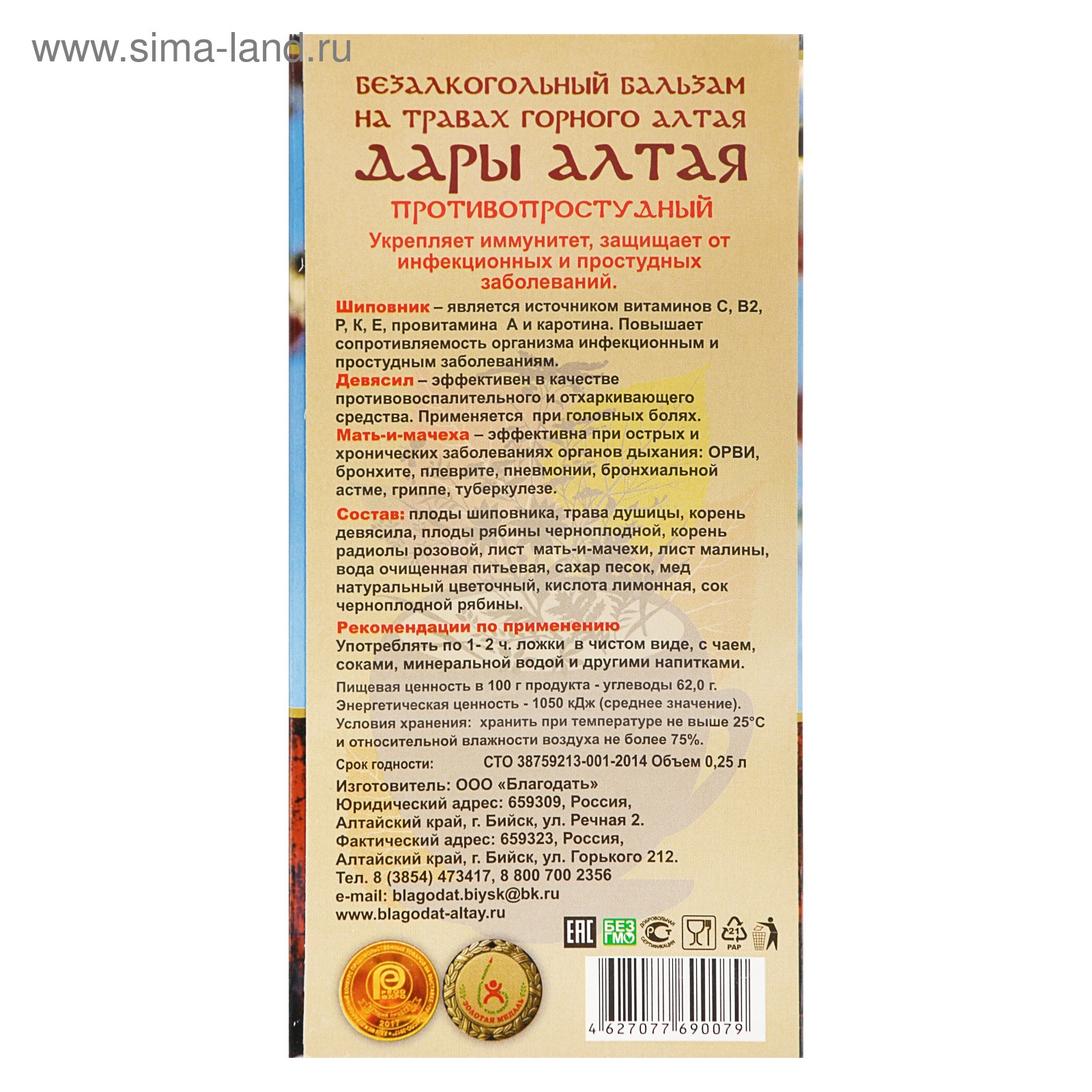 Бальзам безалкогольный "дары алтая" противопростудный, 250 мл. Безалкогольный бальзам «Дары Алтая» рекомендуется как противовоспалительное средство в период простудных заболеваний. Способствует быстрому выздоровлению и укреплению иммунной системы. Благодаря целительным свойствам мёда и трав облегчает кашель. Состав: плоды шиповника, трава душицы, корень девясила, плоды рябины черноплодной, корень родиолы розовой, лист мать-и-мачехи, лист малины, вода очищенная, сахар-песок, мёд натуральный, кислота лимонная, сок черноплодной рябины. Рекомендации по применению: употреблять по 1–2 ч. ложки в чистом виде либо смешивать с чаем, соком, минеральной водой, молоком и другими напитками. Срок годности, мес: 24 Вес, г/Объём, мл: 250 Вкус: Ассорти Вид: Бальзам Назначение: От простуды и гриппа : 0 Назначение: При простуде и гриппе Для кого: Универсальный Необходимое количество флаконов на курс: 2 Группа витаминов: Витамины B Группа витаминов: Витамины C Группа витаминов: Витамины E Группа витаминов: Витамины K Группа витаминов: Витамин P Форма выпуска: Бальзам Показания: Профилактика гриппа и простуды Показания: Простудные заболевания и грипп Показания: Простуда Компоненты: Рябина Компоненты: Шиповник Компоненты: Мёд Действие: Общеукрепляющее  развернуть описание ▼