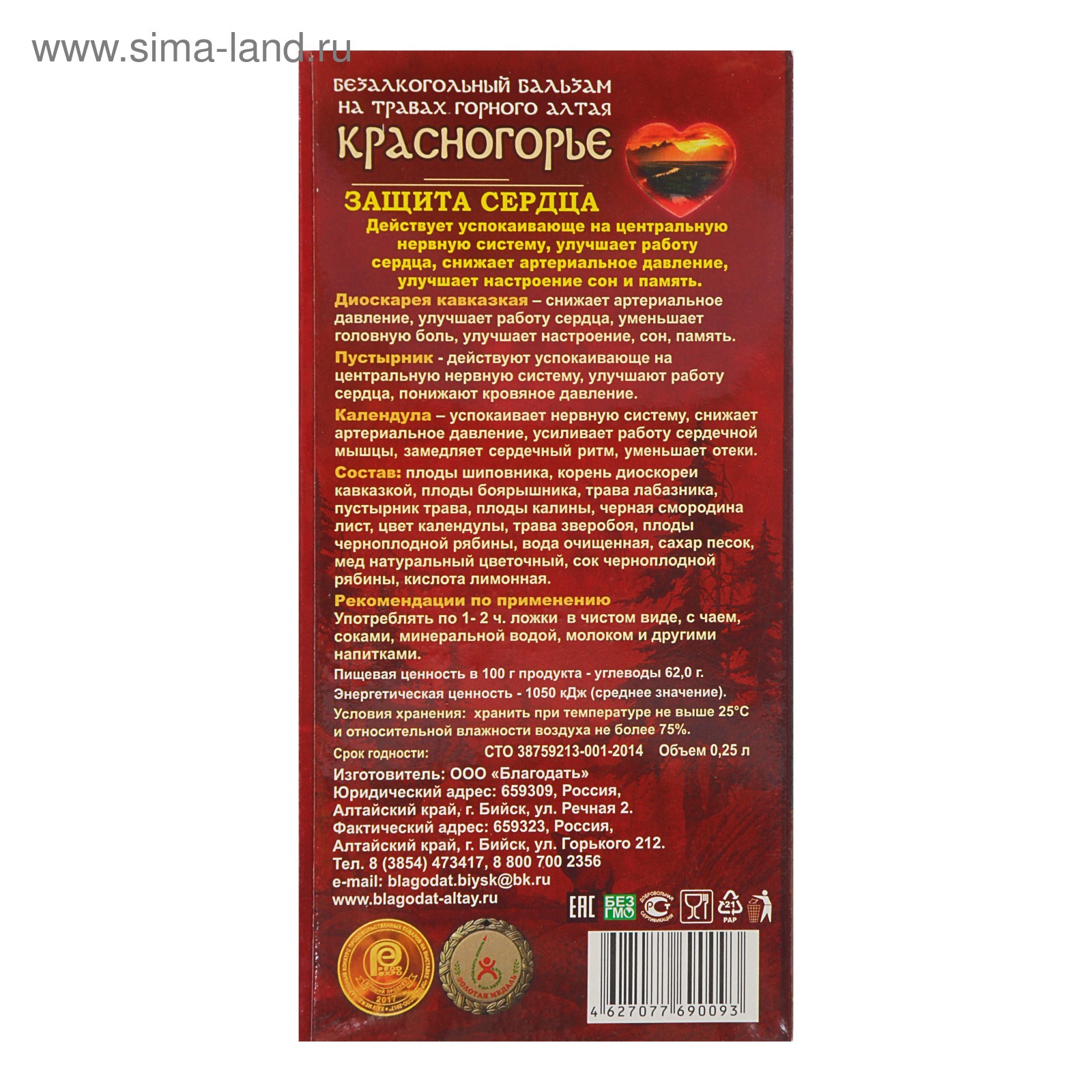 Бальзам безалкогольный "красногорье" защита сердца, 250 мл. Бальзам «Красногорье» — это натуральное природное средство, которое сделано на основе растительных компонентов. Снижает содержание холестерина в крови, нормализует артериальное давление, улучшает сон и память. В состав входит диоскорея кавказская, которая благотворно влияет на центральную нервную систему, улучшает работу сердца. Состав: плоды шиповника, корень диоскореи кавказкой, плоды боярышника, трава лабазника, трава пустырника, плоды калины, чёрной смородины лист, цветы календулы, трава зверобоя, плоды черноплодной рябины, вода очищенная, сахар-песок, мёд натуральный, кислота лимонная, сок черноплодной рябины. Рекомендации по применению: употреблять по 1–2 ч. ложки в чистом виде либо смешивать с чаем, соком, минеральной водой, молоком и другими напитками. Вес, г/Объём, мл: 250 Вид: Бальзам : 0 Назначение: Для сердца и сосудов Для кого: Универсальный Необходимое количество флаконов на курс: 2 Форма выпуска: Бальзам Показания: Укрепление сердечно-сосудистой системы Компоненты: Шиповник Компоненты: Пустырник Компоненты: Цветки календулы Действие: Общеукрепляющее Действие: Успокоительное  развернуть описание ▼