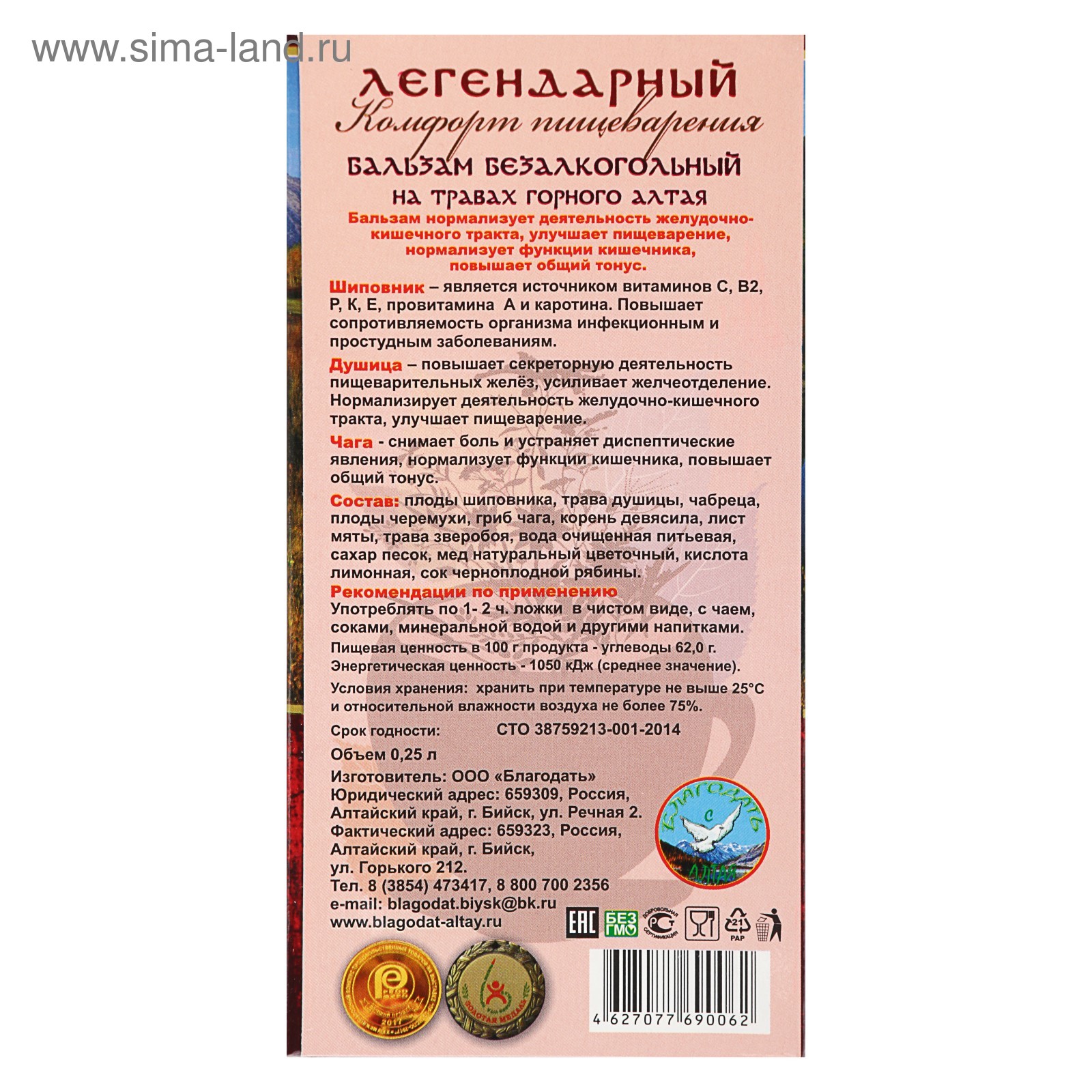 Бальзам безалкогольный «легендарный», комфорт пищеварения, с чагой, шиповником и душицей, 250 мл. Бальзам благотворно влияет на ЖКТ и восстанавливает процесс пищеварения, улучшает секреторную деятельность желудка и кишечника. Состав: плоды шиповника, трава душицы, трава чабреца, плоды черемухи, гриб чага, корень девясила, лист мяты, трава зверобоя, вода очищенная, сахар-песок, мёд натуральный, кислота лимонная, сок черноплодной рябины. Применение: употреблять по 1–2 ч. ложки в чистом виде либо добавлять в чай, сок, минеральную воду, молоко и другие напитки. Вес, г/Объём, мл: 250 Вид: Бальзам : 0 Назначение: Для желудка и кишечника Для кого: Универсальный Необходимое количество флаконов на курс: 2 Форма выпуска: Бальзам Показания: Нормализация функций ЖКТ Показания: Укрепление иммунитета Компоненты: Шиповник Компоненты: Чага Компоненты: Душица Действие: Общеукрепляющее  развернуть описание ▼