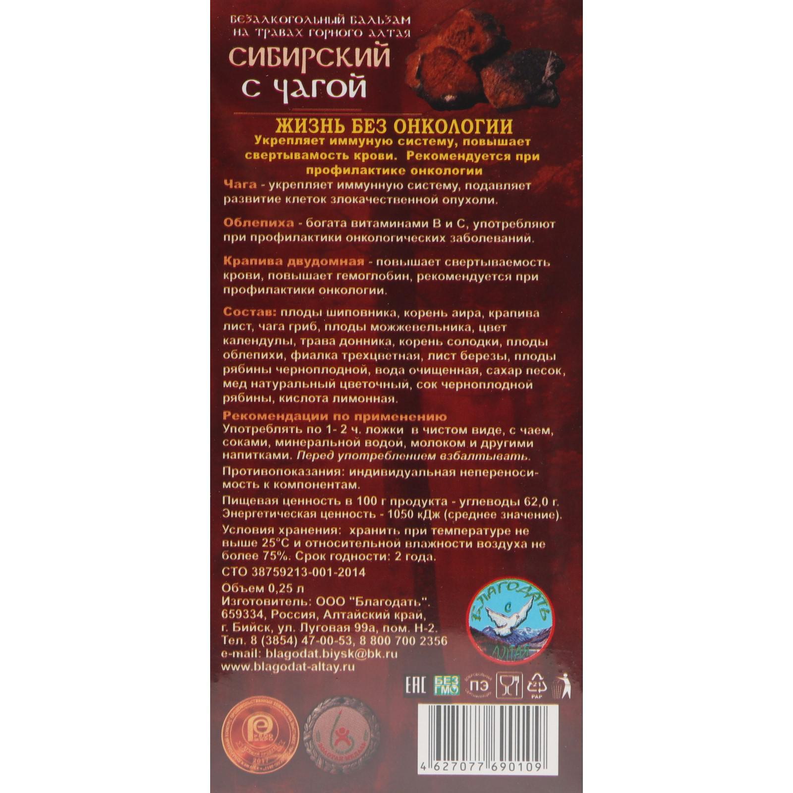 Бальзам безалкогольный "сибирский" жизнь без онкологии, 250 мл. Бальзам укрепляет иммунную систему, повышает свёртываемость крови, рекомендуется для профилактики онкологии. Состав: плоды шиповника, корень аира, крапивы лист, чаги гриб, плоды можжевельника, цветы календулы, трава донника, корень солодки, плоды облепихи, фиалка трёхцветная, лист берёзы, плоды рябины черноплодной, вода очищенная, сахар-песок, мёд натуральный, кислота лимонная, сок черноплодной рябины. Рекомендации по применению: употреблять по 1–2 ч. ложки в чистом виде либо смешивать с чаем, соком, минеральной водой, молоком и другими напитками. Вес, г/Объём, мл: 250 Вид: Бальзам : 0 Назначение: Для иммунной системы Для кого: Универсальный Необходимое количество флаконов на курс: 2 Группа витаминов: Витамины B Группа витаминов: Витамины C Форма выпуска: Бальзам Показания: Укрепление иммунитета Показания: Онкологические заболевания Компоненты: Чага Компоненты: Облепиха Компоненты: Крапива Действие: Общеукрепляющее  развернуть описание ▼