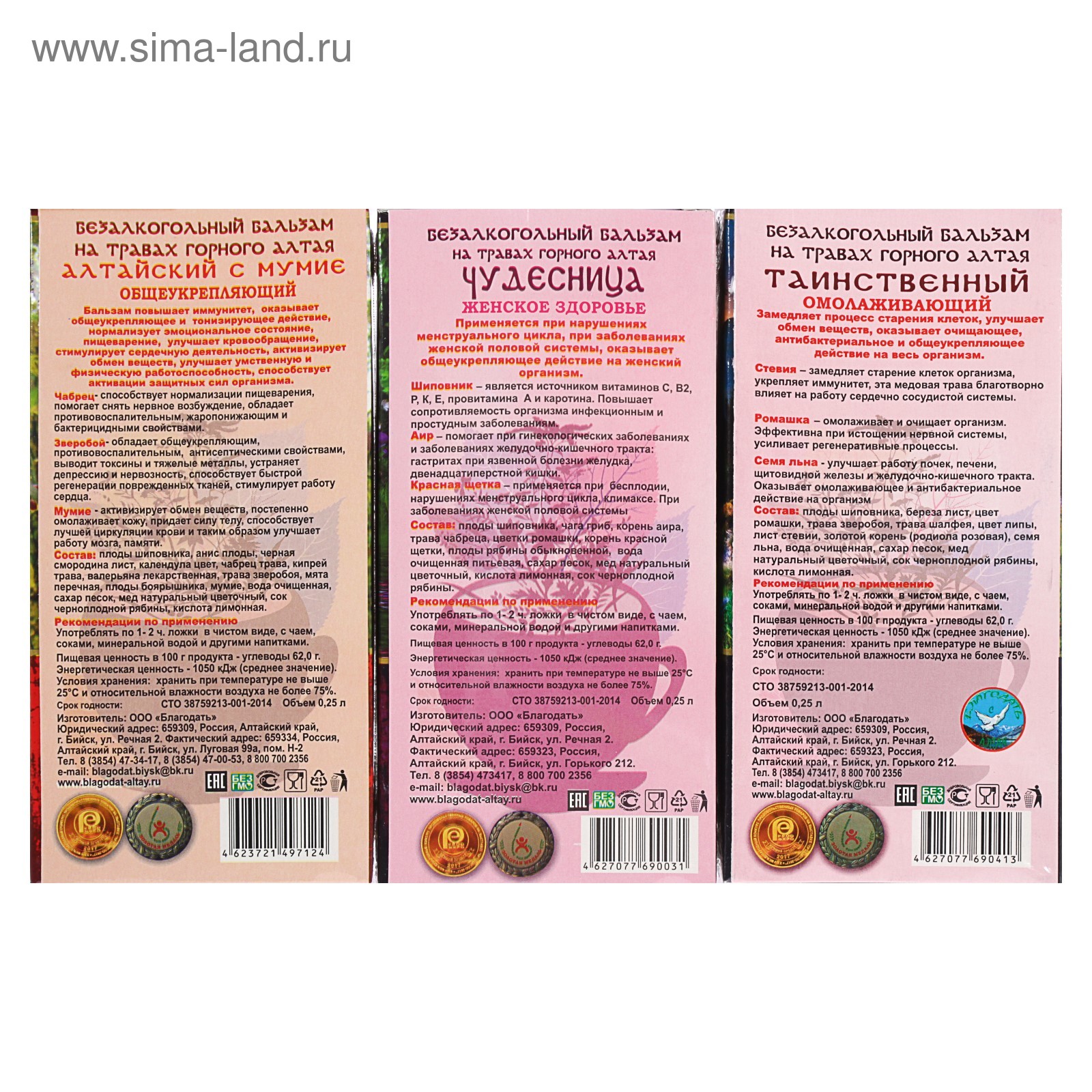 Подарочный набор «сундук», женское здоровье: 3 безалкогольных бальзама. В наборе 3 безалкогольных бальзама по 0, 25 л: «Чудесница», «Таинственный», «Здравушка». Бальзам «Чудесница» применяется при нарушениях менструального цикла как общеукрепляющее средство для женского организма. Бальзам «Таинственный» замедляет старение клеток, очищает организм. Бальзам «Здравушка» — эффективное противовоспалительное средство, обладает противоопухолевым действием, улучшает общее состояние женского организма, способствует рассасыванию уплотнений тканей молочных желёз. Состав: безалкогольный бальзам "Чудесница", безалкогольный бальзам "Алтайский", безалкогольный, бальзам "Таинственный". Применение: принимать по 1-2 чайной ложке в чистом виде, с чаем, соками, минеральной водой и другими напитками. Срок годность: 24 месяца. Для кого: Для женщины Вес, г/Объём, мл: 250 Вес, г/Объём, мл: 750 Назначение: Для женского здоровья Назначение: Для женского здоровья Для кого: Для женщин Необходимое количество флаконов на курс: 2 Форма выпуска: Бальзам Действующие вещества: Экстракт Показания: Укрепление сердечно-сосудистой системы Показания: Укрепление иммунитета Показания: Нарушения менструального цикла Показания: Нарушения переваривания пищи Показания: Нормализация функций ЖКТ Компоненты: Зверобой Компоненты: Ромашка Компоненты: Шиповник Действие: Антибактериальные Действие: Успокоительное Действие: Противовоспалительные Действие: Жаропонижающие  развернуть описание ▼