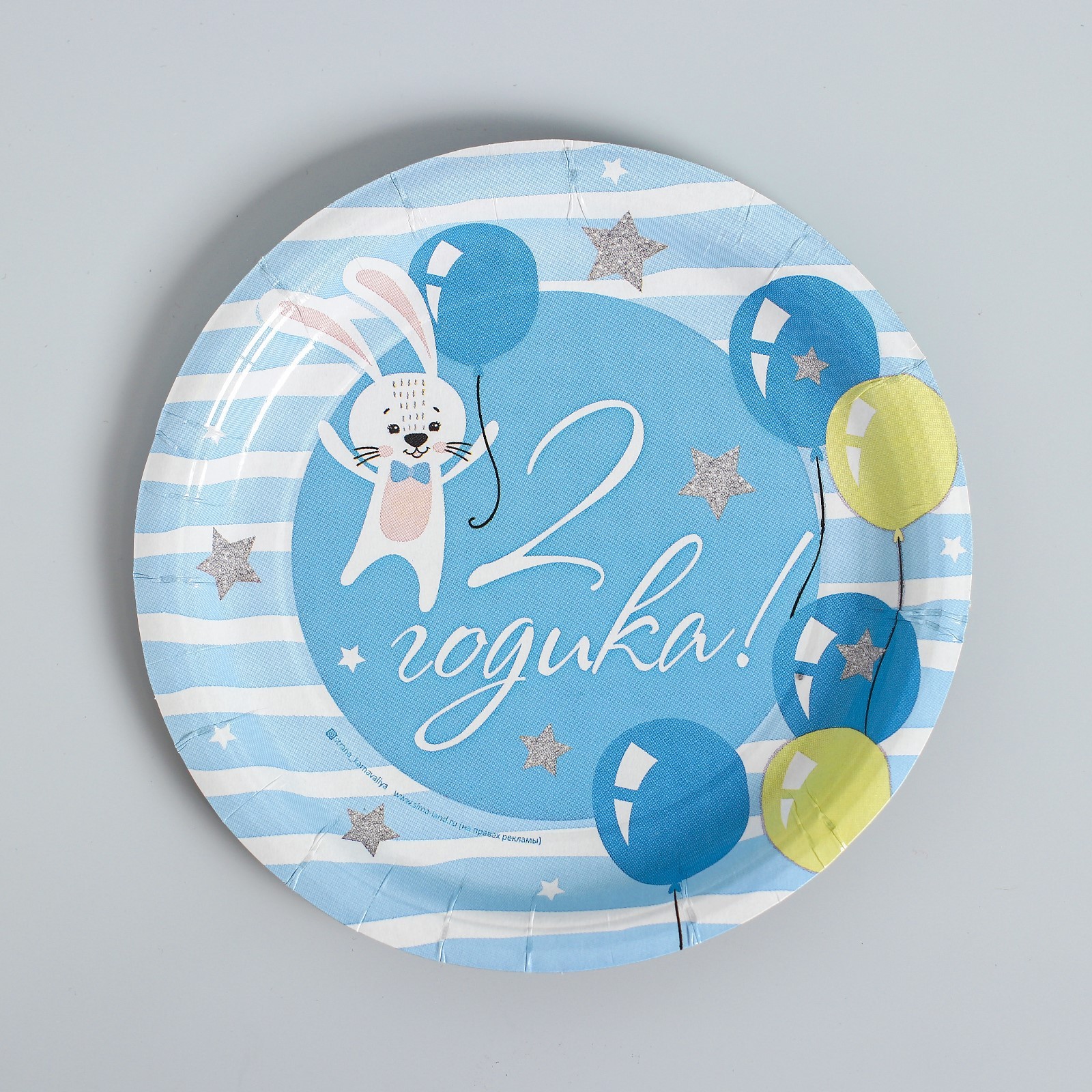 Набор бумажной посуды одноразовый с днём рождения. 2 годика», 6 тарелок, 6 стаканов, 6 колпаков, 1 гирлянда, цвет голубой