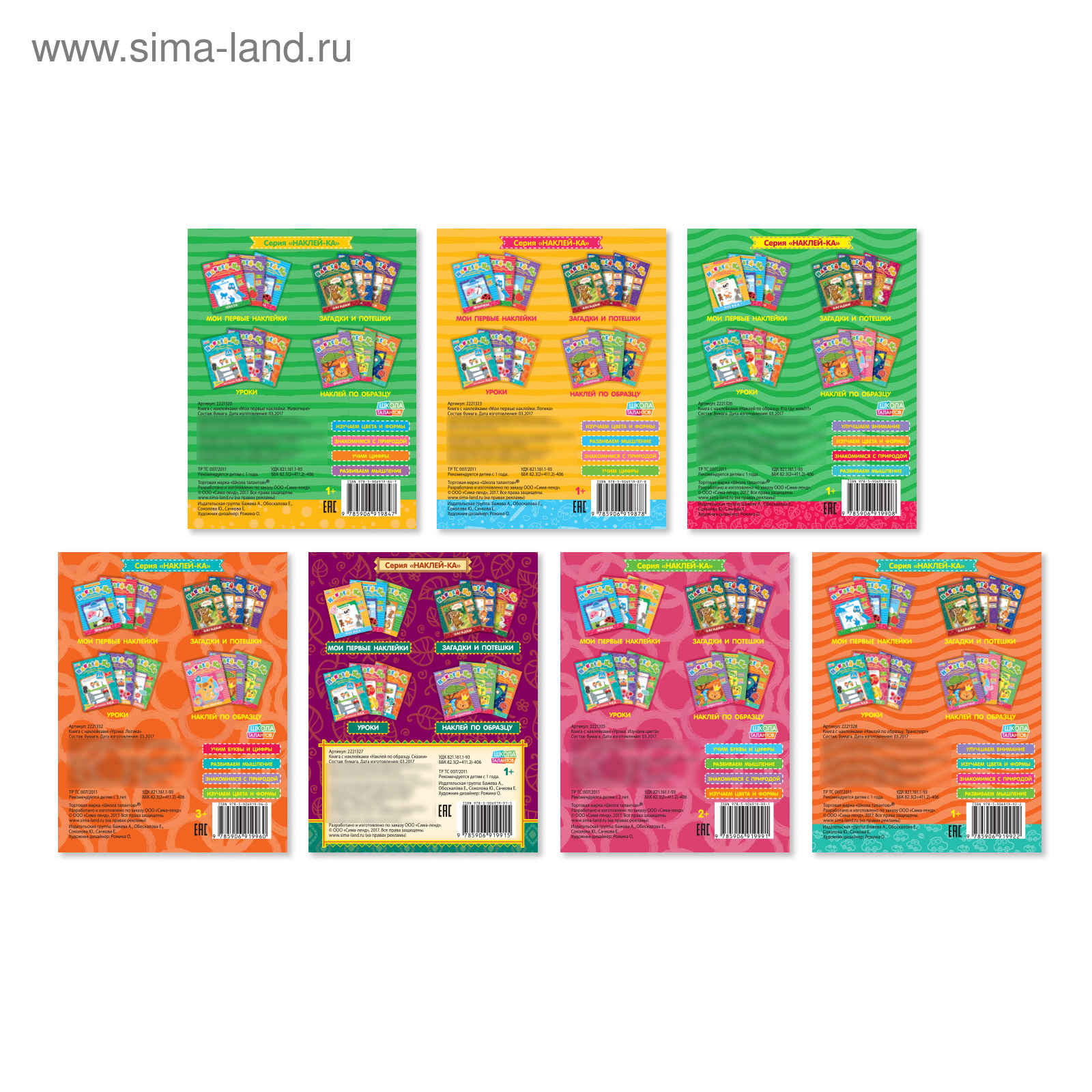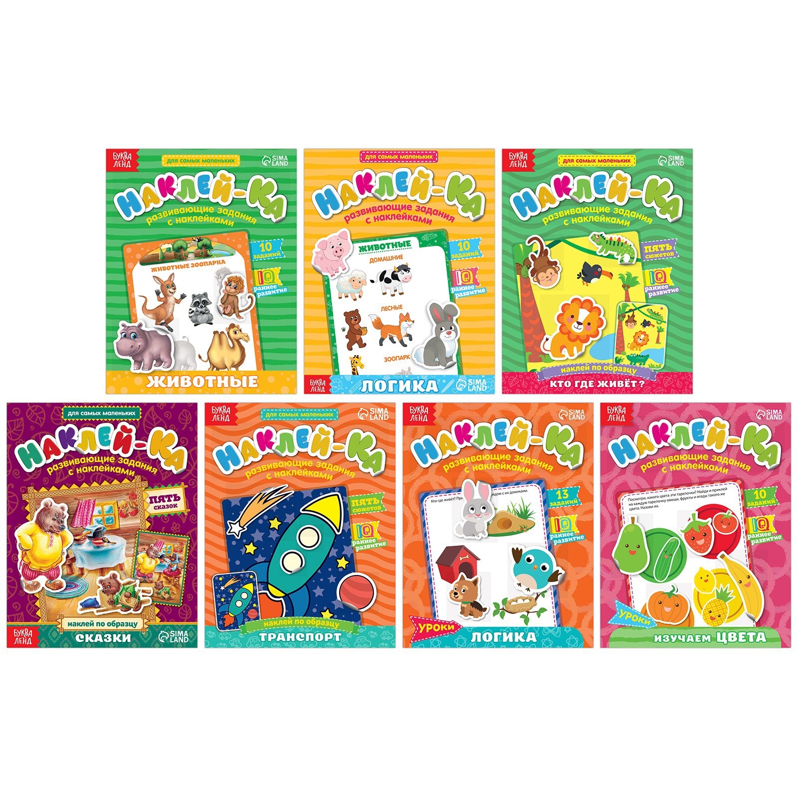 Книги с наклейками «наклей-ка», набор 7 шт. по 12 стр.. 3899739Набор обучающих книг с наклейками создан специально для любознательных малышей. Удобный формат В книгах вы найдёте увлекательные задания на логику, запоминание, внимание, знакомство с цветами, видами транспорта и животными, а ещё — сказки.Яркие наклейки выполнены на плотной бумаге, хорошо отклеиваются и не рвутся.С крупными стикерами удобно работать малышам, которые ещё только осваивают этот вид творчества.Чем полезны занятия с наклейками Такой вид творчества позволяет детям развивать мелкую моторику, пространственное и логическое мышление, а также тренировать усидчивость и аккуратность. Набор:Да|Для кого:Унисекс|Формат:А5-|Возраст:От 1 года|Количество страниц:12|Год издания:2017|Тематика:Овощи|Тематика:Сказки|Тематика:Транспорт|Тематика:Животный мир|Тематика:Фрукты|Тематика праздника:Универсальная тематика|Развитие навыков:Кругозор|Развитие навыков:Логика|Развитие навыков:Фигуры, цвета|Вид наклейки:Без особенностей|Язык издания:Русский|Тип обложки:Мягкий переплёт|Автор:Соколова Юлия Сергеевна|Автор:Сачкова Евгения Камилевна|Страна:Китай  развернуть описание ▼