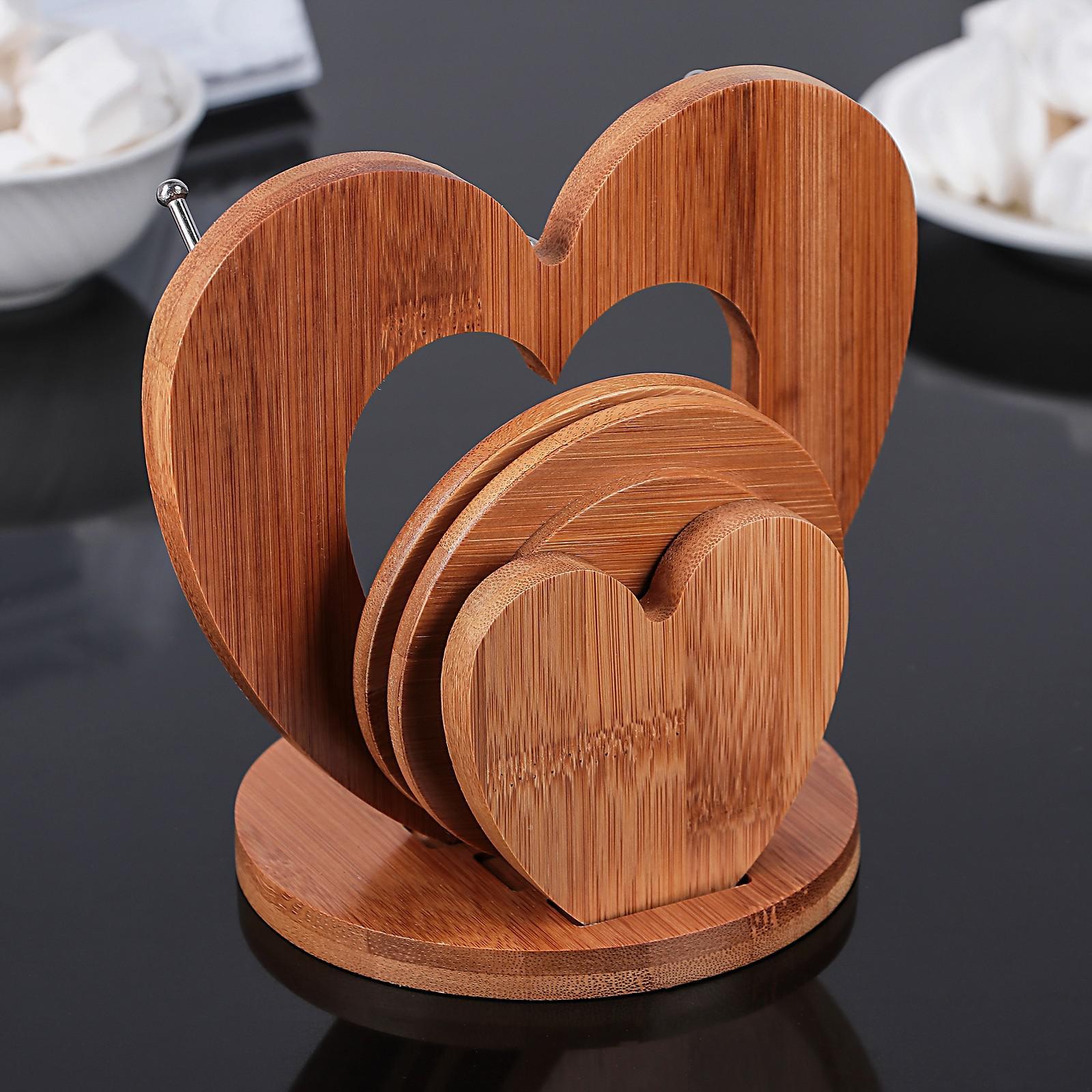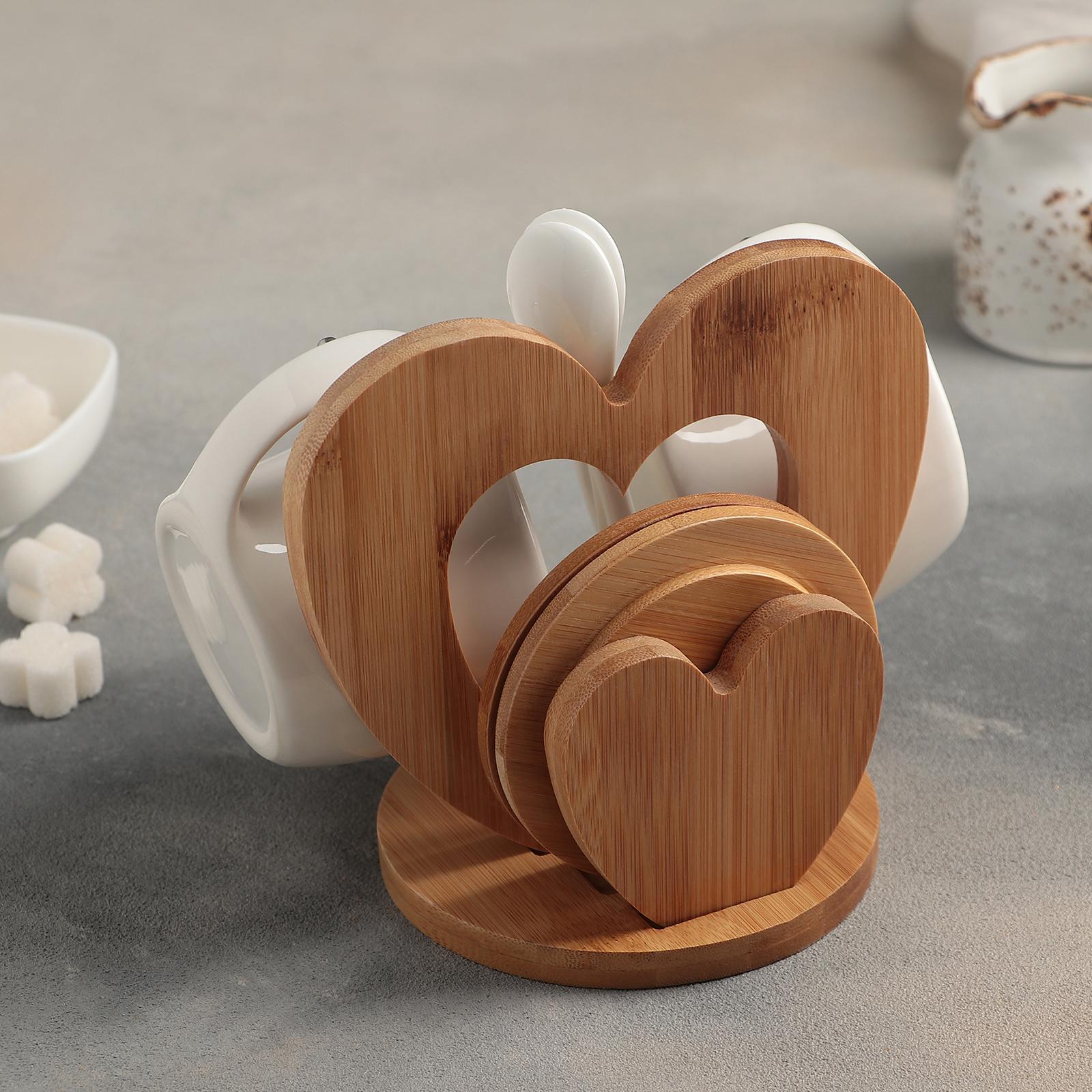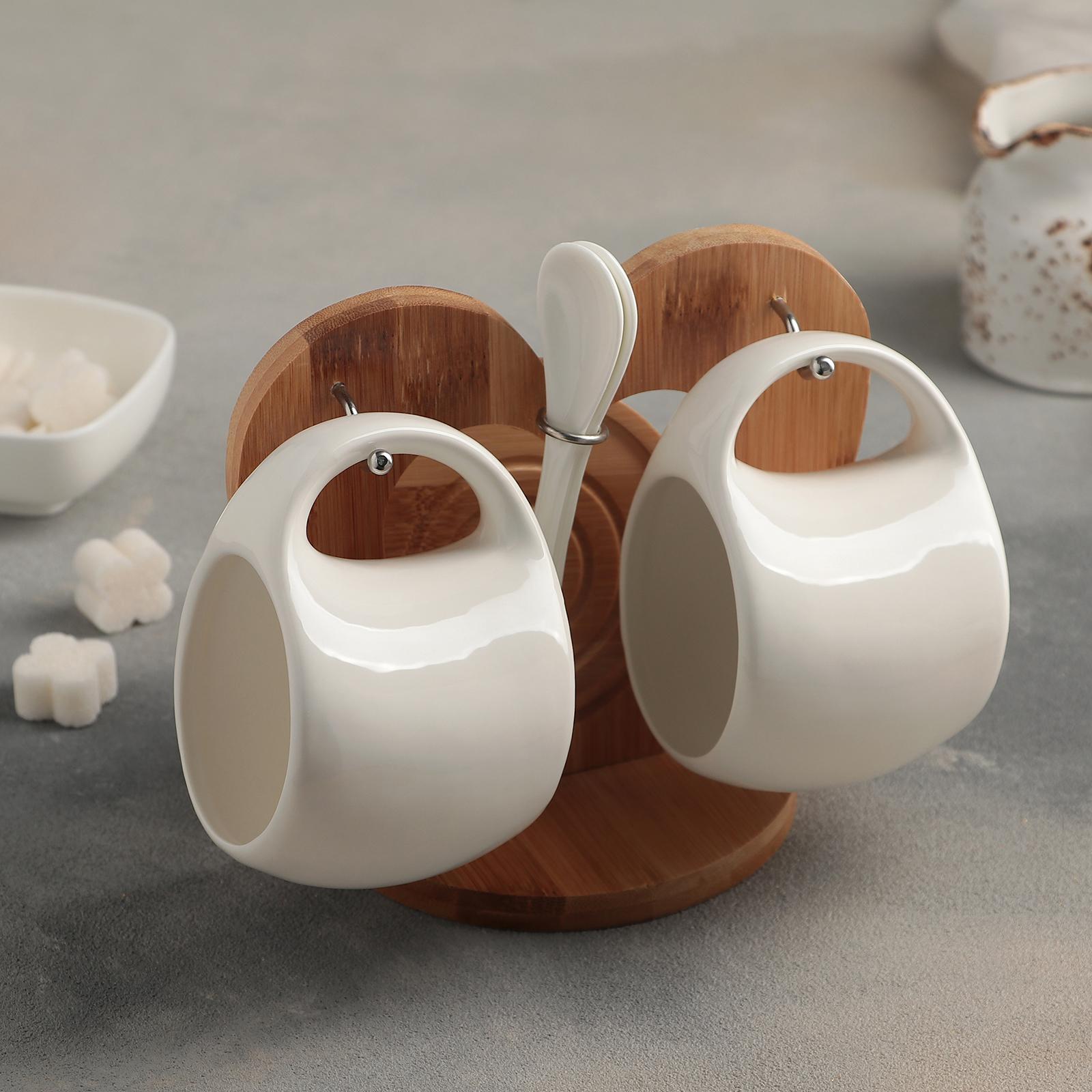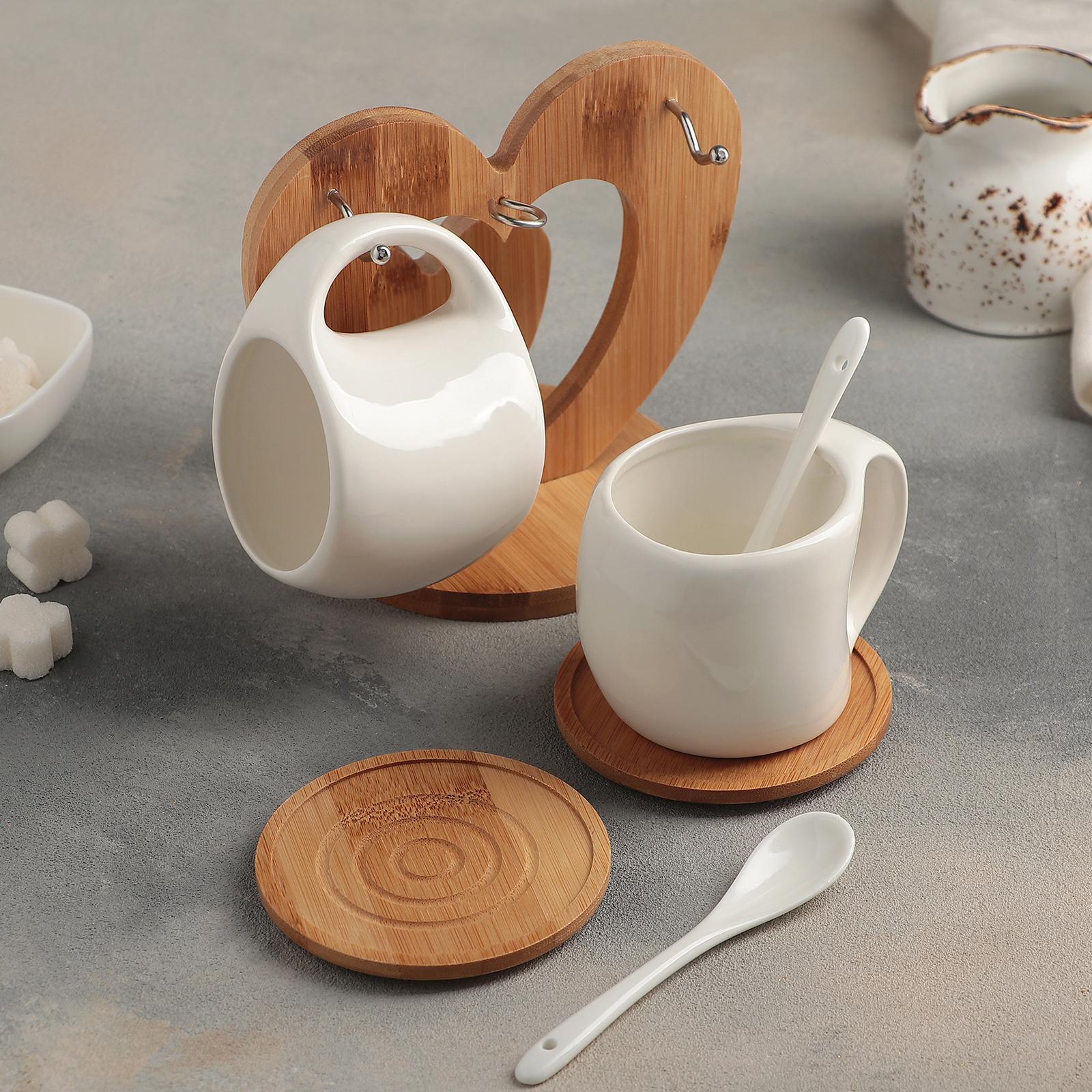 Набор чайный керамический на деревянной подставке «эстет», 6 предметов: 2 чашки 200 мл, 2 подставки 9,5 см, 2 ложки, цвет белый