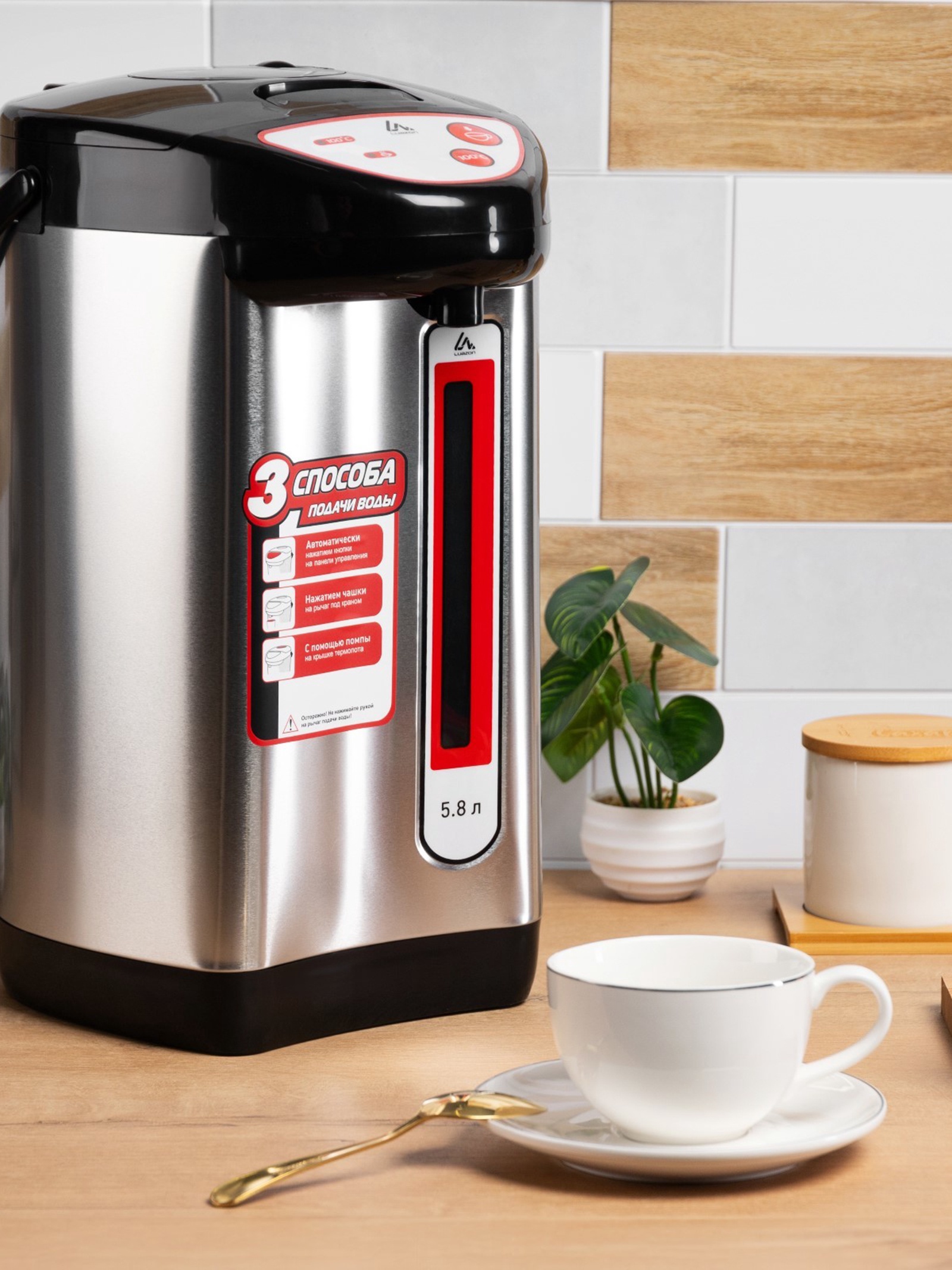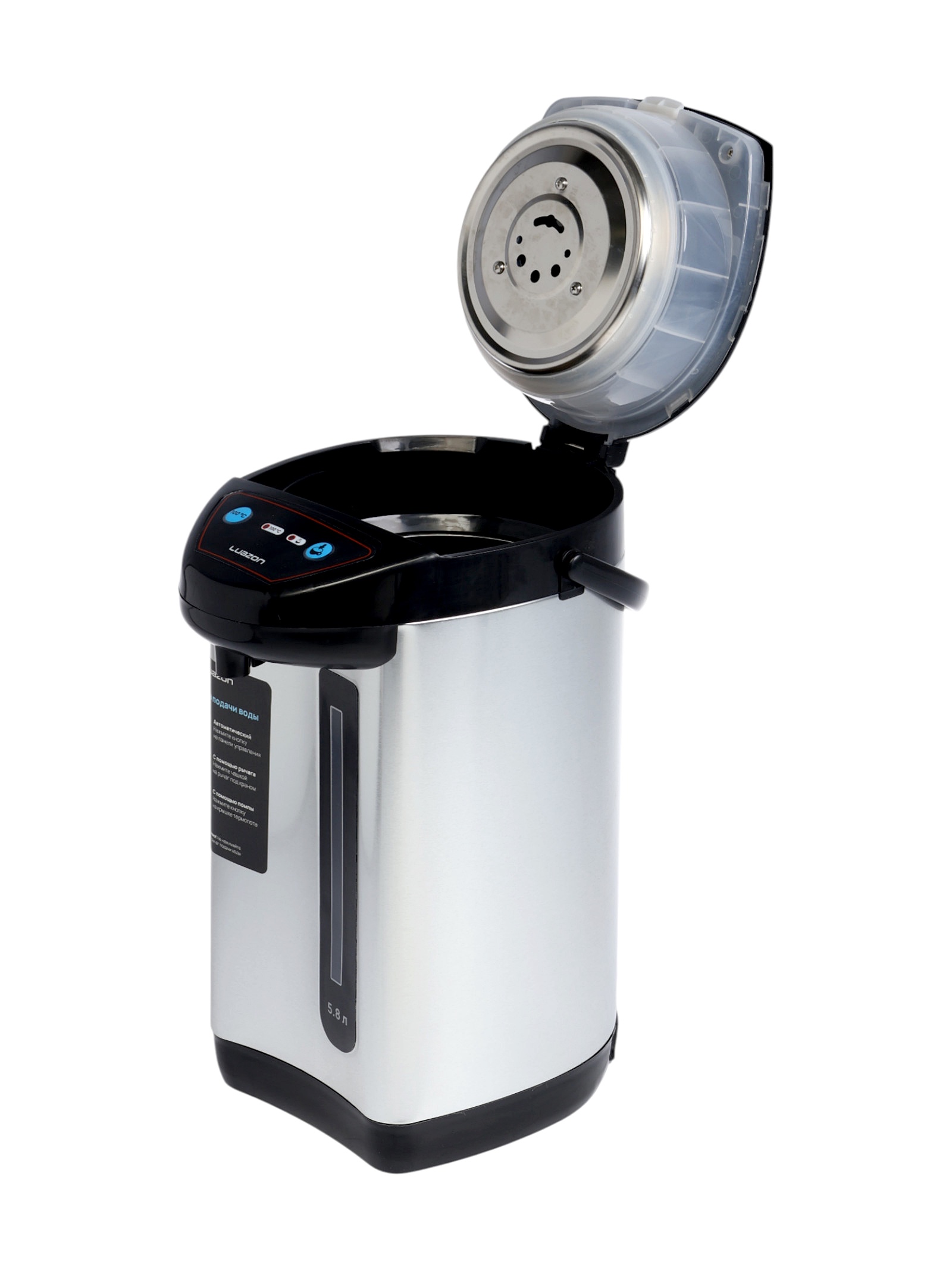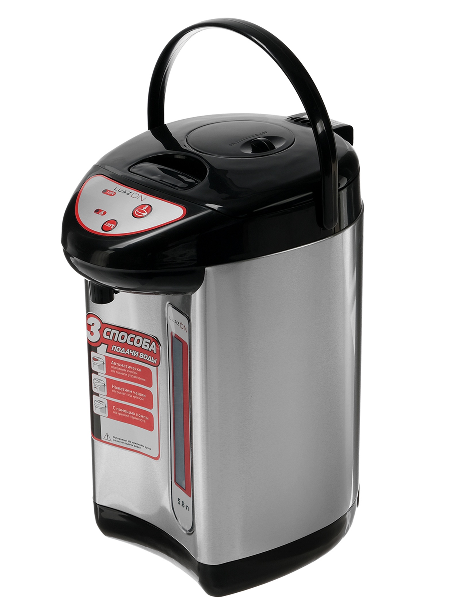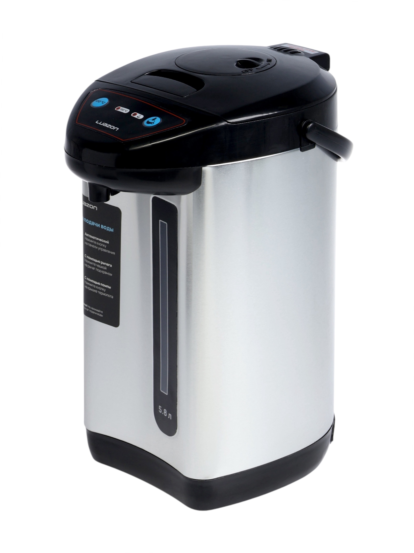 Термопот luazon let-5001, 5.8 л, 3 способа подачи воды, поддержка температуры, 750 вт. Обеспечьте себя постоянным источником горячей кипяченой воды с нашим термопотом Luazon LET-5001. Он представляет собой гибрид чайника и термоса: благодаря высокой мощности в 750 Вт устройство быстро кипятит воду, а после поддерживает температуру напитка 50 °С. Термопот вмещает 5,8 л воды, такого количества хватит на целый день для семьи из 4-х человек. Простая панель управления делает термпот понятным устройством даже для детей. Кнопка «100°» обозначает повторное кипячение, если вам необходимо будет выпить чашечку чая, а кнопка с кружкой отвечает за подачу воды. Также рядом с кнопками есть два индикатора кипячения и поддержания температуры. У термопота есть 3 способа подачи воды. Самый простой - это нажать кнопку на панели управления, также вы можете нажать на помпу или поднести кружку к крану, чтобы сразу налить воды. Цвет:Серый|Мощность, Вт:750|Объём, л:5.8|Гарантийный срок, мес.:12|Материал корпуса:Металл|Защита от перегрева:Нет|Регулировка температуры:Нет|Индикатор уровня воды:Да|Поддержание температуры:Да|Защита от включения без воды:Нет|Повторное кипячение:Да|Беспроводное использование:Нет|Страна:Китай  развернуть описание ▼
