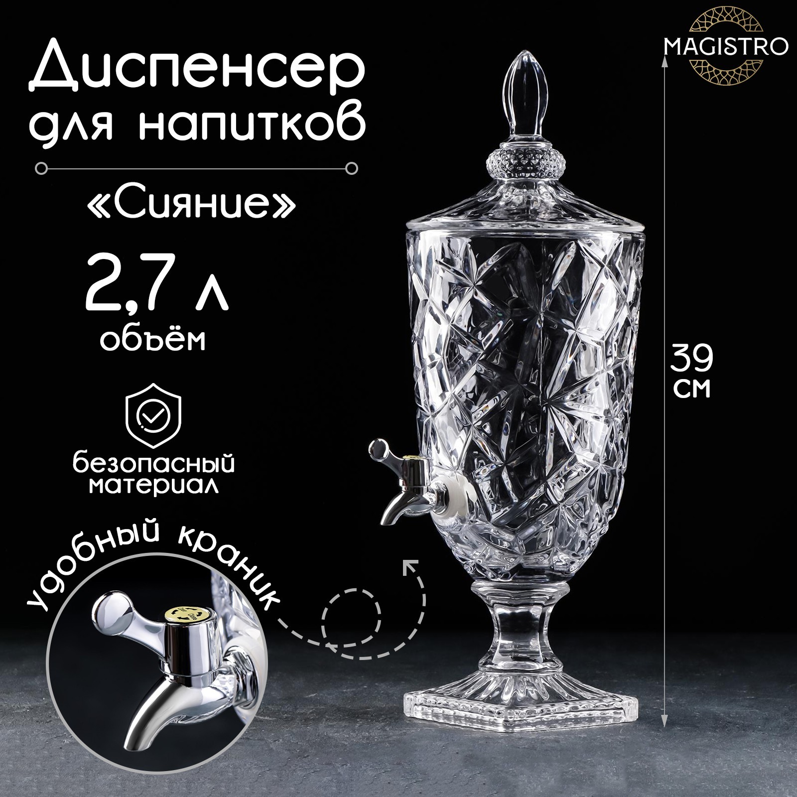 Диспенсер для напитков стеклянный Magistro «сияние», 2,7 л, 17x50 см