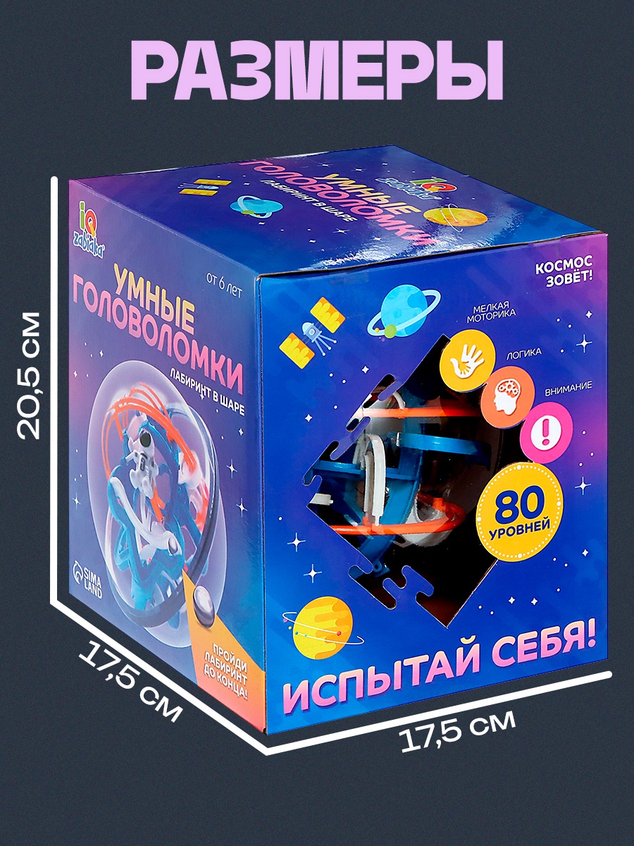 Шар-головоломка «космос», лабиринт, 80 уровней. Задачка для настоящих гениев! Испытайте себя в игре-головоломке «Космос»: преодолейте 80 уровней с лабиринтами и доведите металлический шарик до финиша. Как игратьx Поставьте шарик на стартовую позицию.Медленно поворачивайте, крутите, наклоняйте головоломку и следите за тем, чтобы металлический шарик всегда оставался на горизонтальной поверхности.Будьте предельно внимательны, и тогда вы без труда достигнете финиша!Используйте все варианты игры и соревнуйтесь в скорости и точности прохождения головоломки. Игра на время Побеждает тот, кто за установленное время первым достигнет цели. Если ни один участник не смог полностью пройти лабиринт, побеждает тот, кто преодолел наибольшее количество уровней. Свободная игра Выигрывает тот, кто первым достигнет цели. Подсчёт падений Если во время игры шарик упадёт с дорожек 3 раза, участник выбывает из состязания. Правильное развитие Необычная головоломка — это тренажёр для развития логического мышления, координации движений и мелкой моторики. Понадобится ловкость, терпение и смекалка, чтобы пройти все испытания до конца! Для детей старше 6 лет. Для кого:Для мальчика|Возраст:От 6 лет|Материал:Металл|Материал:Пластик|Сложность головоломки:5|Страна:Китай  развернуть описание ▼