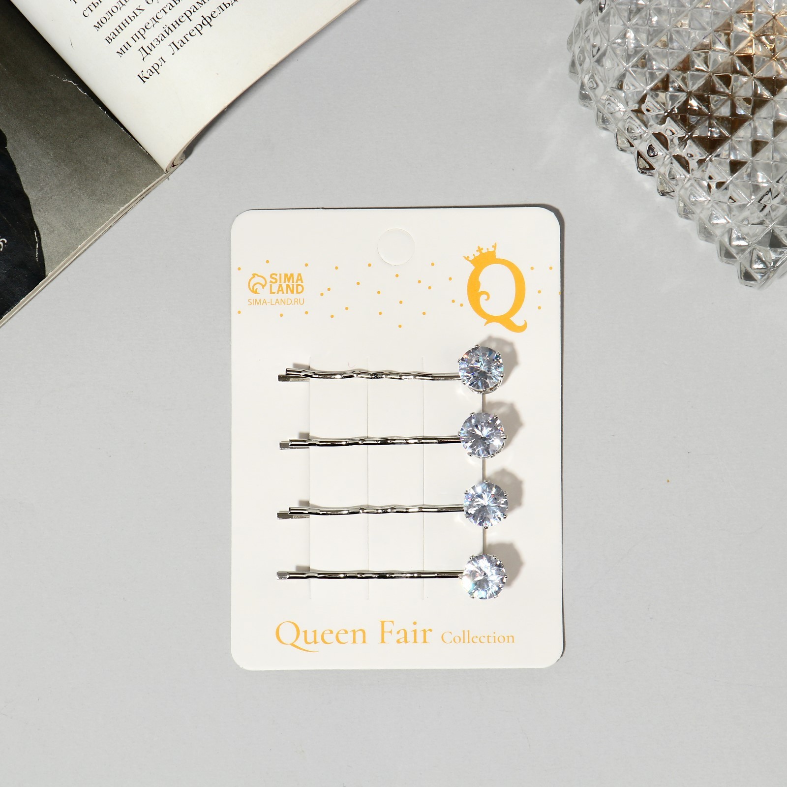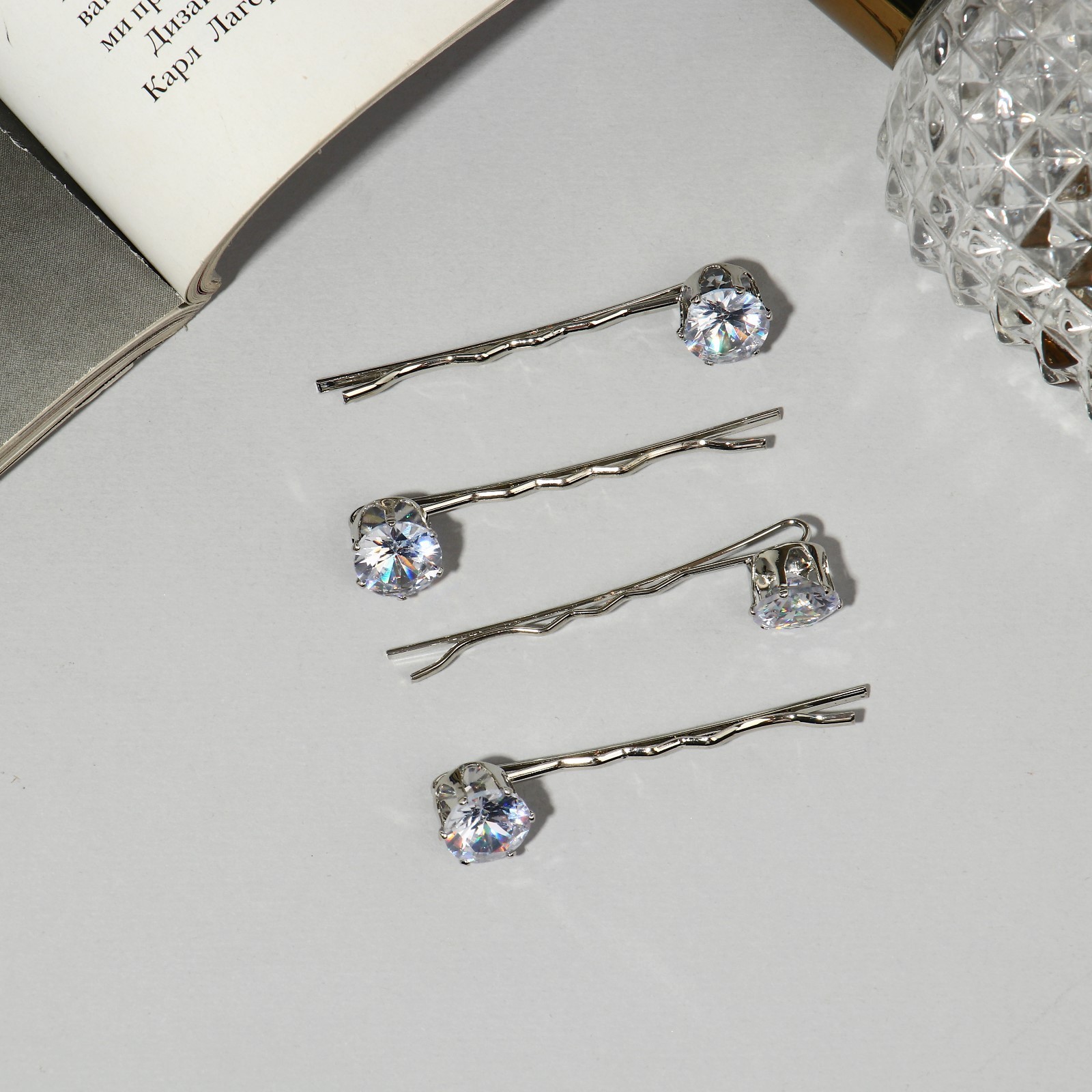 Невидимки для волос «кварта», набор 4 шт., круглые стразы, 5.5 см, серебро