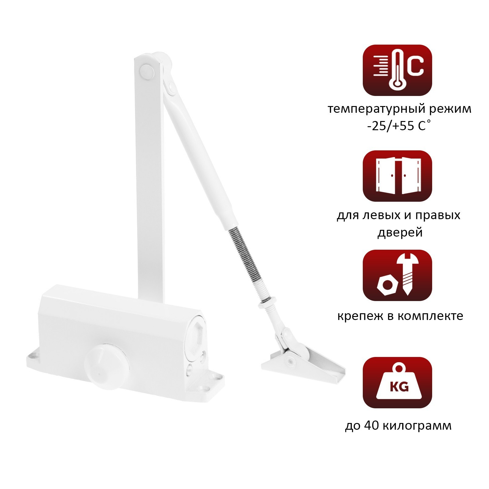 Доводчик дверной тундра d=40ww, до 40 кг, белый. Особенности Вес дверного полотна - 40 кг.Ширина дверного полотна 850 мм.Тип установки - универсальный, подходит как для левых, так и для правых дверей.Рабочая температура: -35/+60 °С.Посадочные размеры: 126х19 мм.Усилие: EN2 (EN1154).Гарантия - 1 год, при условии соблюдения правил установки, настройки и эксплуатации доводчика.Гарантийный срок, мес.:6|Максимальная масса двери, кг:30|Максимальная масса двери, кг:35|Максимальная масса двери, кг:40|Максимальная ширина двери, мм:850|Фиксатор:Нет|Морозостойкость:Да|Цвет:Белый|Тип тяги:Рычажная|Монтажный размер:134 х 21|Класс доводчика:EN2|Морозостойкость до, °С:-25|Монтаж:Верхний|Страна:Китай  развернуть описание ▼