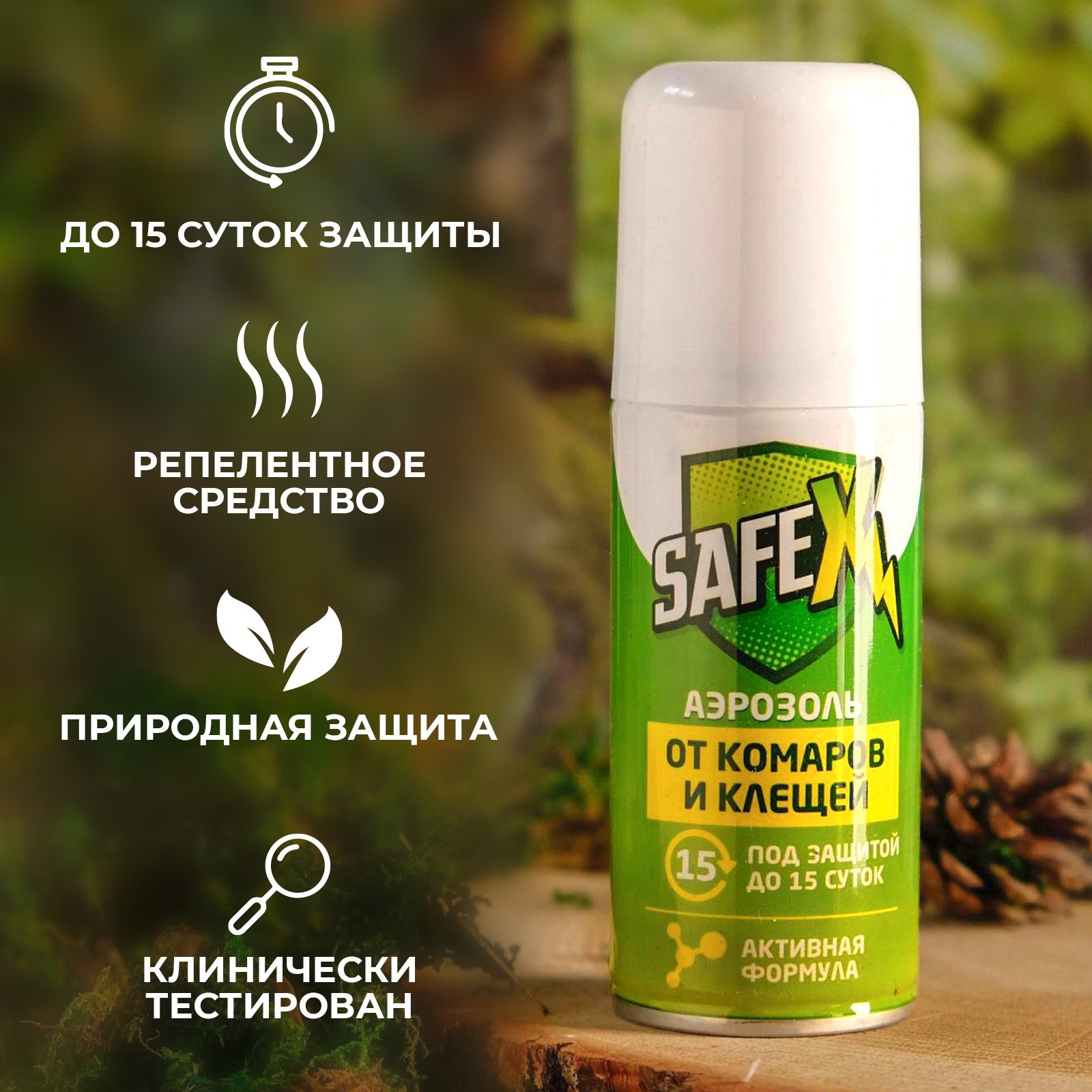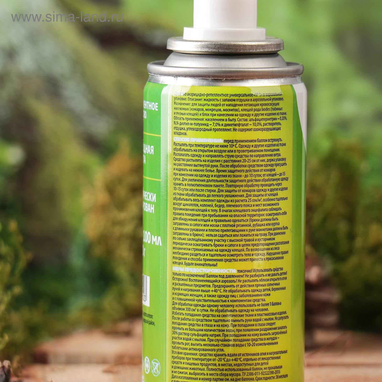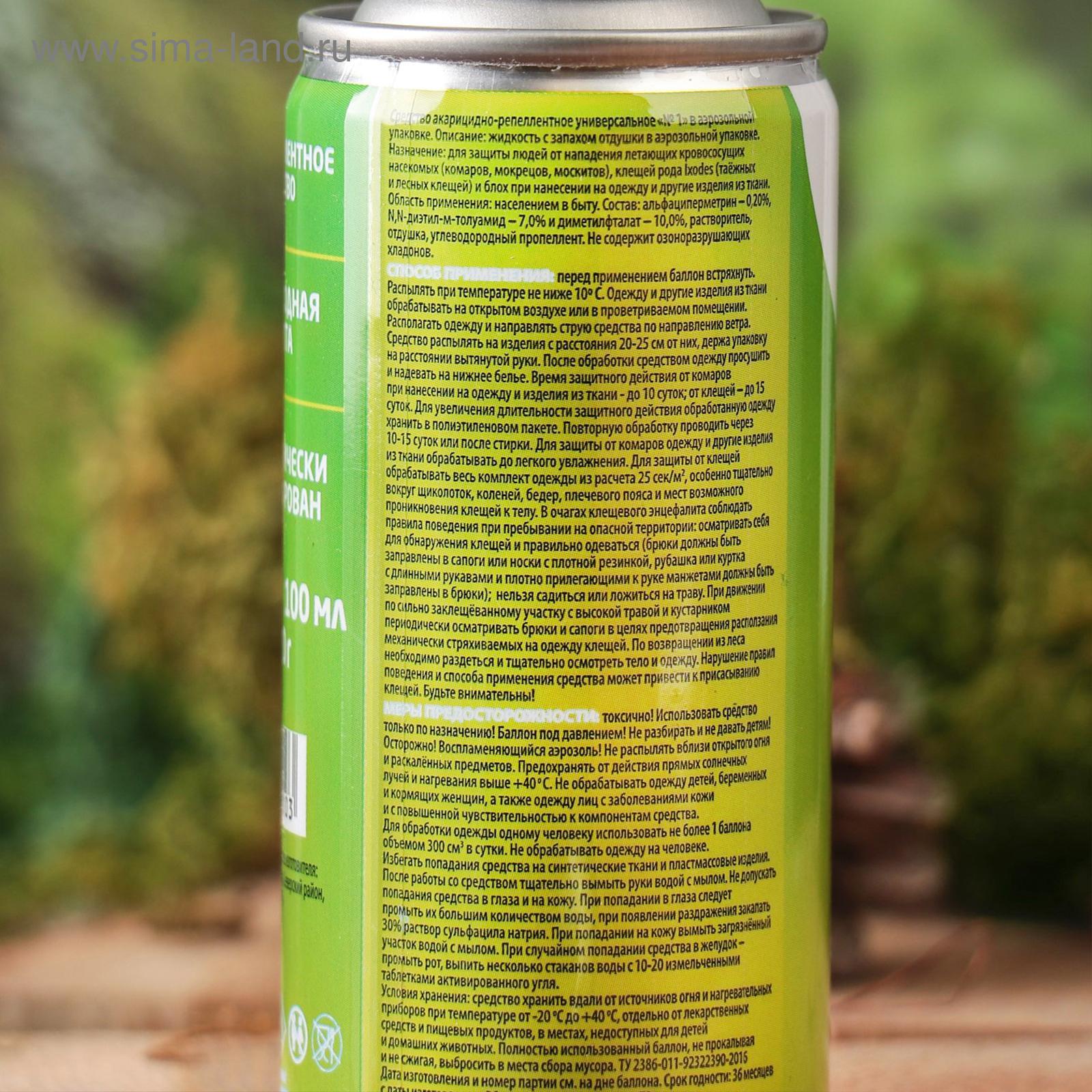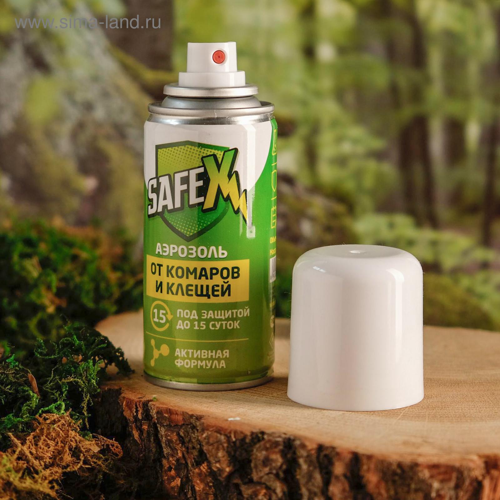 Аэрозоль от клещей и комаров safex, 100 мл. ОписаниеСредство инсектоакарицидно-репеллентное "Клещ-капут спрей". Для защиты людей от иксодовых клещей и блох (переносчиков возбудителей опасных заболеваний человека), а также от летающих кровососущих насекомых (комаров, мокрецов, москитов) при обработке одежды и других изделий из ткани. Применение: обрабатывать одежду на открытом воздухе (вне помещений). Располагать одежду и направлять струю средства по направлению ветра, средство распылять на изделия с расстояния 20-25 см от них, держа упаковку на расстоянии вытянутой руки из расчета 1 нажим на распылительную головку на участок 10 см х 10 см (1 кв. дм). Особенно тщательно обработать брюки вокруг щиколоток, голеней, коленей, бедер и мест возможного проникновения клещей и блох к телу. Одежду просушить и надеть на нижнее бельё. Повторную обработку одежды проводить через 10-15 суток или после стирки. Время защитного действия от клещей и блох до 15 суток, от летающих кровососущих насекомых до 10 суток, при условии хранения обработанной одежды в закрытом полиэтиленовом пакете. Нарушение правил поведения и способа применения средства может привести к присасыванию клещей. Меры первой помощи: при попадании в глаза - обильно промыть их водой, 2% раствором пищевой соды, закапать 30% раствор сульфацил натрия, при болезненности - 2% раствор новокаина. При случайном проглатывании - прополоскать рот водой. После этого выпить 1-2 стакана воды и и активированного угля (1 г на 1 кг веса). При ингаляционном отравлении вывести пострадавшего на свежий воздух, прополоскать рот водой. После оказания первой помощи обратиться к врачу. Меры предосторожности: токсично! Огнеопасно! Одному человеку использовать для обработки не более 1 флакона в сутки. Не обрабатывать одежду на человеке и не надевать ее до полного высыхания. Одежду для детей, беременных и кормящих женщин обрабатывают другие лица. Лицам с заболеваниями кожи и повышенной чувствительностью к химическим веществам применять средство с осторожностью. Избегать попадания средства в органы дыхания, рот, глаза и на кожу. После работы со средством тщательно вымыть руки с мылом. Избегать попадания средства на синтетические ткани и пластмассовые изделия. Хранить при температуре от -20°C до +40°C, отдельно от лекарственных средств и пищевых продуктов, в недоступном для детей месте. Беречь от нагрева и влаги. Не допускать попадания средства в сточные, поверхностные или подземные воды и в канализацию. СоставСостав средство от насекомых: альфациперметрин (0, 23%), N, N-диэтилтолуамид (10%), спирт изопропиловый (84, 17%), функциональные добавки. Вид средства: Аэрозоль Назначение: От клещей Назначение: От комаров Температурное ограничение: Нет Тип средства: Репеллент  развернуть описание ▼