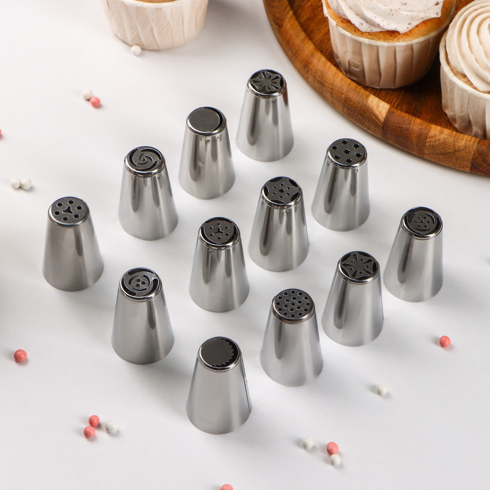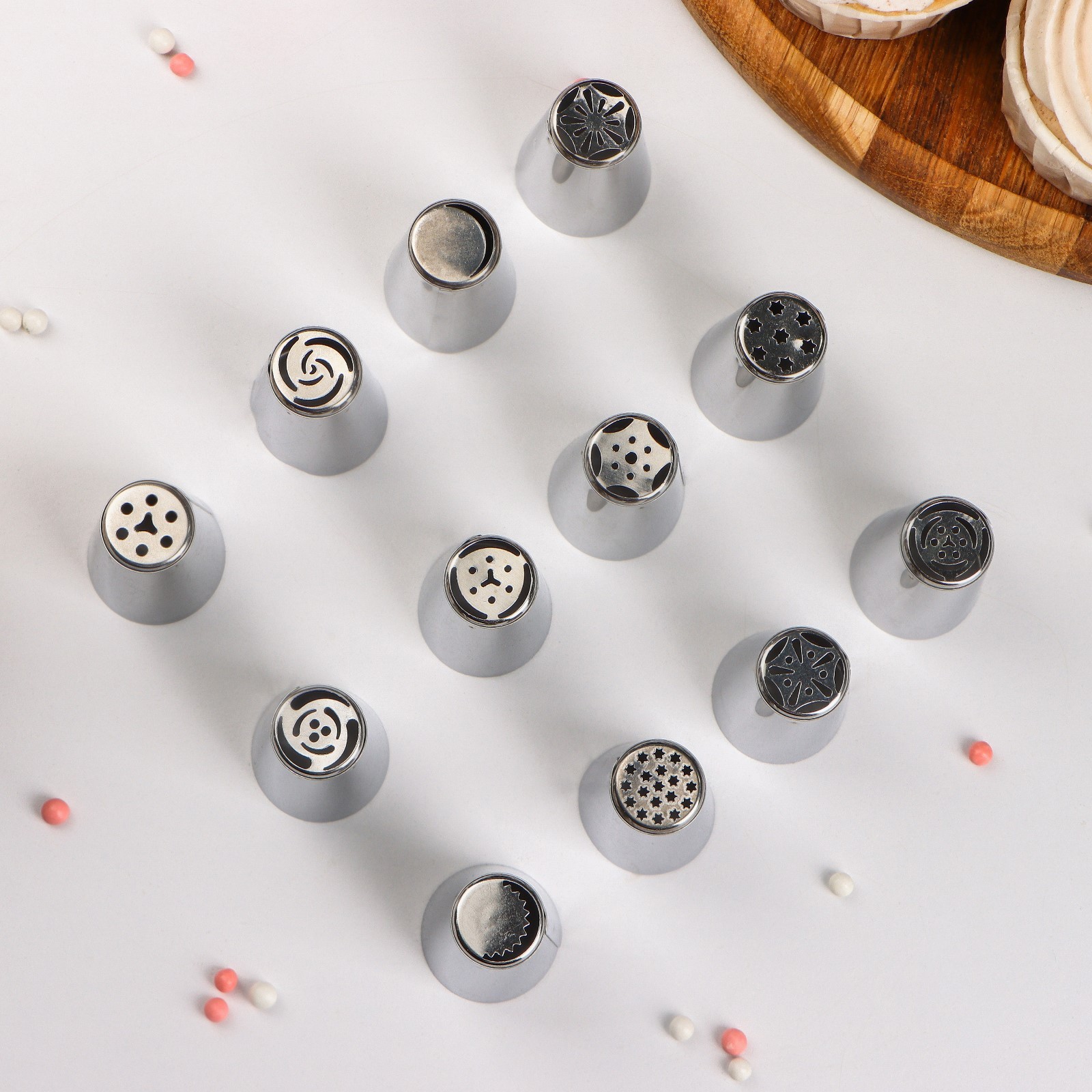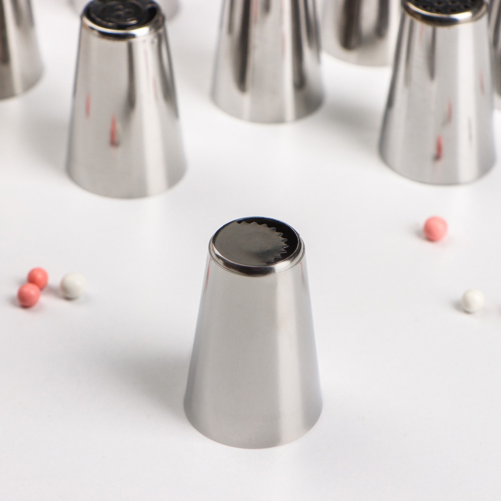 Набор насадок кондитерских доляна, d=2,8 см, 12 шт. Набор кондитерских насадок – это отличный комплект для декорирования десертов. Преимущества: Насадки имеют разные сечения, что позволяет с легкостью создать кремовую розу, интересный узор или лепесток. С легкостью поможет украсить праздничный торт, капкейки, сладкий пирог и любой другой десерт. Кондитерские насадки выполнены из пищевой нержавеющей стали, что гарантирует безопасное и долговечное использование. Набор отлично подойдет как профессионалам, так и любителям. С ним Ваши десерты станут еще красивее и вкуснее. Готовьте с удовольствием! Цвет: Хромированный В наборе, шт.: 12 Материал: Нержавеющая сталь Для детей до 3 лет: Нет  развернуть описание ▼