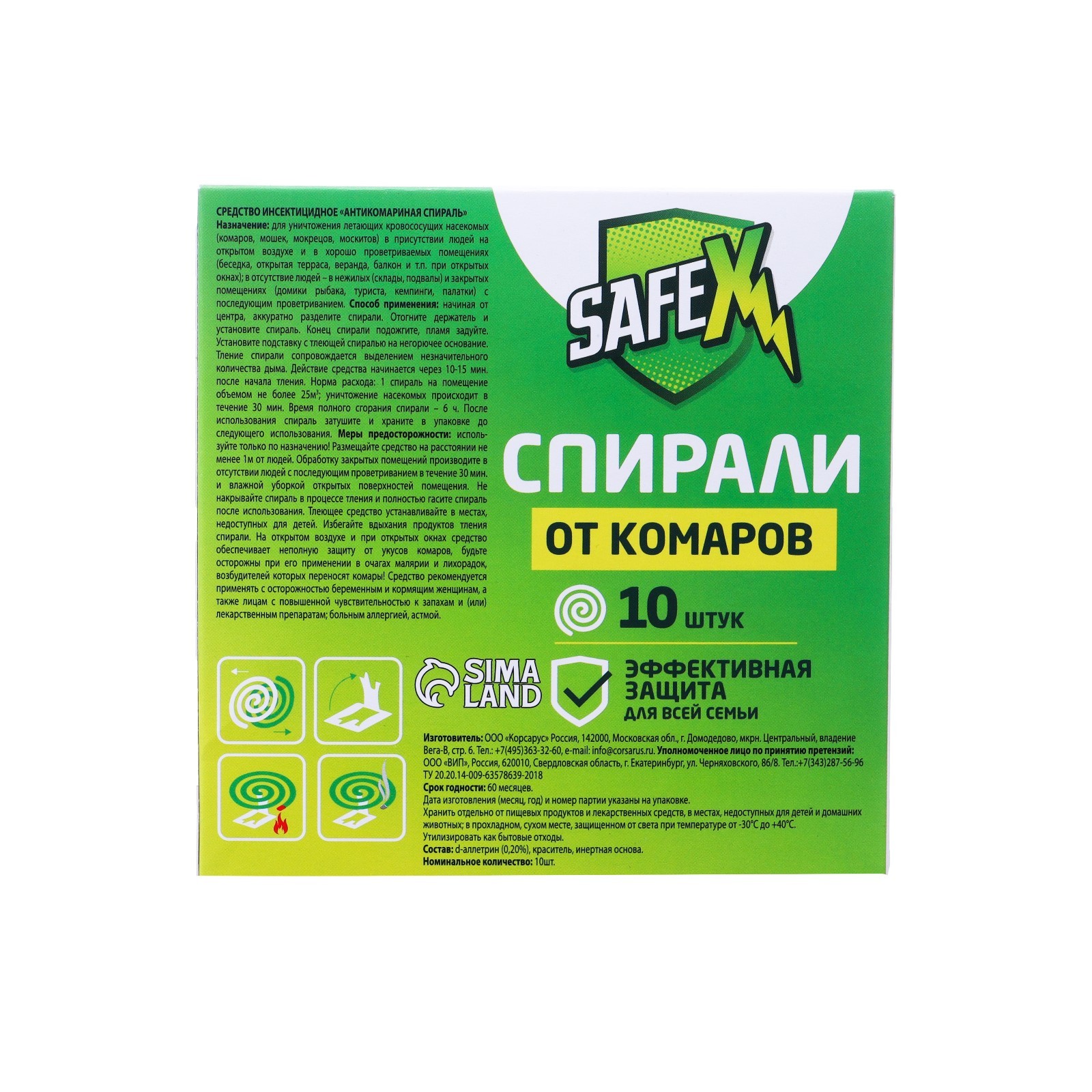 Спирали антимоскитные safex, 10 шт. Антимоскитные спирали SAFEX: инструкция по применению и меры предосторожностиАнтимоскитные спирали SAFEX – это эффективное средство для борьбы с комарами, мошками и москитами. Они содержат действующее вещество, которое выделяется вместе с дымом и уничтожает насекомых. В данной статье мы расскажем о способе применения спиралей SAFEX, а также о мерах предосторожности при использовании этого продукта. Способ примененияИзвлеките спирали из коробки и осторожно разъедините. Отогните стойку на металлической подставке и плотно закрепите спираль на ней. Для этого на спирали предусмотрена прорезь. Подожгите конец спирали и задуйте пламя. Тлеющую спираль разместите на невоспламеняющейся поверхности на расстоянии не менее 1 м от людей. Спираль начинает действовать через 10-15 минут после начала тления. Спираль рассчитана на 7 часов непрерывной работы. Рекомендуется применять спирали на открытом воздухе или в хорошо проветриваемых помещениях. По окончании обработки спираль необходимо затушить и сохранить для дальнейшего использования. Меры предосторожностиХраните спирали отдельно от пищевых продуктов в месте, недоступном для детей и домашних животных. Не применяйте спирали в закрытых помещениях. Не рекомендуется использовать в присутствии людей, обладающих повышенной чувствительностью к аллергенам. В случае контакта с кожей тщательно промойте ее водой с мылом. Не допускайте соприкосновения горящей спирали с тканью, бумагой или другими легковоспламеняющимися материалами. Использование антимоскитных спиралей SAFEX – это эффективный способ защиты от комаров, мошек и москитов. Однако, необходимо соблюдать меры предосторожности при использовании данного продукта. Спирали должны храниться в месте, недоступном для детей и животных, а также не следует использовать их в закрытых помещениях или в присутствии людей, обладающих повышенной чувствительностью к аллергенам. При соблюдении всех рекомендаций, антимоскитные спирали SAFEX помогут Вам провести летние вечера без дискомфорта от насекомых. Состав: d-аллетрин, краситель, инертная основа. Вид средства: Спирали, стержни Назначение: От комаров Температурное ограничение: Нет Тип средства: Инсектицид  развернуть описание ▼