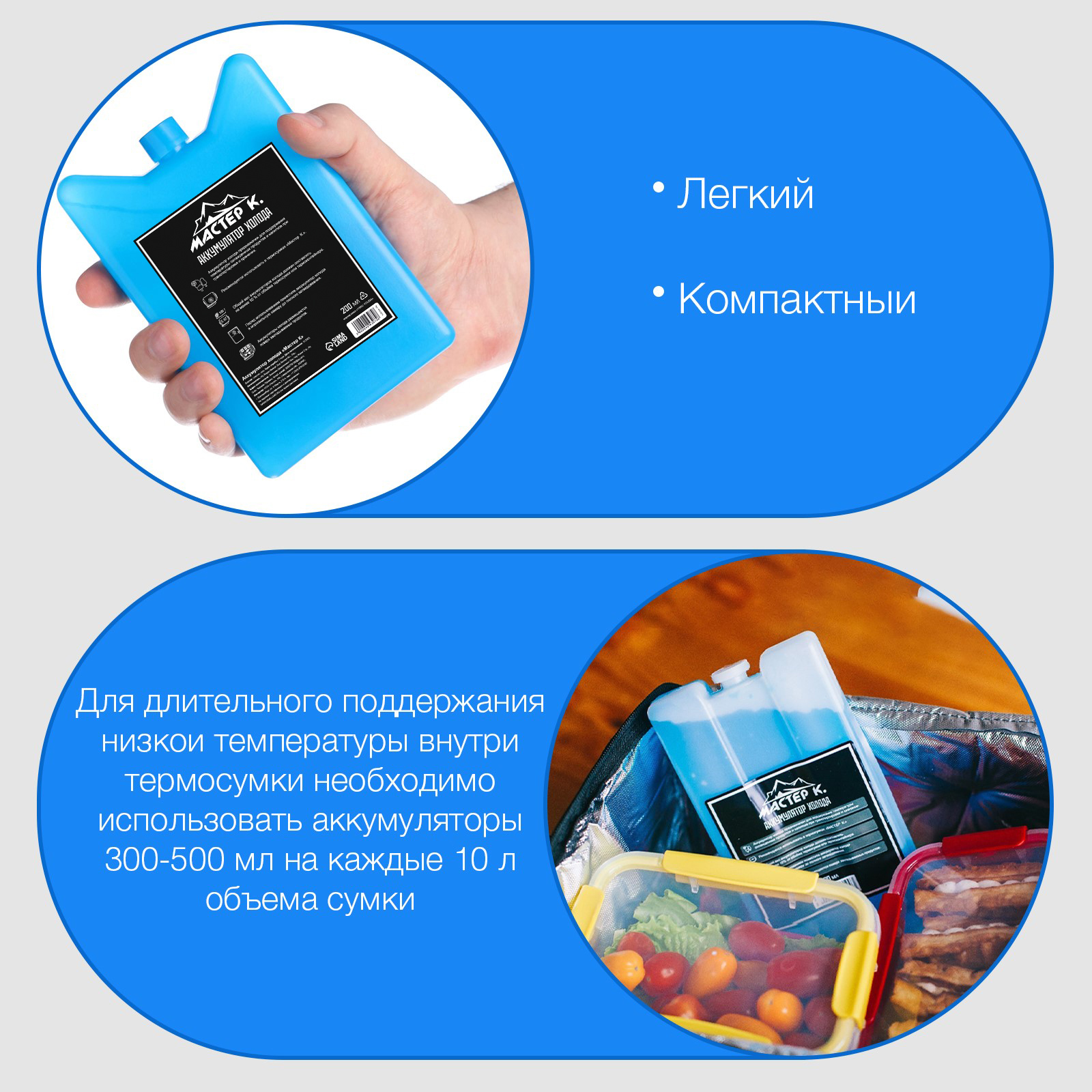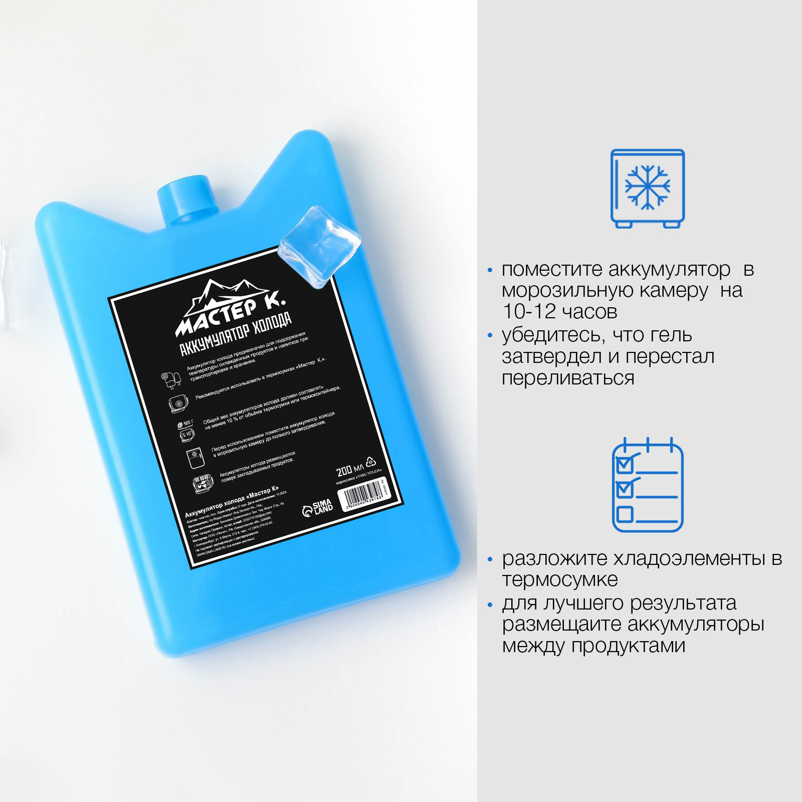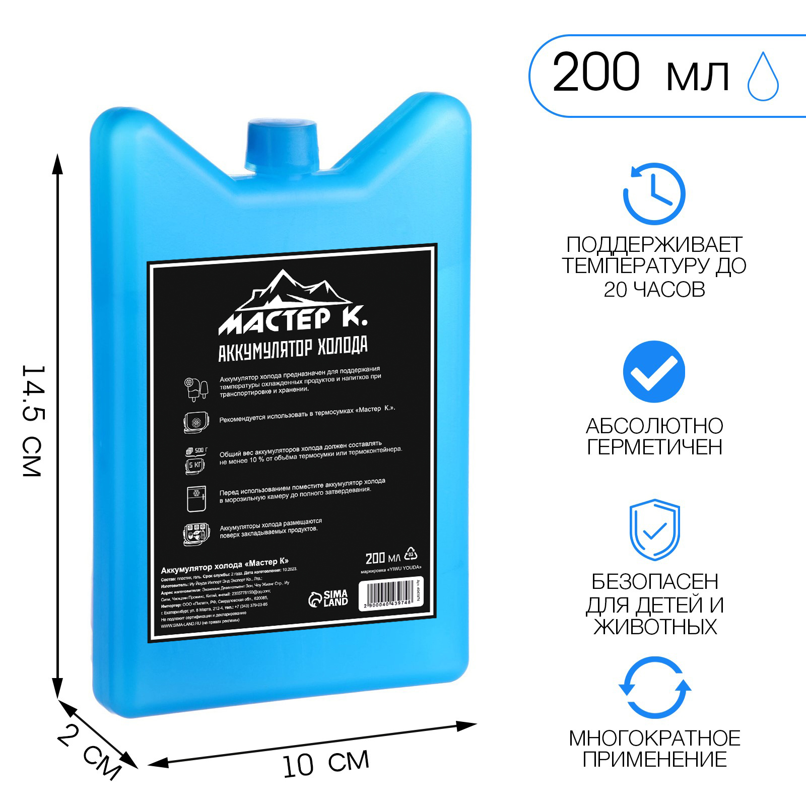Аккумулятор холода гелевый "мастер к", 200 мл, хладоэлемент для термосумок, 14.5 х 10 х 2 см. Аккумулятор холода — это герметичный контейнер с теплоёмким гелевым раствором. Компактное изделие удобно использовать в изотермических контейнерах и сумках. Характеристики изделия Изготовлено из безвредных материалов. Предназначено для многократного использования (при условии сохранения непроницаемости корпуса). Поддерживает холод до 20 часов. Рассчитано на сохранение температуры в ёмкости до 5 литров. Подходит для любого вида продуктов. Срок эксплуатации не ограничен (при условии, что герметичность оболочки не нарушена). Длина, см: 14.5 Ширина, см: 10 Время сохранения тепла/холода, ч: 20 Объём, мл: 200 Вид: Аккумулятор температуры Вид: Твёрдый  развернуть описание ▼