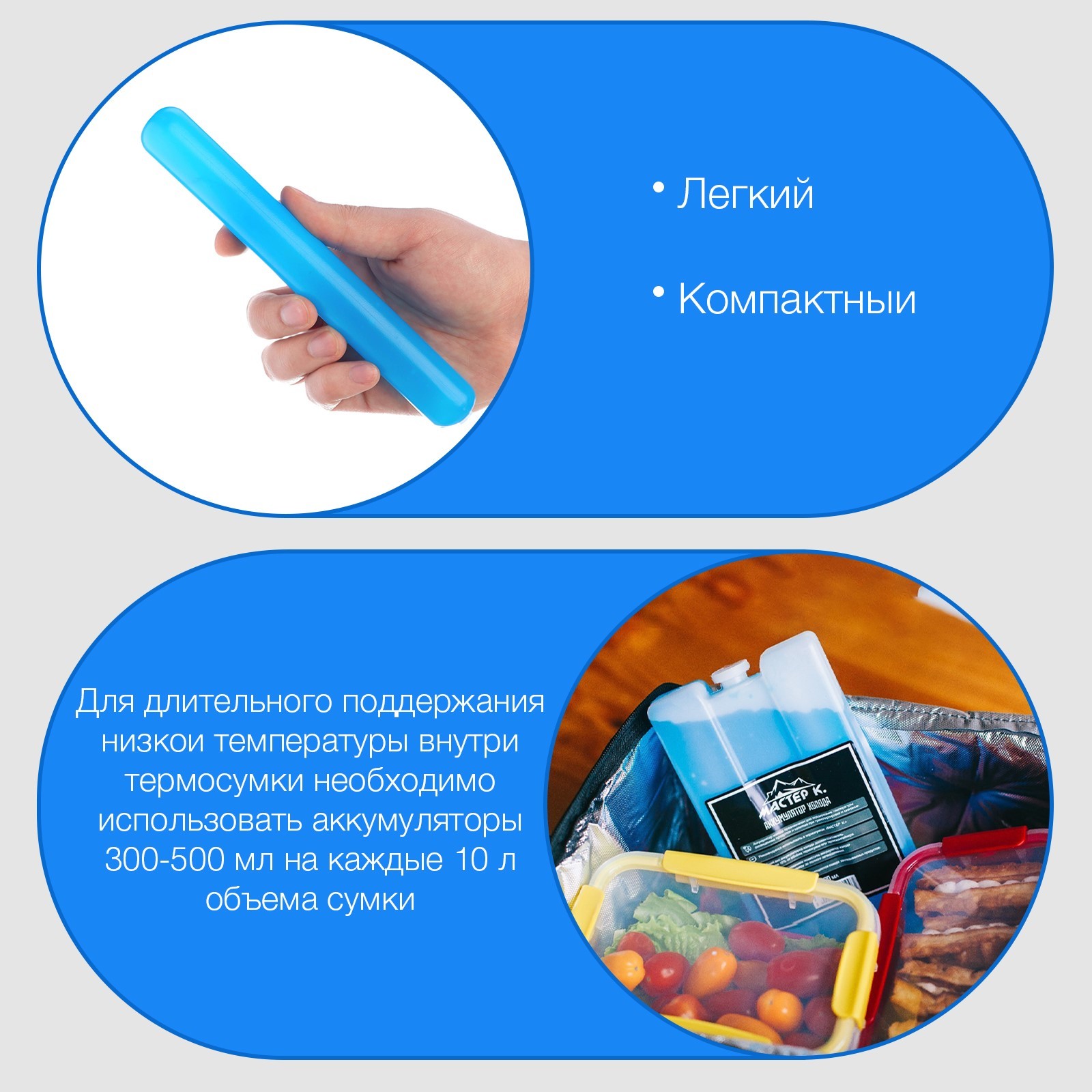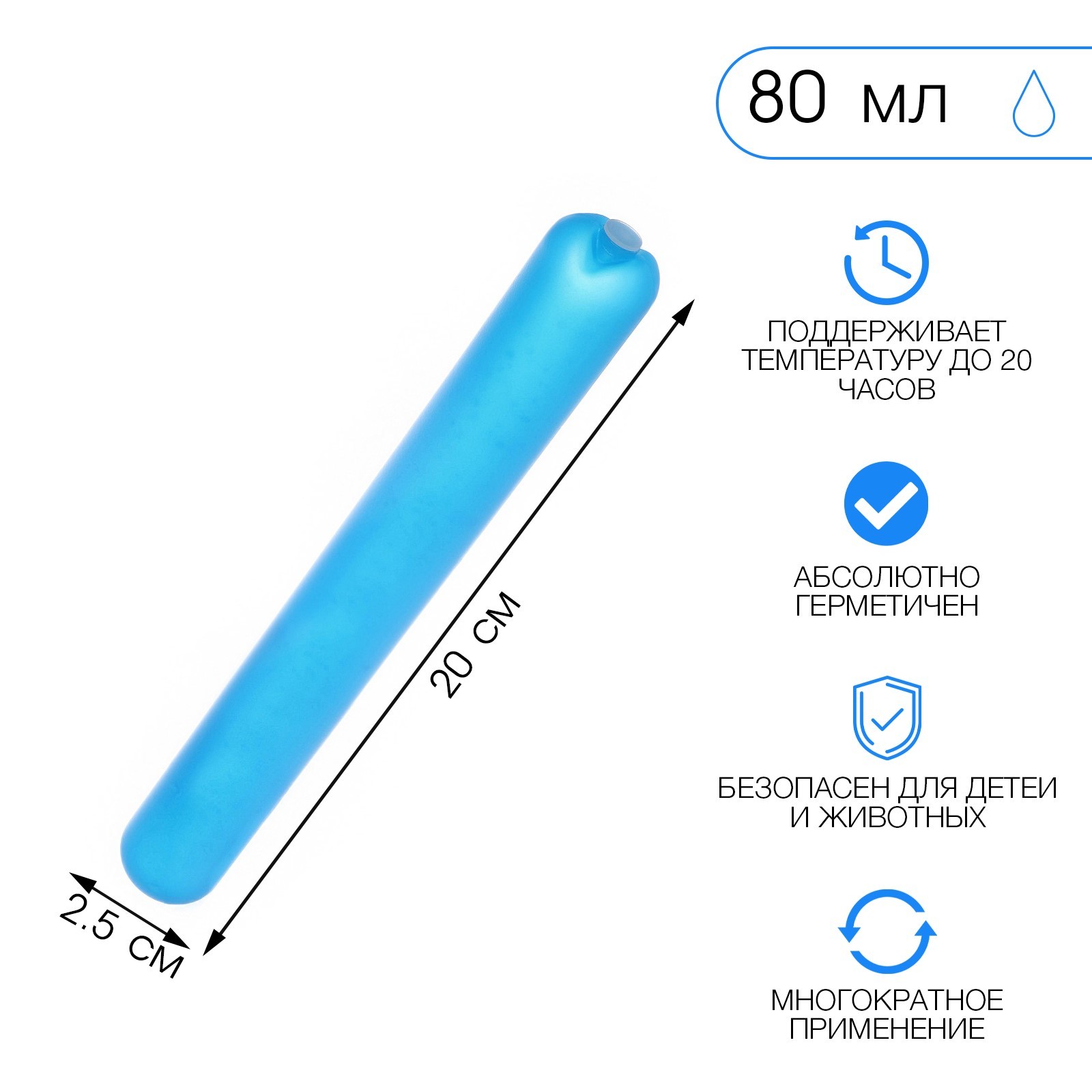 Аккумулятор холода гелевый "мастер к", 80 мл, хладоэлемент для термосумок, 20 х 2.5 см. Аккумулятор холода — это герметичный контейнер с теплоёмким гелевым раствором. Компактное изделие удобно использовать в изотермических контейнерах и сумках. Как использовать? Положите резервуар в морозильную камеру до полного затвердевания (рекомендуется на 8–10 часов). Там изделие запасётся необходимым количеством холода, которое затем передаётся продуктам. После использования ополосните контейнер водой и протрите насухо. Храните изделие в морозильной камере или в другом сухом месте. Характеристики изделия Изготовлено из безвредных материалов. Предназначено для многократного использования (при условии сохранения непроницаемости корпуса). Поддерживает холод до 20 часов. Рассчитано на сохранение температуры в ёмкости до 2 литров. Подходит для любого вида продуктов. Срок эксплуатации не ограничен (при условии, что герметичность оболочки не нарушена). Длина, см: 20 Ширина, см: 2.5 Время сохранения тепла/холода, ч: 20 Объём, мл: 80 Вид: Аккумулятор температуры Вид: Твёрдый  развернуть описание ▼