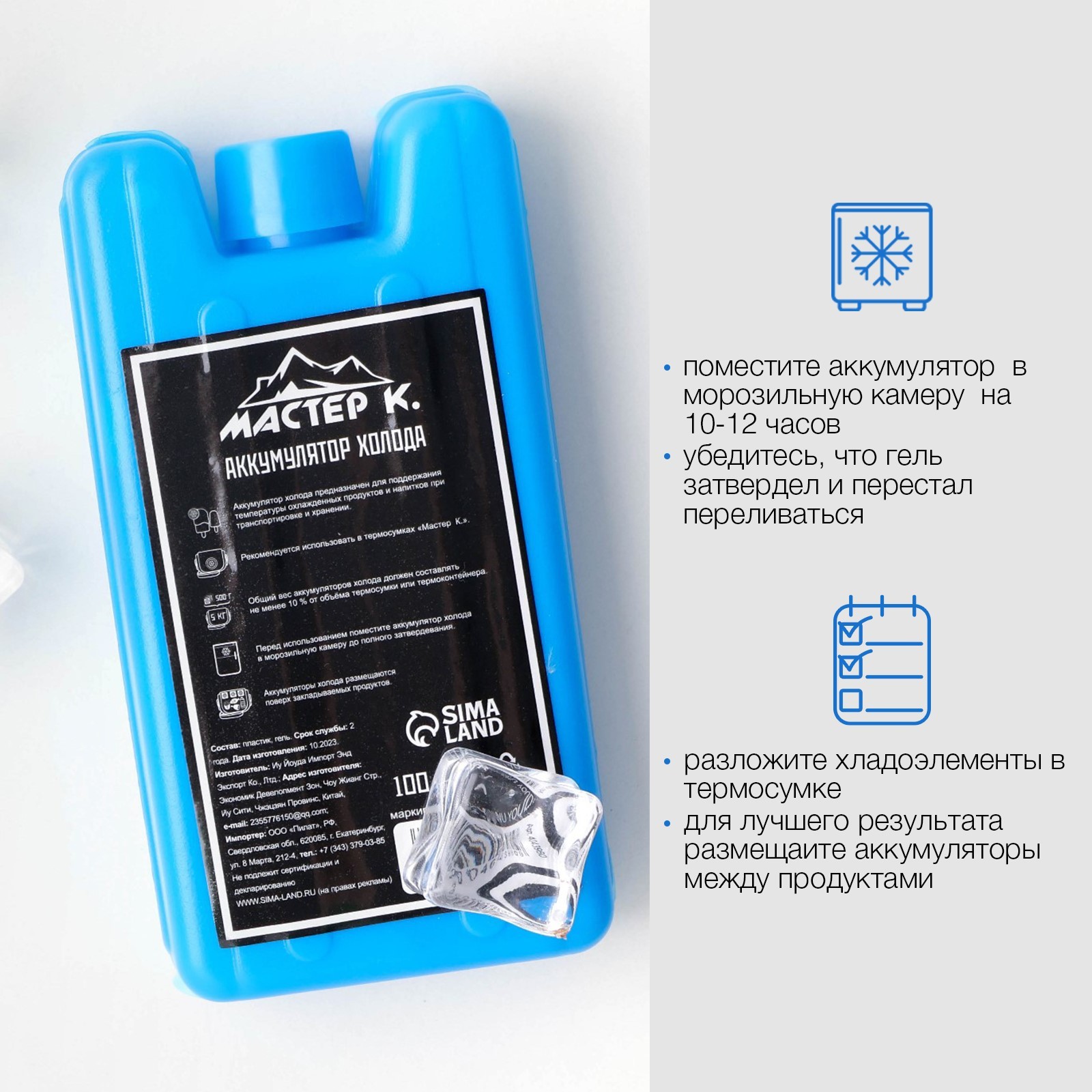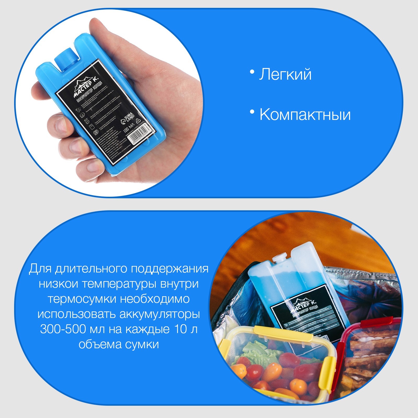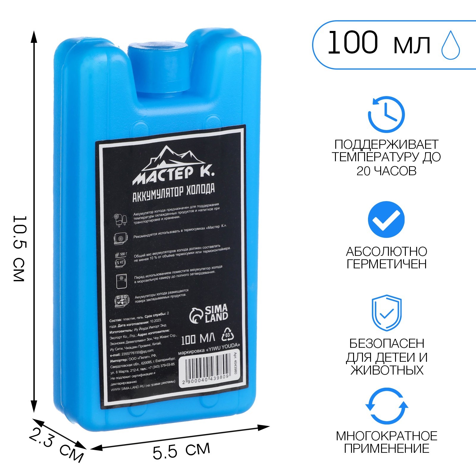 Аккумулятор холода гелевый "мастер к", 100 мл, хладоэлемент для термосумок, 10.5 х 5.5 х 2.3 см 4043. Аккумулятор холода предназначен для поддержания низкой температуры в контейнерах из вспененных материалов, сумках-холодильниках и термопакетах. Он равномерно распределяет холод внутри термосумки, не протекает, обеспечивает долговременное охлаждение продуктов. Термоаккумулятор также используется медицинскими работниками и спортсменами для охлаждения отдельных участков тела при ушибах и гематомах, или для восстановления мышц после интенсивных тренировок. Криопакет актуален для хранения продуктов питания и напитков, когда предстоят продолжительные поездки или же отправка на пикник. А также, хранения лекарств, которые требуют пребывания в прохладной среде. Маленький охладитель прост в использовании: достаточно поместить его в холодильник или морозилку на 8-12 часов. После этого терморегулятор разместить в термосумке, контейнере, сумке-холодильнике, термопакете или аптечке. Количество элементов, необходимых для охлаждения, зависит от объемов аксессуара. На каждые 10 литров необходимо использовать 300-500 мл охладителя. Для отдыха на природе, путешествий на автомобиле, рыбалки, охоты, рюкзака – пригодится в самых разных ситуациях. Для дачи, садового домика, где нет полноценного холодильника, станет незаменимым решением. Длина, см: 10.5 Ширина, см: 5.5 Время сохранения тепла/холода, ч: 20 Объём, мл: 100 Вид: Аккумулятор температуры Вид: Твёрдый  развернуть описание ▼