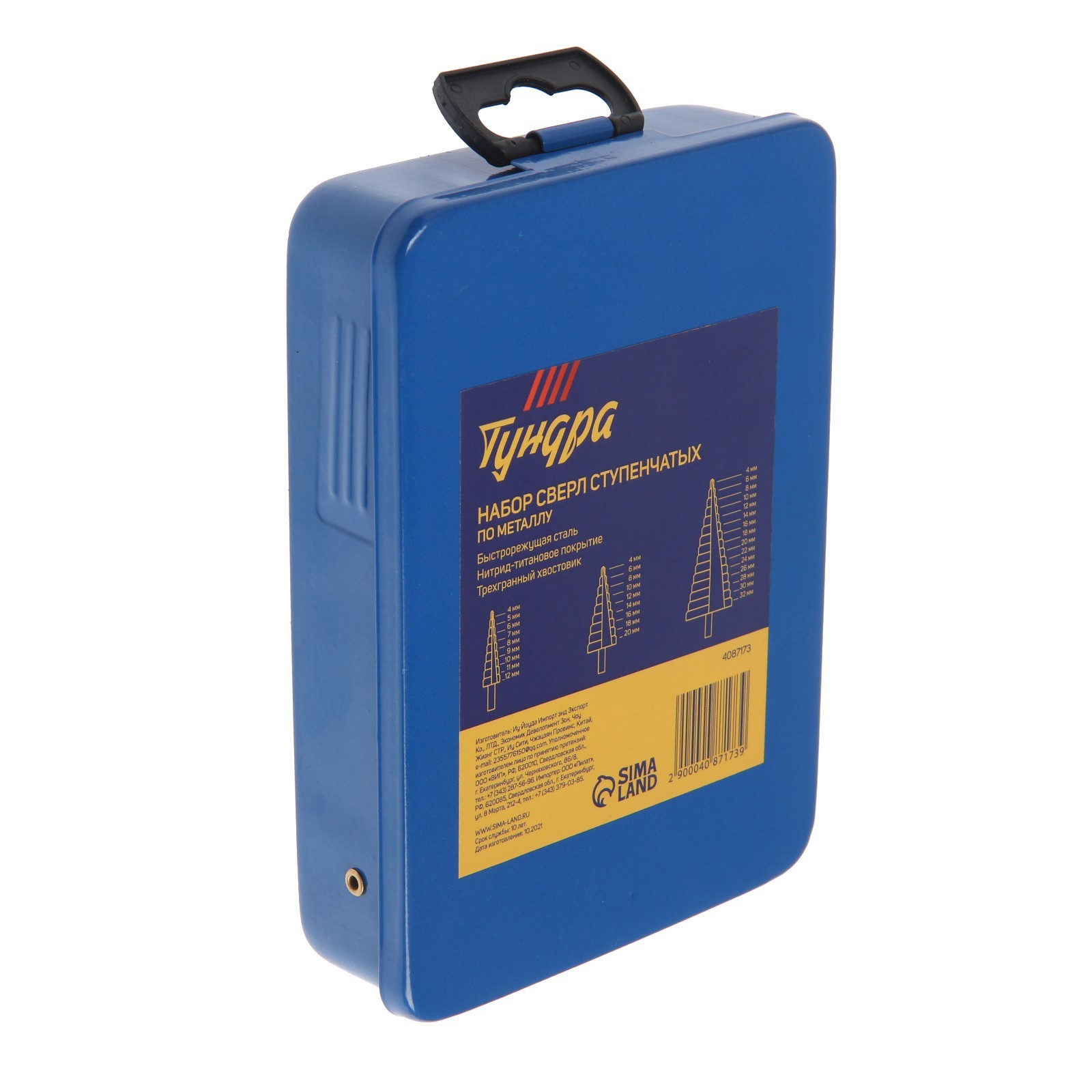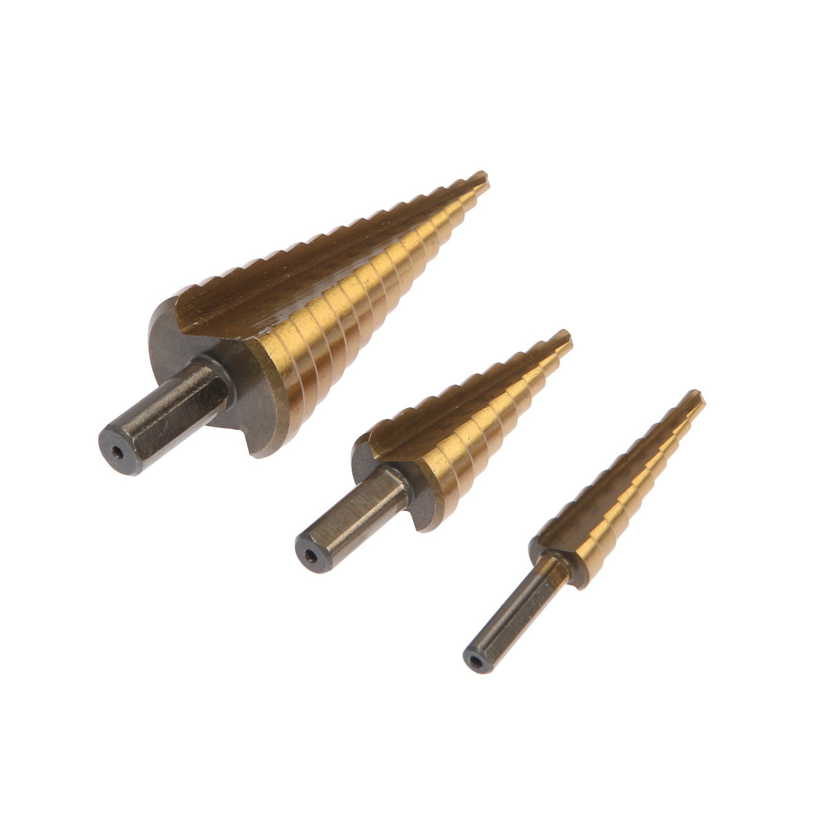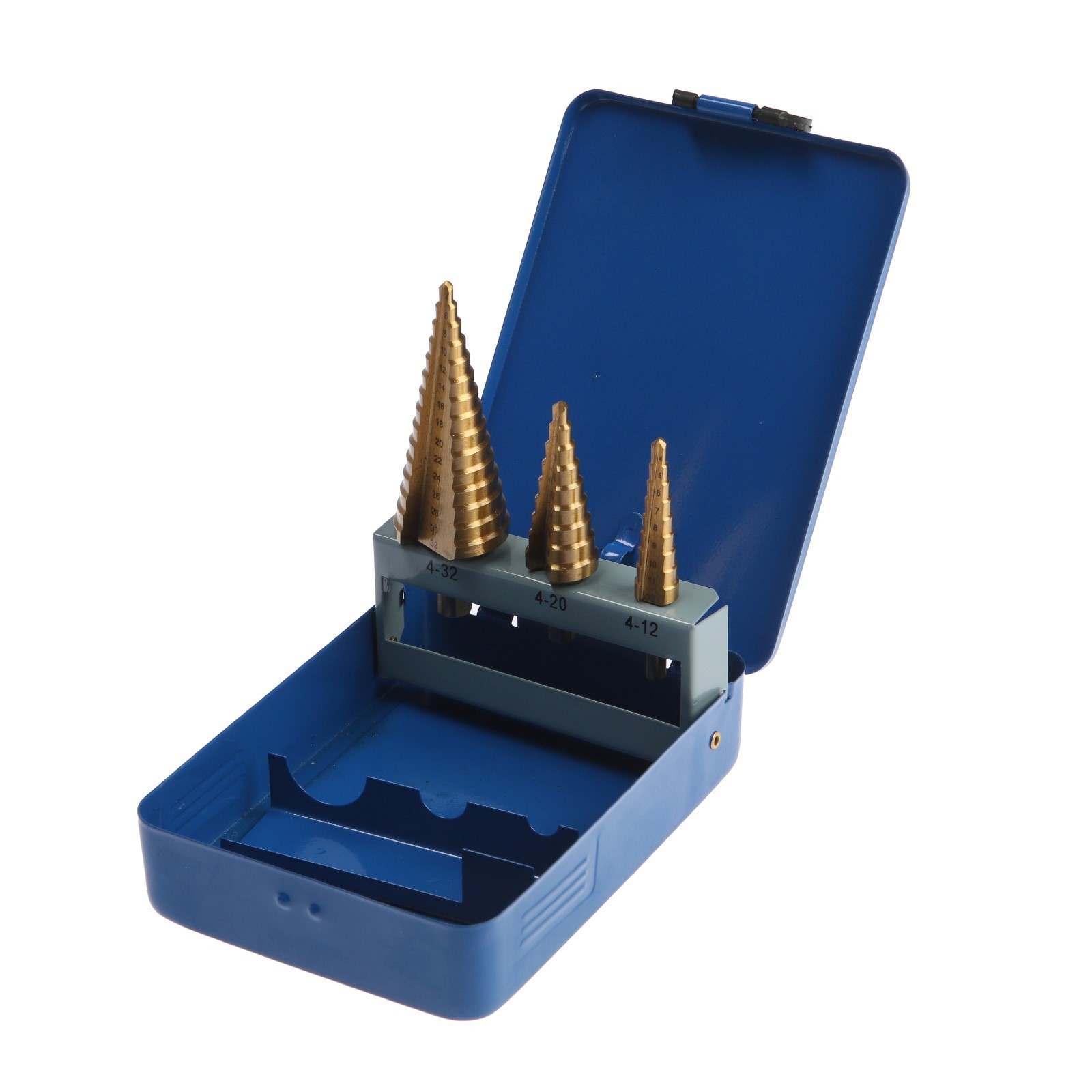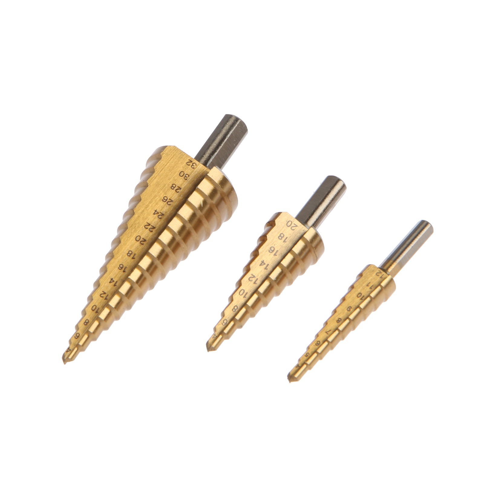 Набор сверл ступенчатых тундра, hss, tin, трехгр. хвост., 4-12 мм, 4-20 мм, 4-32 мм, 3 шт..
