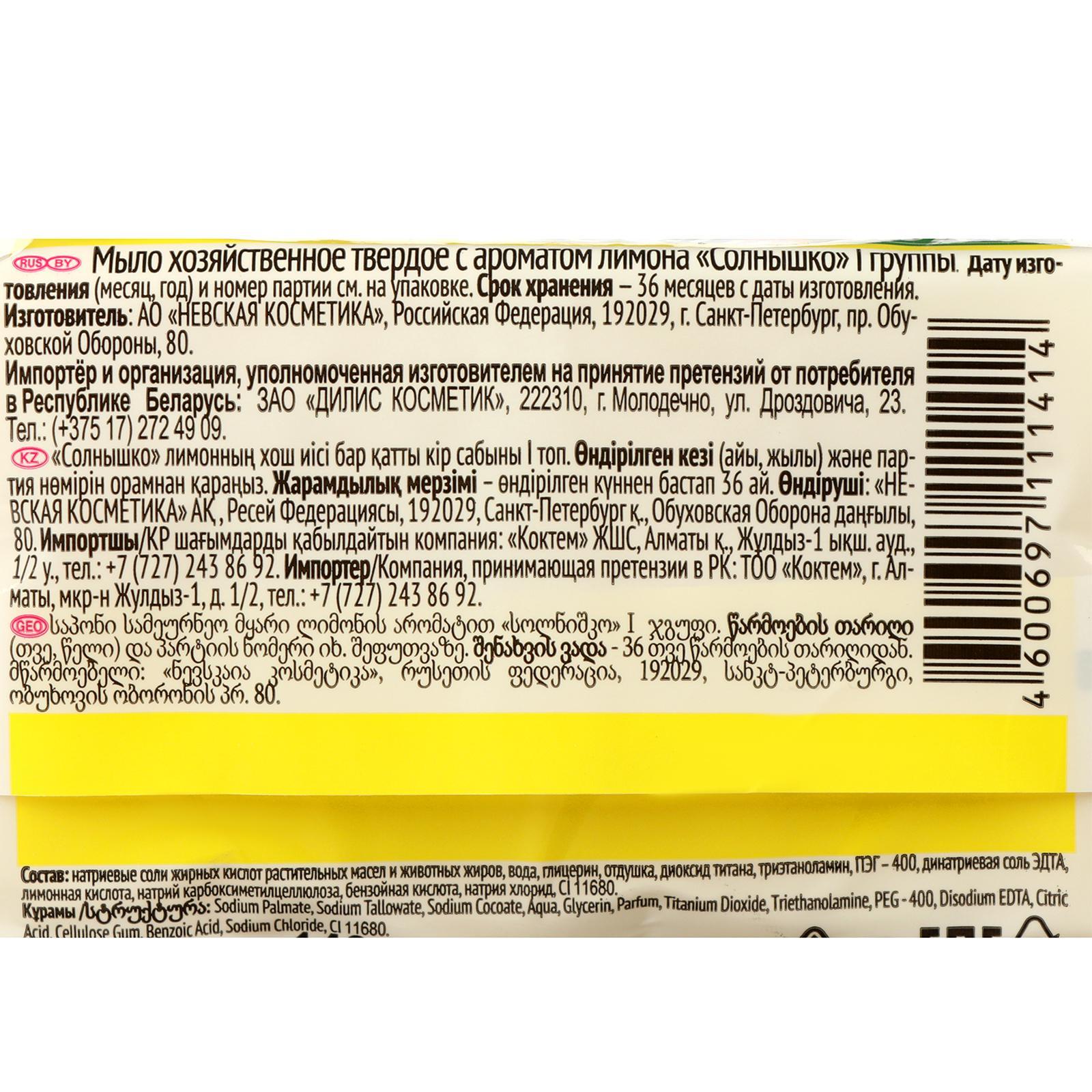 Мыло хозяйственное «солнышко» хозяйственное, 140 г. Хозяйственное мыло СОЛНЫШКО с ароматом лимона предназначено для мытья посуды, рук и стирки. Образует пышную пену даже в жесткой воде. Не сушит кожу рук. Изготовлено в соответствии с ГОСТ 30266-95. Состав: натриевые соли жирных кислот растительных масел и животных жиров, вода, отдушка, глицерин, диоксид титана, триэтаноламин, ПЭГ – 400, динатриевая соль ЭДТА, лимонная кислота, натрий карбоксиметилцеллюлоза, бензойная кислота, натрия хлорид, CI 11710. Цвет: Белый Вес, г/Объём, мл: 140 Вес, г: 140 Вид: Мыло Аромат: Лимон Тип: Твёрдое Вид мыла: Туалетное : 0 Товар 18+: Нет  развернуть описание ▼