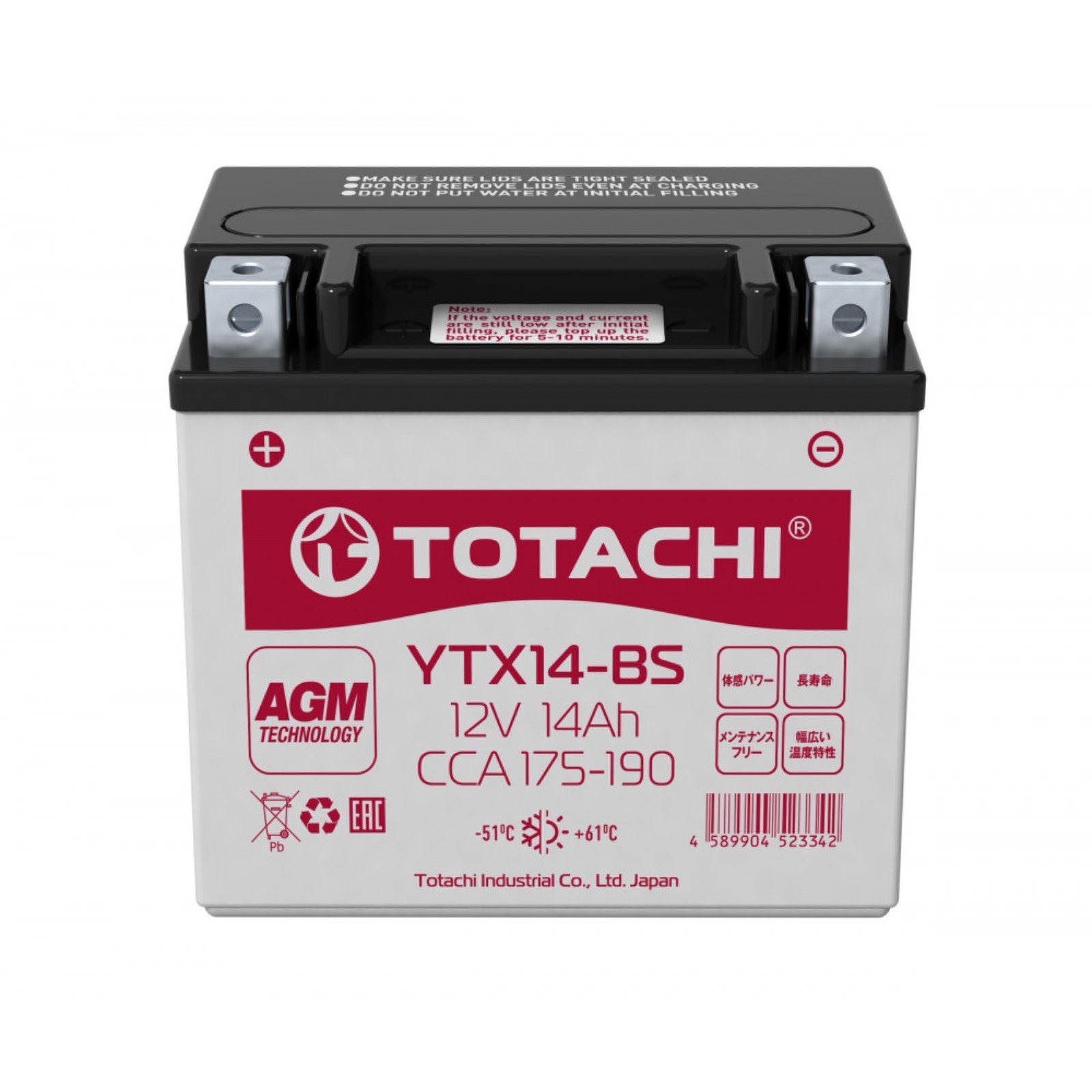 Аккумуляторная батарея totachi moto ytx14-bs, 14 ач, прямая полярность. Аккумуляторные батареи TOTACHI AGM выполнены с применением передовой технологии AGM (Absorbent Glass Mat). Токоотводные пластины используемых электродов изготавливаются по технологии Ca/Ca из высокоочищенного свинца, легированного кальцием. В батареях TOTACHI AGM жидкий электролит абсорбирован в матах (сепараторах) из микростекловолокна, плотно спрессованных между электродными пластинами. Это обеспечивает надежное поступление электролита по всей площади токоотводов. Взаимодействие между электролитом и материалом пластин обеспечивается практически в любом положении АКБ, а внутреннее сопротивление сведено к минимуму. Напряжение, В: 12 Ёмкость аккумулятора, А/ч: 14 Ширина, мм: 87 Высота, мм: 148 Длина, мм: 150 Стартовый ток, А: 190 Полярность: Прямая (+-) Назначение: Для мототехники Тип: Кальциевый Тип клемм: Европейский  развернуть описание ▼