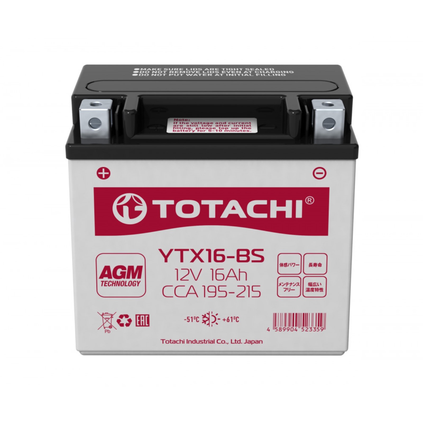 Аккумуляторная батарея totachi moto ytx16-bs, 16 ач, прямая полярность. Аккумуляторные батареи TOTACHI AGM выполнены с применением передовой технологии AGM (Absorbent Glass Mat). Токоотводные пластины используемых электродов изготавливаются по технологии Ca/Ca из высокоочищенного свинца, легированного кальцием. В батареях TOTACHI AGM жидкий электролит абсорбирован в матах (сепараторах) из микростекловолокна, плотно спрессованных между электродными пластинами. Это обеспечивает надежное поступление электролита по всей площади токоотводов. Взаимодействие между электролитом и материалом пластин обеспечивается практически в любом положении АКБ, а внутреннее сопротивление сведено к минимуму. Напряжение, В: 12 Ёмкость аккумулятора, А/ч: 16 Ширина, мм: 87 Длина, мм: 150 Высота, мм: 161 Стартовый ток, А: 215 Полярность: Прямая (+-) Назначение: Для мототехники Тип: Кальциевый Тип клемм: Азиатский  развернуть описание ▼