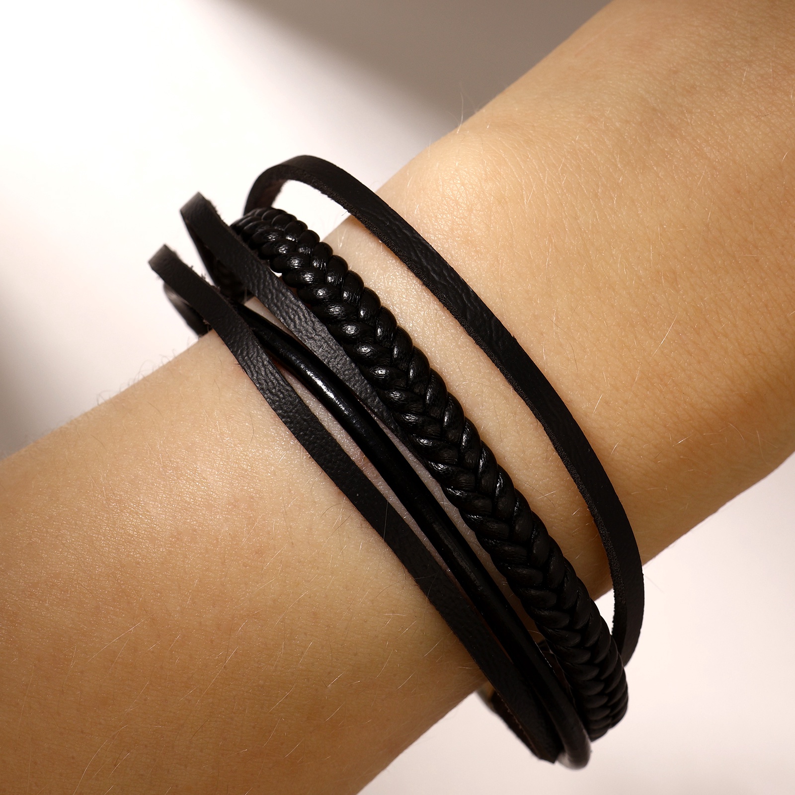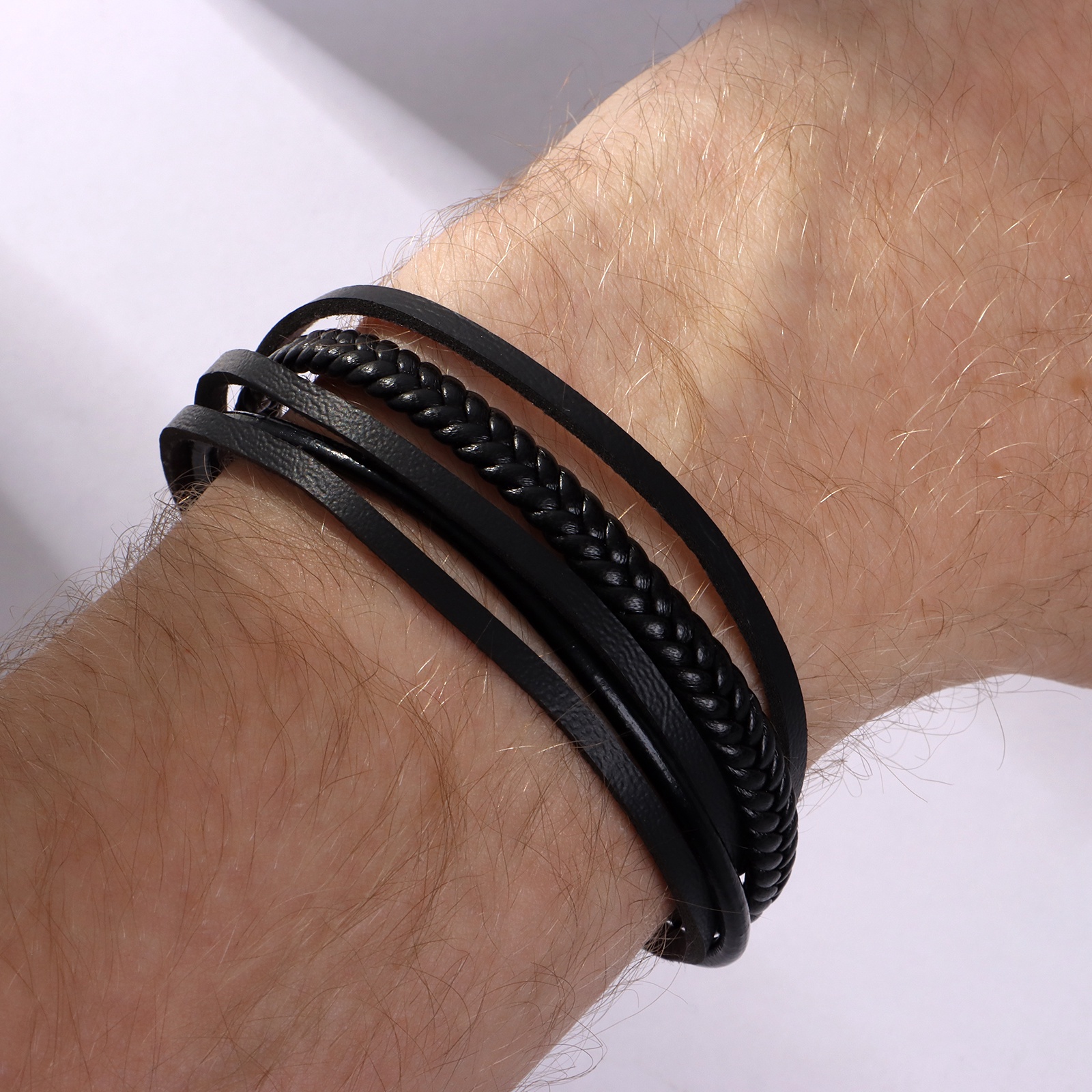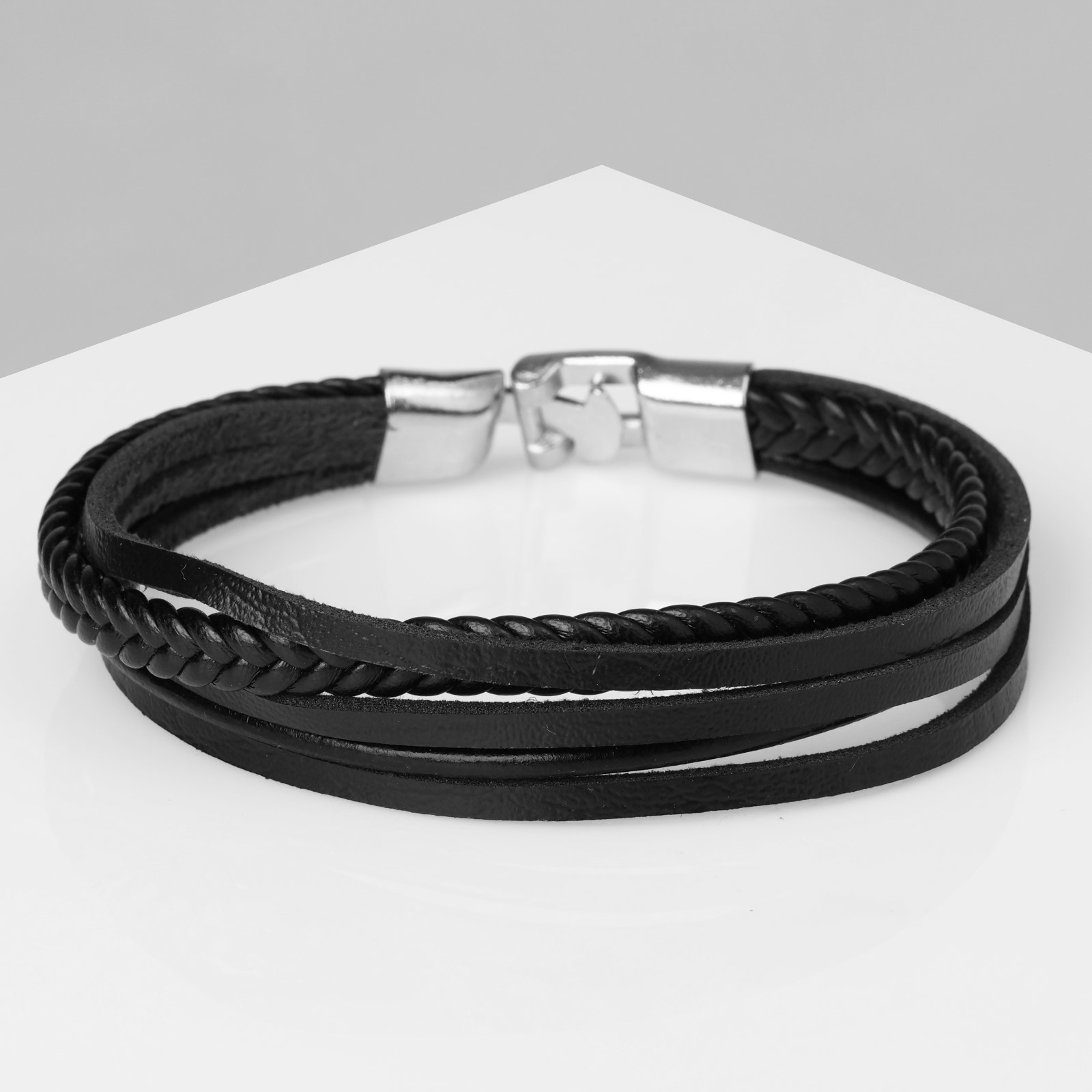 Браслет кожаный «переплетение» классика, 5 нитей, чёрный с серебром, D=7 см