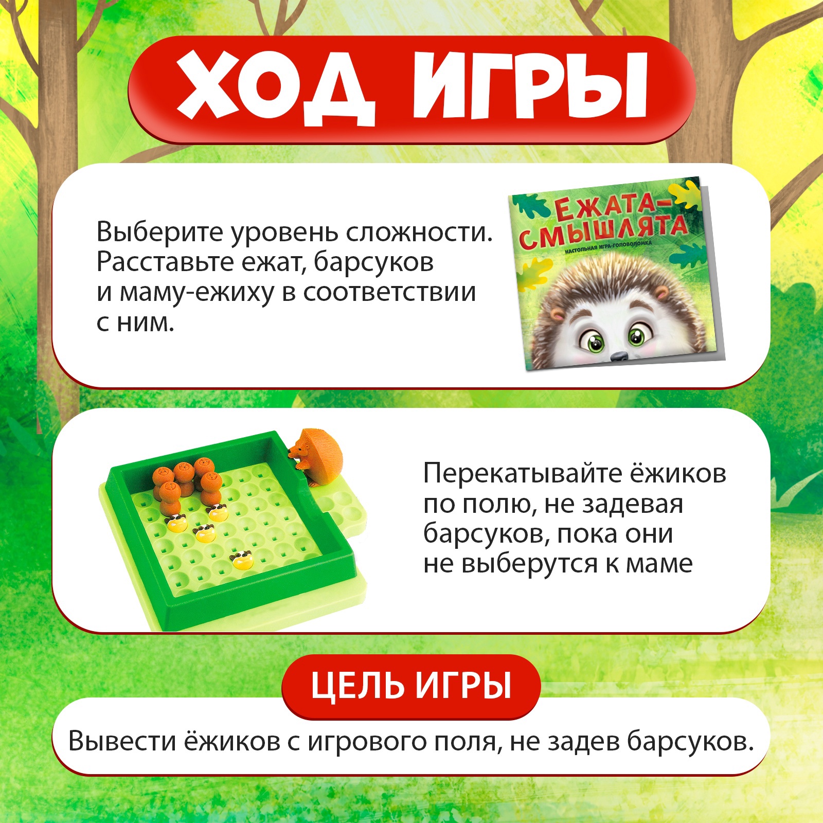 Настольная игра головоломка «ежата-смышлята», задания с ответами, 5 уровней сложности, 1 игрок, 8+. «Ежата-смышлята» — настольная игра для детей от 8 лет. Озорные ёжики, заигравшись в догонялки, заблудились и попали в ловушку. Игроку предстоит помочь маме ежихе спасти своих детей, проявив смекалку. Цель игры Вывести ёжиков с игрового поля, не задев барсуков. Как играть Выберите задание из книжки.Расставьте фигурки ежат, барсуков и мамы ежихи в соответствии с заданием.Перекатывайте ёжиков по полю, не задев барсуков, пока они не выберутся к маме через отверстие в игровом поле.Задание считается пройденным, когда ежата оказываются рядом с мамой.Играя в увлекательную головоломку, малыш разовьёт внимание, воображение и логическое мышление. Для кого:Унисекс|Возраст:От 8 лет|Материал:Пластик|Материал:Бумага|Количество игроков:1 игрок|Жанр игры:Головоломки и логические|Развитие навыков:Моторика|Развитие навыков:Логика|Страна:Китай  развернуть описание ▼