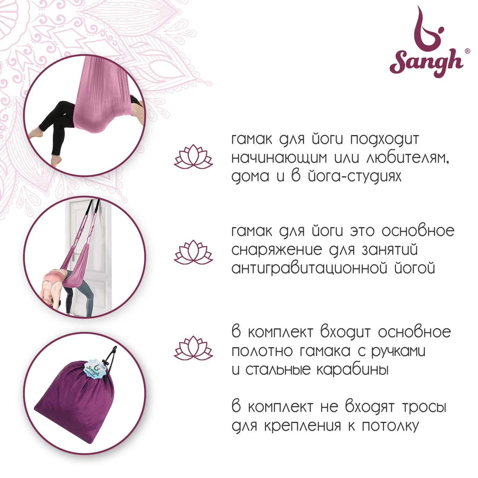 Гамак для йоги sangh, 250x140 см, цвет фиолетовый. Гамак для йоги подходит начинающим или любителям. Полотно сделано без лишних швов. Используется дышащая и быстросохнущая ткань. Под неопреновыми держателями сделаны небольшие фиксаторы для стоп. Рекомендуется для домашнего использования или в йога-студиях. Это основное снаряжение для занятий антигравитационной йогой. Преобразованная конструкция трапеции, на которой выполняются некоторые упражнения гимнастов, позволяет отрабатывать большое количество сложных перевёрнутых асан, предполагающих нахождение в воздухе без контакта с полом и стенами. Ощущение невесомости, парения в воздухе даёт возможность сконцентрироваться на процессе медитации. На таких занятиях работают основные мышцы корпуса, благодаря чему вы научитесь управлять своим телом, разовьёте координацию движений. При этом улучшается кровообращение и происходит насыщение тканей и органов кислородом. Новые ощущения подарят заряд бодрости и хорошее настроение. Особенности Ткань: нейлон. Шесть ручек с мягкими и удобными держателями для рук и ног. Рекомендуемая нагрузка: до 200 кг. Категория: бюджетный. Комплектация: основное полотно гамака и ручки;стальные карабины в стандартной комплектации. Внимание! В комплект не входят тросы для крепления к потолку. Цвет ручек (держателей), верёвочных креплений, фурнитуры может отличаться от представленных на фото. Данное расхождение не является браком. Цвет: Фиолетовый parts count: 0 Ширина полотна, см: 150 Maксимальная нагрузка, кг: 200  развернуть описание ▼