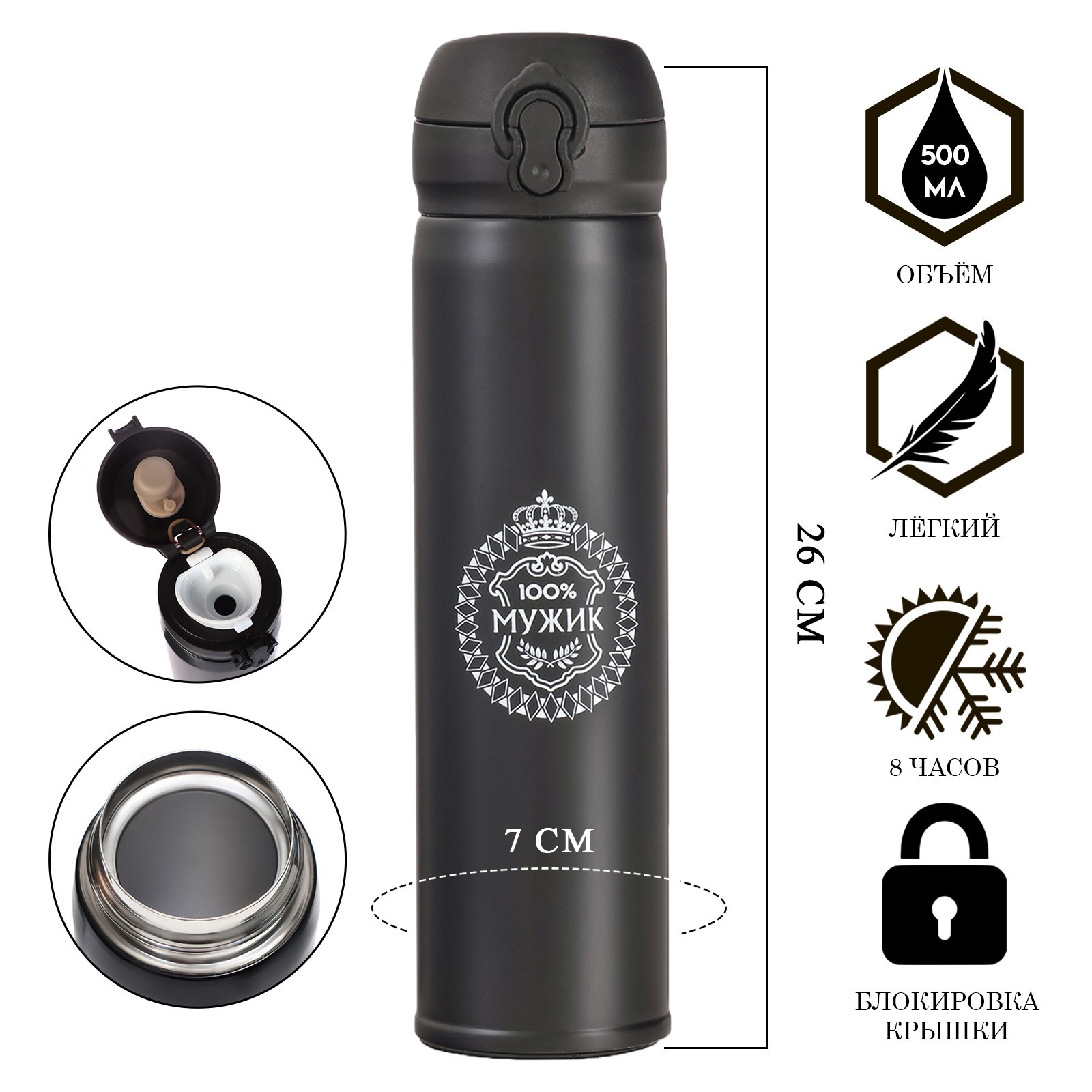 Термос, 500 мл, топ "мастер к 100% мужик" 500 мл сохраняет тепло 8 ч 7 х 26 см. Термос (термокружка) для кофе и чая "Мастер К" идеален для офиса, автомобиля, длительных прогулок и детям в школу. Термос отлично подходит для автомобильных держателей. Благодаря специальному покрытию, надежно лежит в руке. Компактный, экологичный, стильный. Термосы этой серии пользуются большой популярностью у активных и динамичных пользователей, а так же у любителей охоты и рыбалки, так как они, сохраняют прочность и термоустойчивость, легки и компактны. Этот термос просто идеально подойдет для тех, кто ценит свое время и хочет наслаждаться свежим и горячим кофе, чаем или другими любимыми напитками в любой ситуации. Термос "Мастер К" 500 мл (0. 5 л) это яркое решение для любителей чая, кофе, травяных, ягодных и фруктовых заварок. Летом данный термос станет приятным спутником на пляж и в жаркий день, так как он сохраняет напиток холодным. Термос "Мастер К" - это стильный аксессуар и отличный подарок на новый год, другу, подруге, брату, сестре, девушке, папе, маме, мужу, жене, бабушке и дедушке на день рождения, 23 февраля, 8 марта, 14 февраля. Термос (термокружка) сделан из нержавеющей стали 18/8, сконструирован по вакуумной технологии, с двойной стенкой, следовательно, долго держит тепло и не проливается. Снабжен откидывающейся крышкой, изготовленной из экологичного пищевого пластика, имеется кнопка, позволяющая с легкостью использовать термос одной рукой. На дне, термос имеет специальную прорезиненную основу, предотвращающую царапины на поверхностях. Удобно: открывать и закрывать одной рукойдержать одной рукой за счет эргономичного дизайнанадежно стоит на любой поверхности за счет прорезиненного нескользящего днаставить в автомобильный подстаканникпомещать в сумку, рюкзакпить, имеется эргономичный поильник Цвет: Хромированный Для кого: Для мужчины parts count: 0 Объём, л: 0.5 Время сохранения тепла/холода, ч: 8 tnved: 9617000001 Материал корпуса: Нержавеющая сталь Материал: Пластик Материал: Металл Тип горлышка: Узкое Назначение: Для напитков Материал колбы: Металл Температурное ограничение: Нет Особенности: С кнопкой Особенности: Вакуумный  развернуть описание ▼