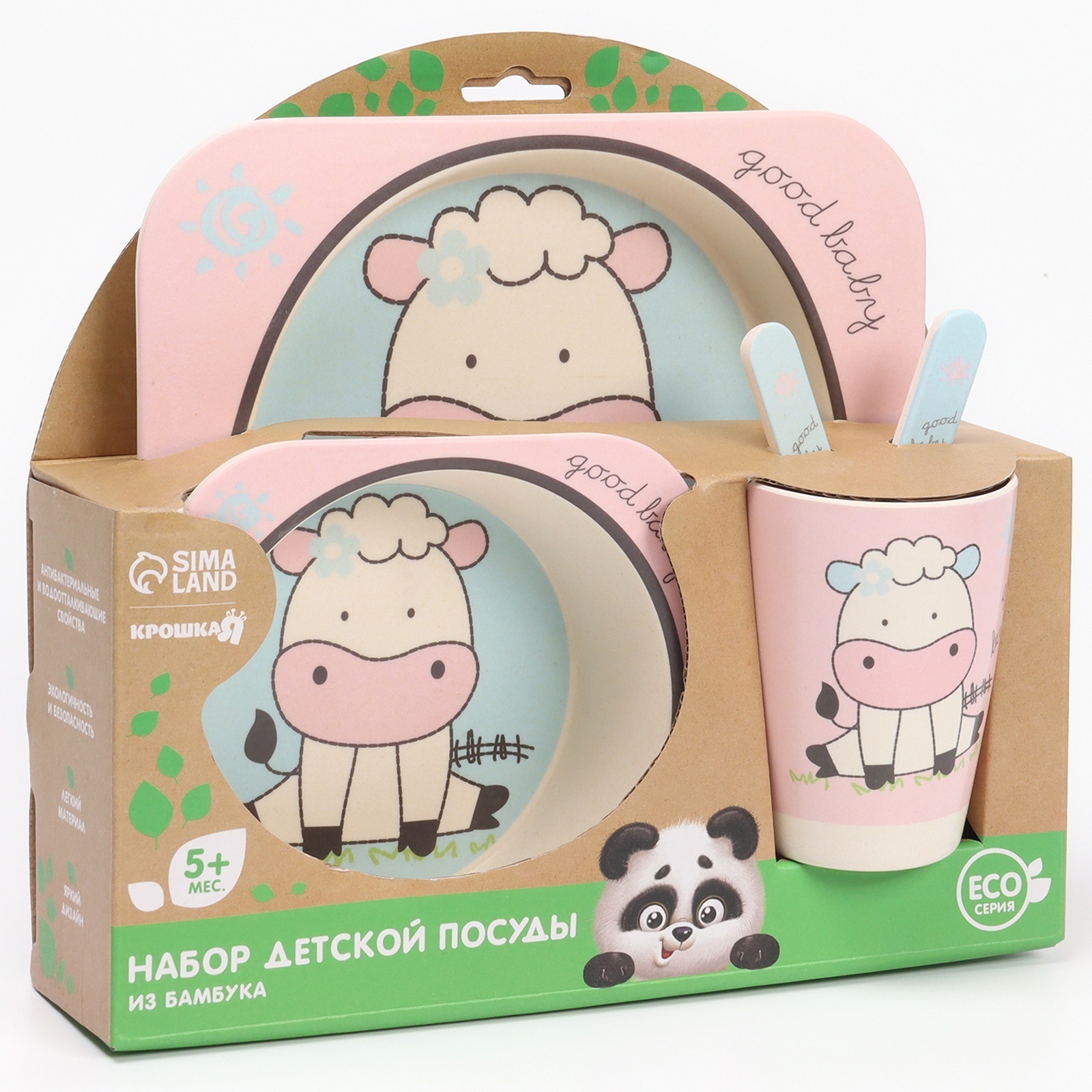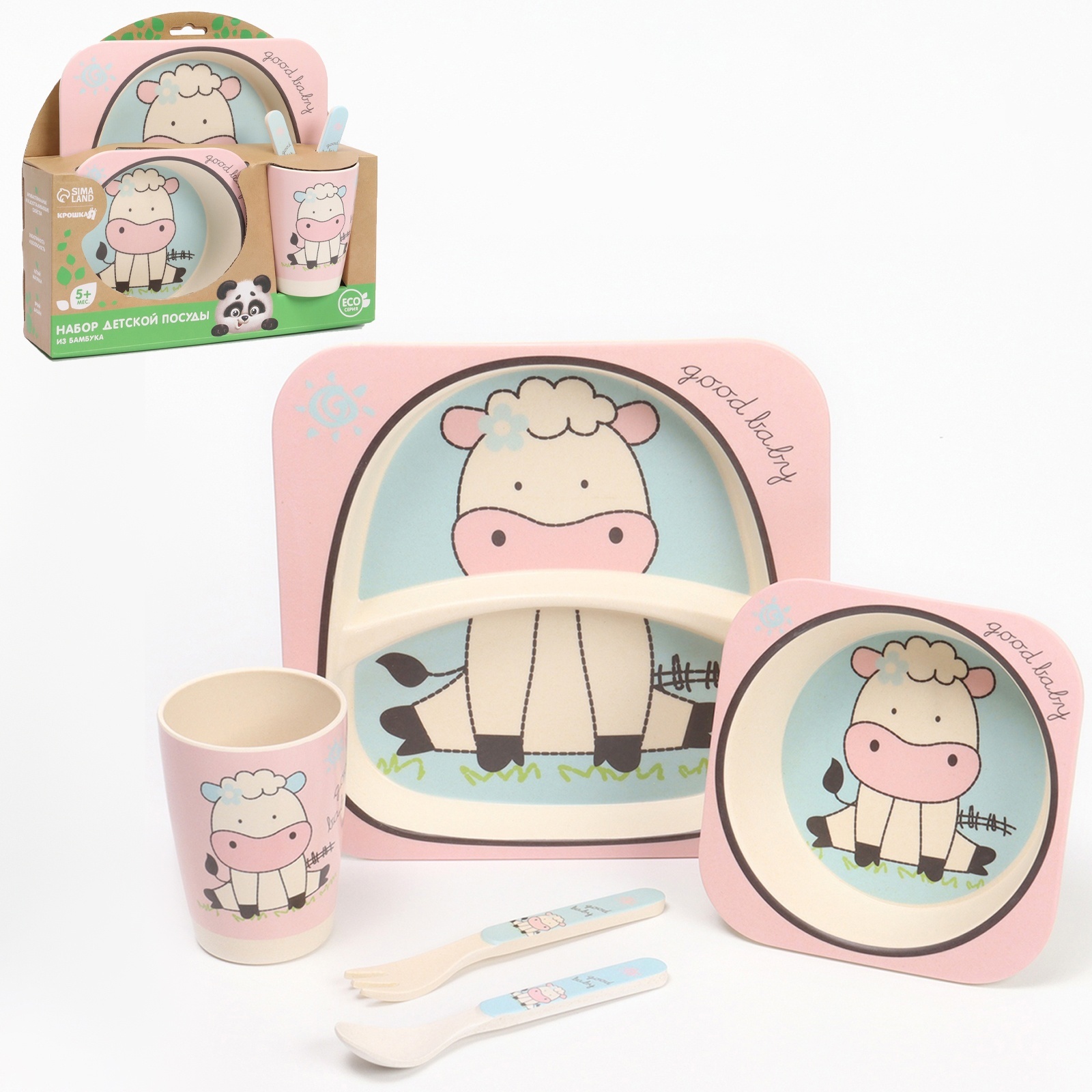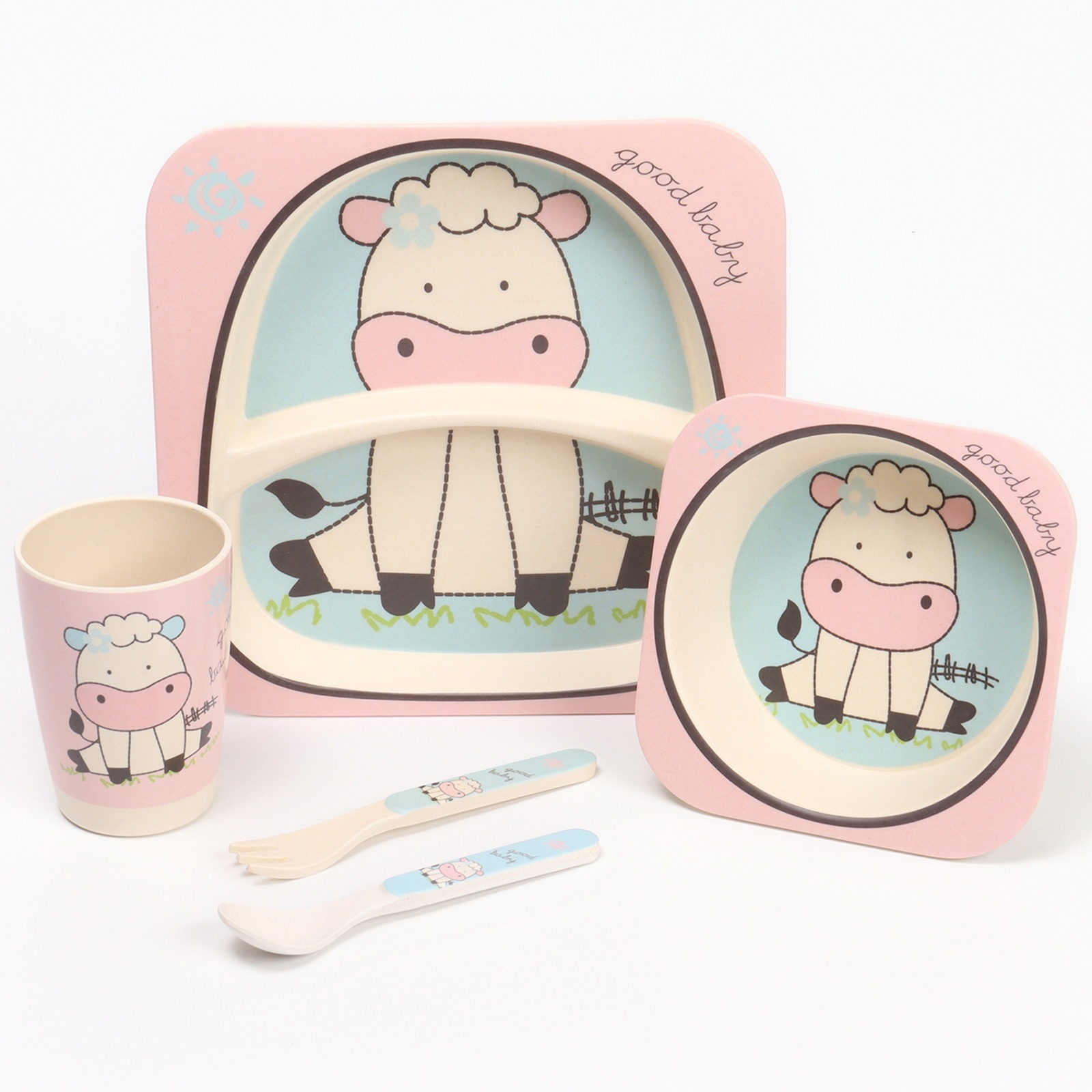 Набор детской посуды «коровка» из бамбука, 5 предметов: тарелка, миска, стакан, столовые приборы
