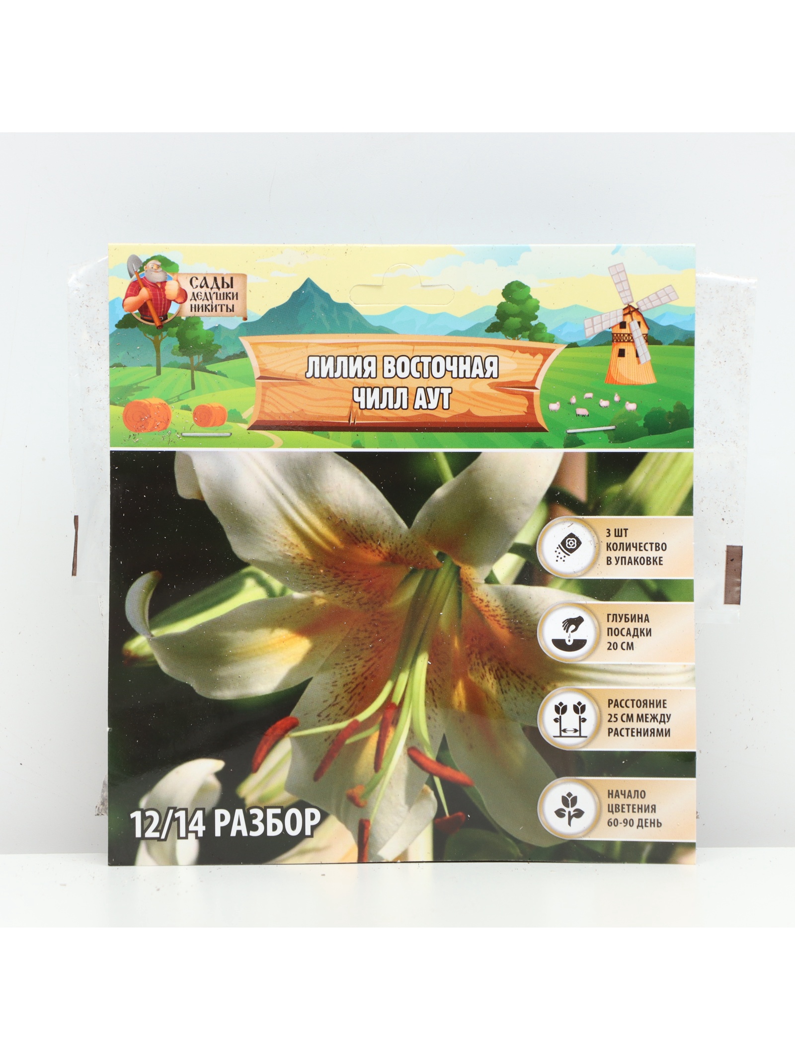 Лилия восточная «чилл аут», луковица в пакете с перфорацией, р-р 14/16 3 шт.. Лилии — травянистое растение, с прямостоячими стеблями высотой от 60 до 180 см. Луковицы голые или чешуйчатые, яйцевидной или округлой формы, состоят из небольших долек, плотно прилегающих друг к другу. Корни у лилий отходят от донца мощным пучком. Цветки лилий одиночные или собраны по нескольку штук в зонтичных соцветиях. Количество цветков в соцветиях достигает 35 40 шт. Требуется опора, чтобы поддержать тяжелые шапки цветов. Сажать нужно в полутени, в питательную и рыхлую водопроницаемую почву. Луковицы высаживаются в землю на глубину, превышающую их диаметр втрое. Подготовьте защитные подушки в каждой ямке из смеси промытого речного песка с золой. На песчаные подушки высадите луковицы, аккуратно расправляя их корни и немного вдавливая в песок. Сверху засыпьте почвой, полейте и замульчируйте торфом. Темпер. ограничение НЕ НИЖЕ :0|Сезон доставки:Лето|Вид упаковки:Пакет|Корневая система:ОКС (открытая корневая система)|Морозостойкость:От -29.1 до -35 °С|Место посадки:Солнце|Место посадки:Полутень|Сложность ухода:Не требовательное|Диаметр цветка (соцветия):20-25 см|Цветение:Однократное, длительное (1 раз за сезон)|Ширина куста:До 70 см|Высота растений:100-150 см|Период цветения:Лето|Вид :Восточные|Страна:Россия  развернуть описание ▼