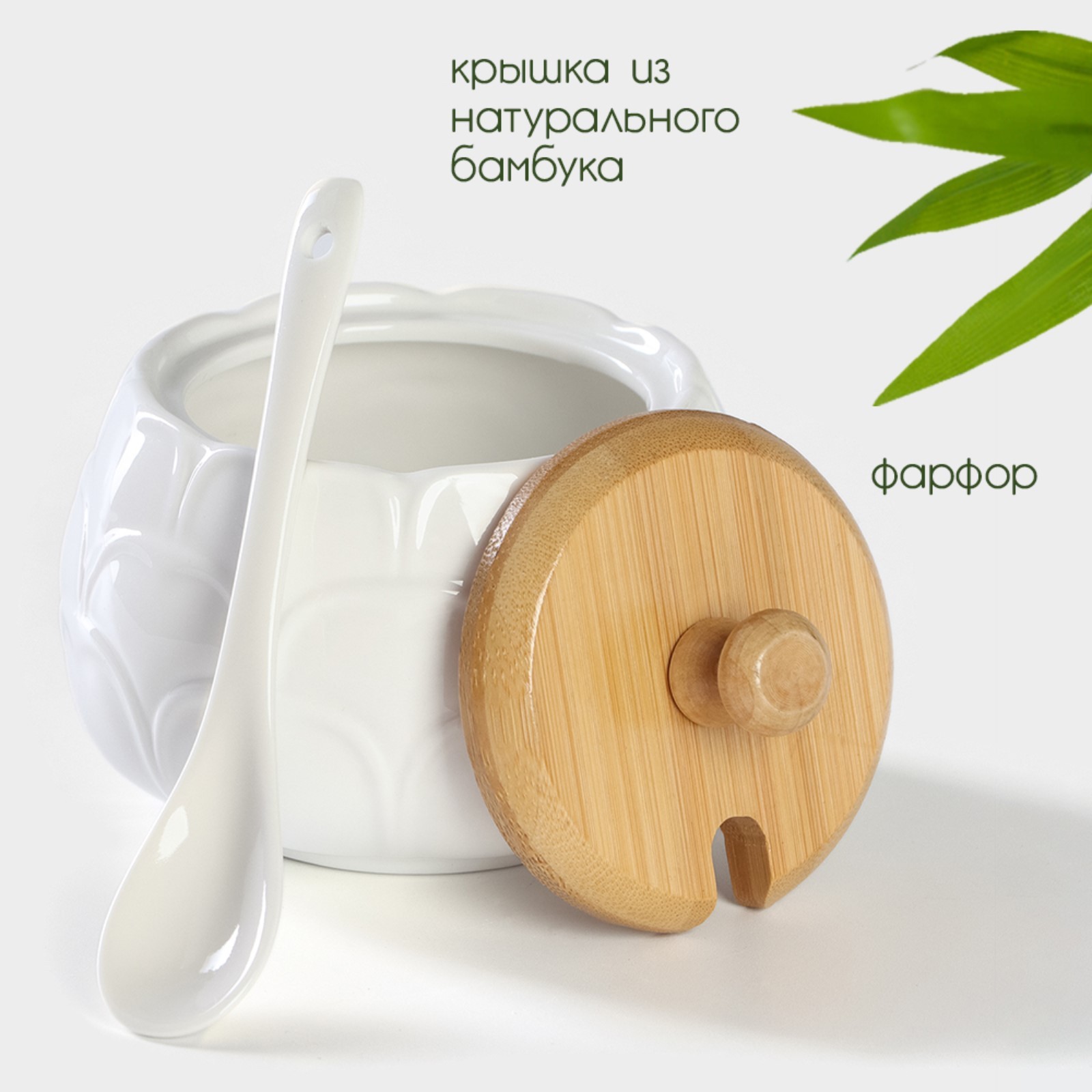 Сахарница фарфоровая с ложкой на бамбуковой подставке Bellatenero, 350 мл, цвет белый