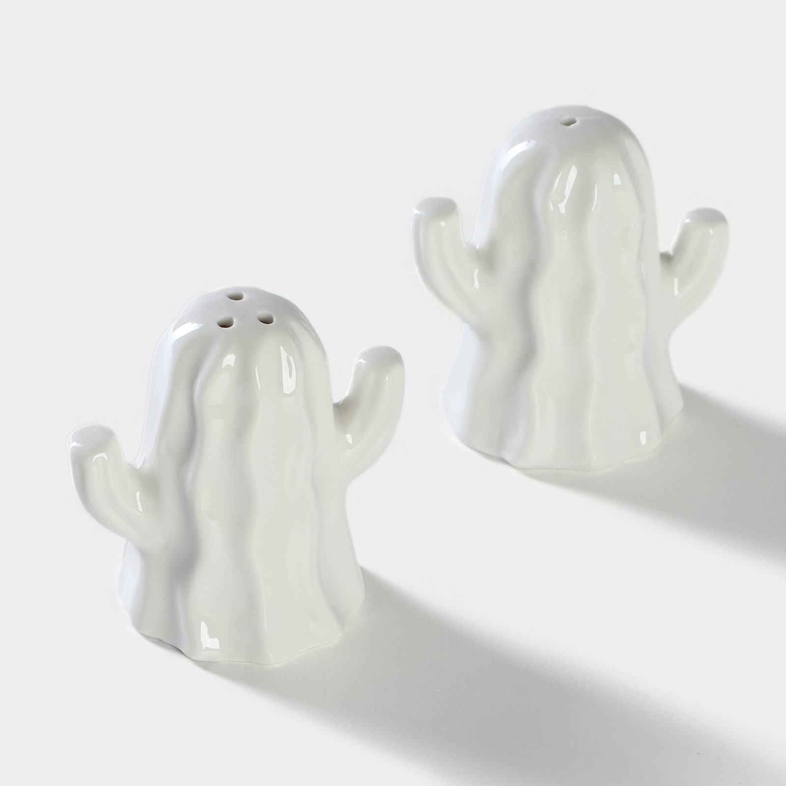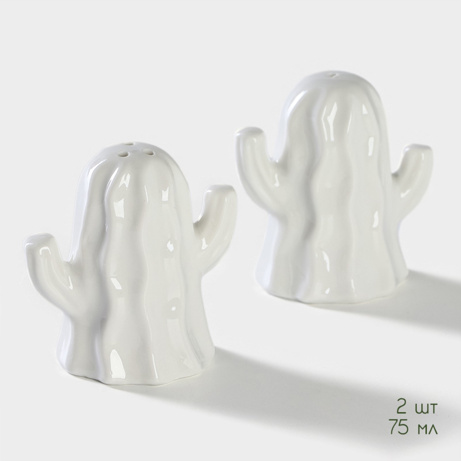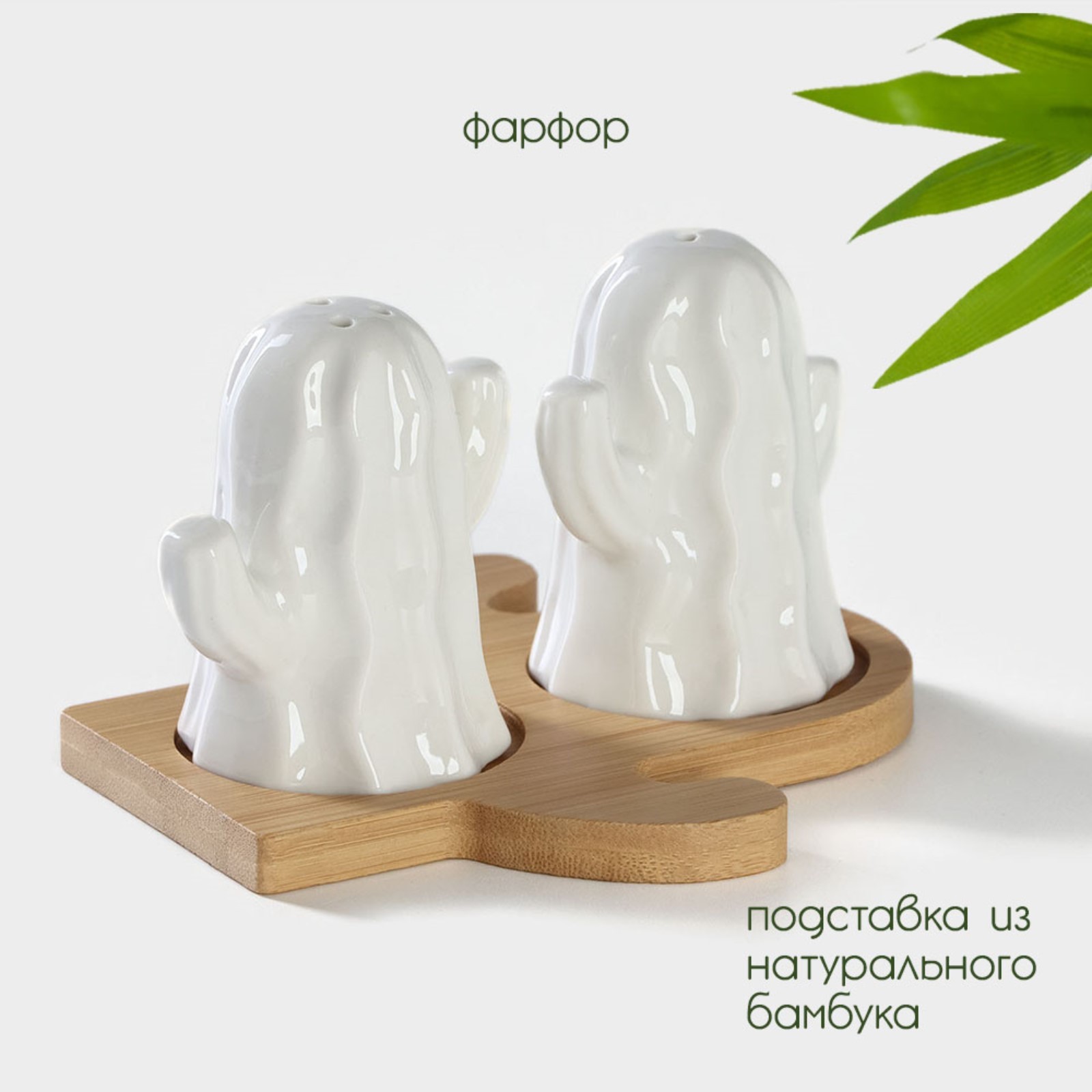 Набор фарфоровый для специй на бамбуковой подставке Bellatenero «кактусы», 2 предмета: солонка 75 мл, перечница 75 мл, цвет белы