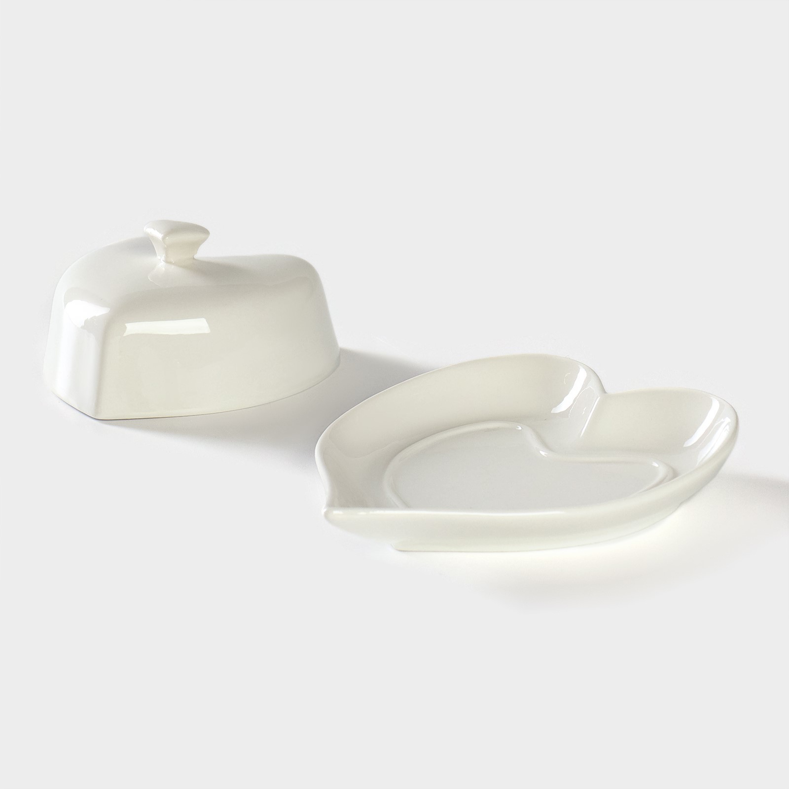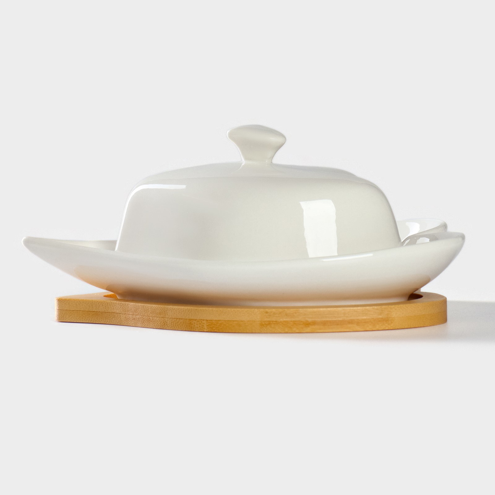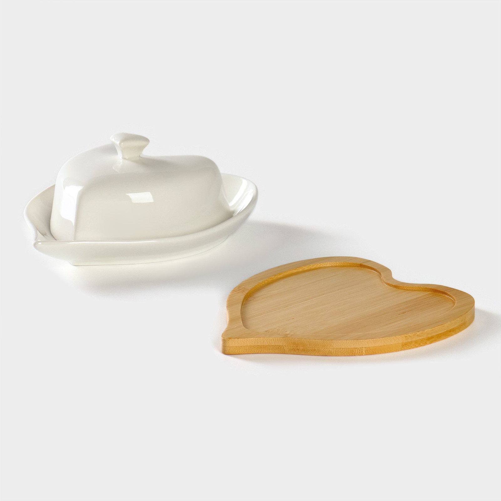 Маслёнка фарфоровая на подставке из бамбука доляна «эстет. сердце», 17x12,5x8 см, цвет белый