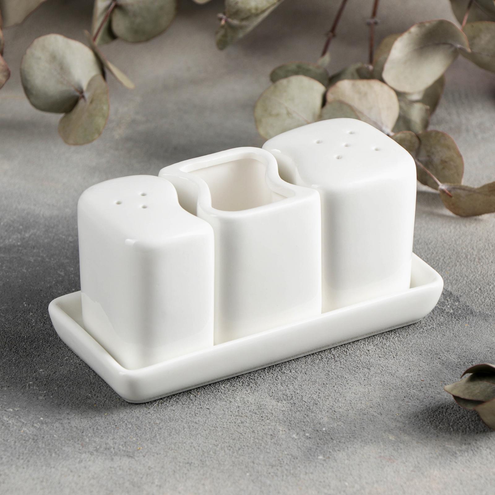 Набор для специй фарфоровый Magistro «бланш», 3 предмета: солонка 65 мл, перечница 60 мл, ёмкость для зубочисток, цвет белый