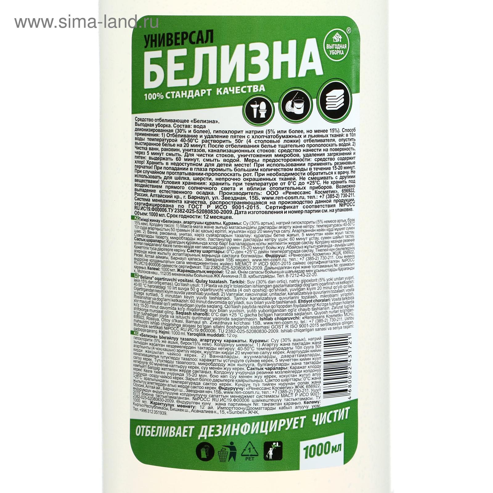 Жидкий отбеливатель «выгодная уборка», белизна, 1 л. Хлоросодержащее средство «Белизна» универсал применяется для отбеливания и удаления пятен с тканей, чистки ванн, раковин, унитазов, канализационных стоков, мытья пола, кафеля. Эффективно удаляет загрязнения, устраняет неприятный запах и уничтожает микробов. Подходит для стирки, замачивания, отбеливания вещей. Эффективна при чистке унитазов, душевых кабин, устраняет въевшиеся загрязнения. Способ применения: отбеливание и удаление пятен – в 10 л воды температурой 40-50 С растворить 50 г (4 столовые ложки) отбеливателя, опустить выстиранное белье на 20 минут. После отбеливания белье прополоскать водой. Чистка ванн, раковин, унитазов, канализационных стоков – средство нанести на поверхность, через 5 минут смыть. Для чистки стоков, уничтожения микробов, удаления загрязнений и пятен – выдержать 60 минут, смыть водой. Меры предосторожности: средство содержит хлор! Хранить в недоступном для детей месте! При использовании применять резиновые перчатки. При попадании средства в глаза промыть большим количеством воды в течении 15-20 минут. При случайном проглатывании промыть рот. Хранить при температуре от 0 до + 25 С. Предохранять от прямых солнечных лучей. Срок годности 12 месяцев с даты изготовления. Состав: вода деионизированная 30%, гипохлорид натрия 5%. Вес, г/Объём, мл: 1000 Объём, мл: 1000 Форма выпуска: Жидкость Назначение: Универсальное Назначение: Бытовые Температурное ограничение: Нет Вид: Хлоросодержащиее Эффект: Отбеливание Эффект: Дезинфицирующее  развернуть описание ▼