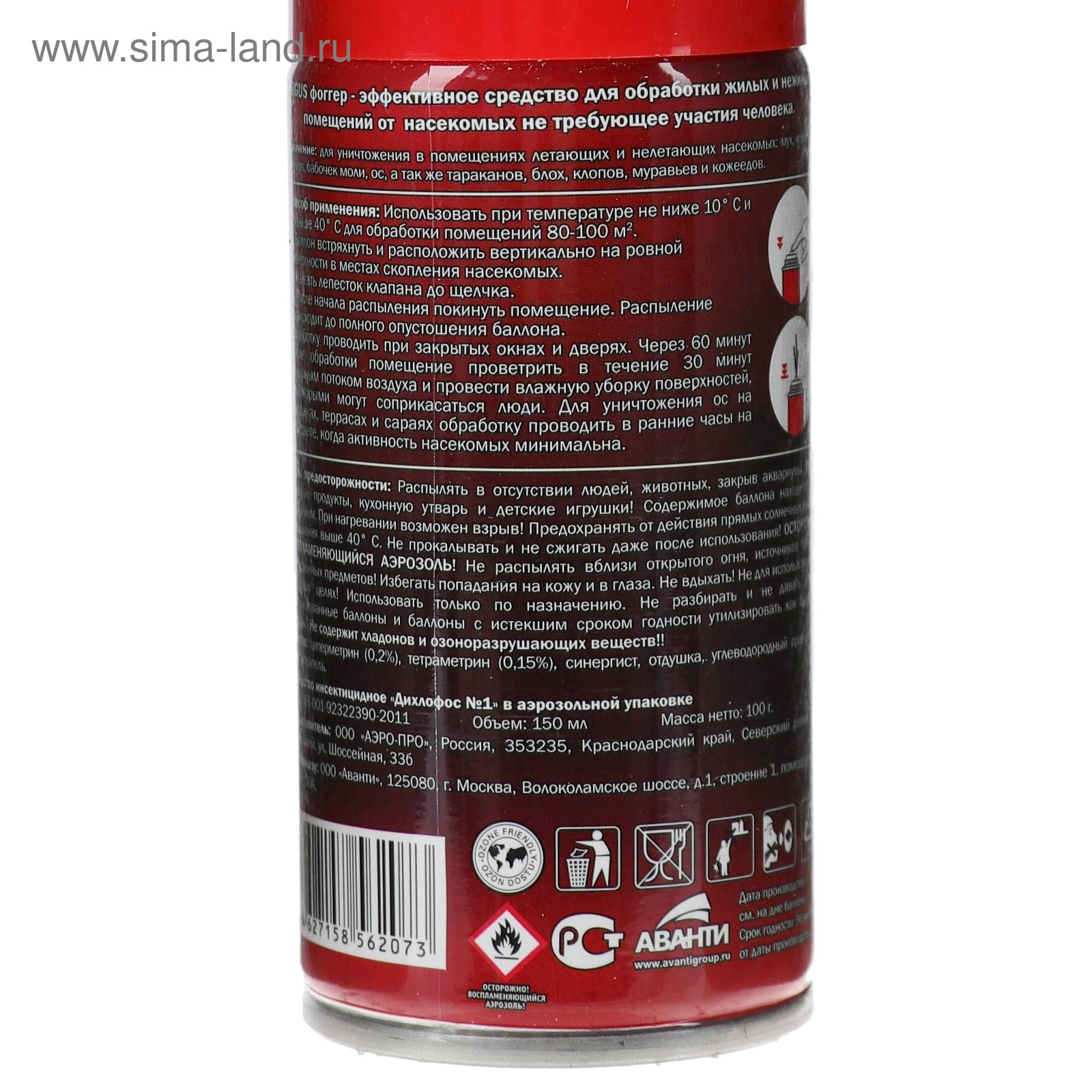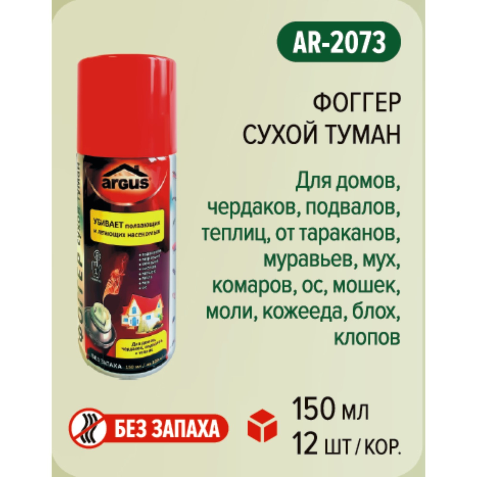 Средство от насекомых argus фоггер сухой туман, аэрозоль,150 мл. Описание:ARGUS ФОГГЕР СУХОЙ ТУМАН для домов, чердаков, подвалов и теплиц, от всех насекомых (ТАРАКАНОВ, муравьев, МУХ, КОМАРОВ , ОС, мошек, моль, кожееда, блох, КЛОПОВ) 150 мл (аэрозоль) БЕЗ ЗАПАХА! Для Назначение: ARGUS ФОГГЕР СУХОЙ ТУМАН - эффективное средство для обработки жилых и нежилых помещений от насекомых, не требующее участие человека. Для уничтожения в помещениях летающих и нелетающих насекомых: мух, комаров, москитов, бабочек моли, ос, а так же тараканов, блох, клопов, муравьев и кожеедов. ARGUS ФОГГЕР СУХОЙ ТУМАН отличный помощник для профессиональных обработок жилых и нежилых помещений от насекомых без участия человека. Быстро, эффективно, надежно!Способ применения::Перед применением баллон встряхнуть, поставить на стол или табурет распылительным клапаном вверх. Нажать рифленый лепесток клапана до фиксации (до щелчка). После начала распыления фоггера покинуть помещение. Распыление происходит до тех пор пока баллон не опустеет. Обработку следует проводить при закрытых окнах и дверях. Время полного уничтожения насекомых – 1 час. Через час проветрить помещение в течение 30 минут. Состав:: циперметрин 0, 2%, тетраметрин 0, 15% Вид средства: Аэрозоль Назначение: Универсальное Температурное ограничение: Нет Тип средства: Инсектицид  развернуть описание ▼