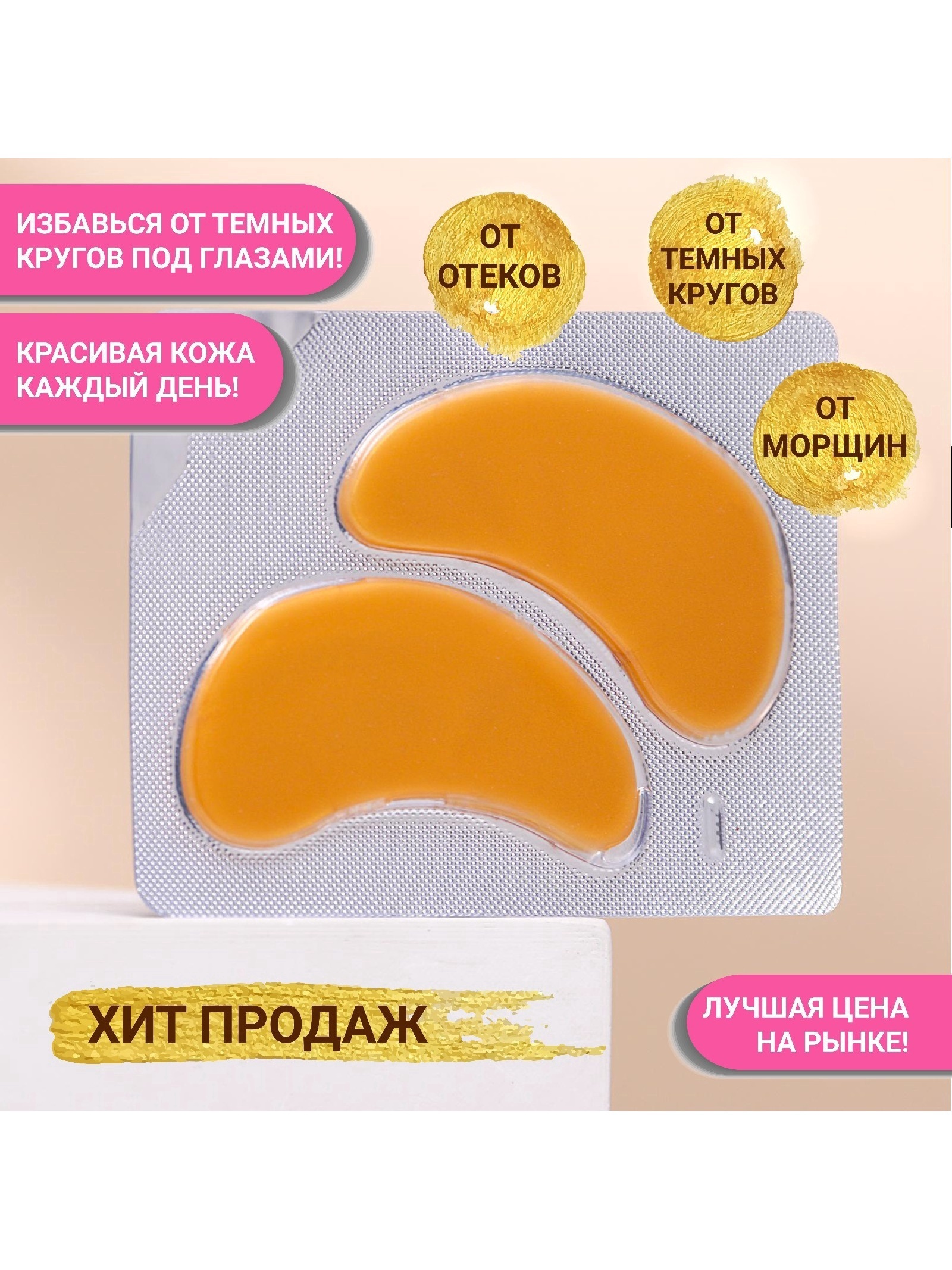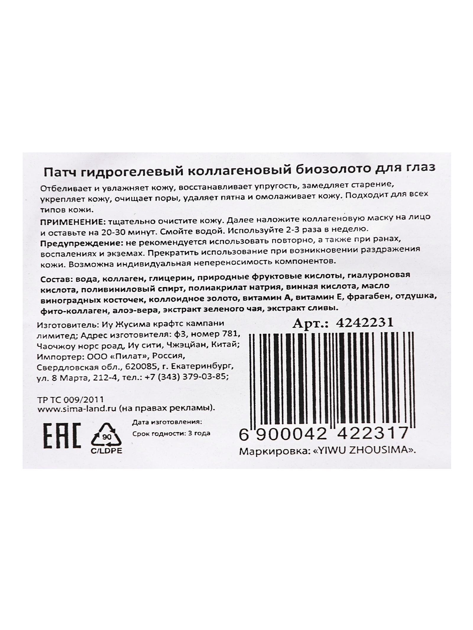 Патчи гидрогелевые для глаз с биозолотом. Гидрогелевые патчи плотно прилегают к коже, наделяя её полезными веществами, входящими в состав. Они борются с отечностью, делают темные круги менее выраженными, напитывают кожу влагой и наполняют её витаминами. Частицы золота, ключевой компонент средства, повышают тонус и эластичность кожи, ускоряют обновление клеток эпидермиса, восстанавливают защитные свойства и активизируют регенерацию кожи, оказывают омолаживающее действие, обеспечивая ярковыраженный лифтинг-эффект. Способ применения: извлеките патчи и нанесите на очищенную кожу вокруг глаз. Снимите через 20–30 минут и сделайте лёгкий массаж подушечками пальцев. Для достижения наилучшего эффекта храните упаковку с патчами в холодильнике. Внимание: только для наружного применения. Избегайте контакта с глазами. Если почувствуете какой-либо дискомфорт, то рекомендуется сразу же прекратить использование патчей. Возможна индивидуальная непереносимость компонентов состава. Хранить в недоступном для детей месте. Состав: Water, Artemisia, Colloidal Gold, Camellia Sinensis, Houttuynia cordata, Scutellaria Baicalensis, Polyninyl Alcohol, Sodium Polyacrylate, Tartaricacid, Grape Seed Oil, Citrus Junos, Vitamin A, Vitamin E, BHT, Glycerin,Methylparaben Fragaben, Parfume, Phyto-collage, Aloe vera, Green Tea Extract, Plum Extract. Вес, г/Объём, мл:10|Тип маски:Патчи|Темпер. ограничение НЕ НИЖЕ :0|Тип кожи:Для всех типов|Возраст:Для всех возрастов|Назначение:Питание и восстановление|Назначение:Увлажнение|Страна:Китай  развернуть описание ▼