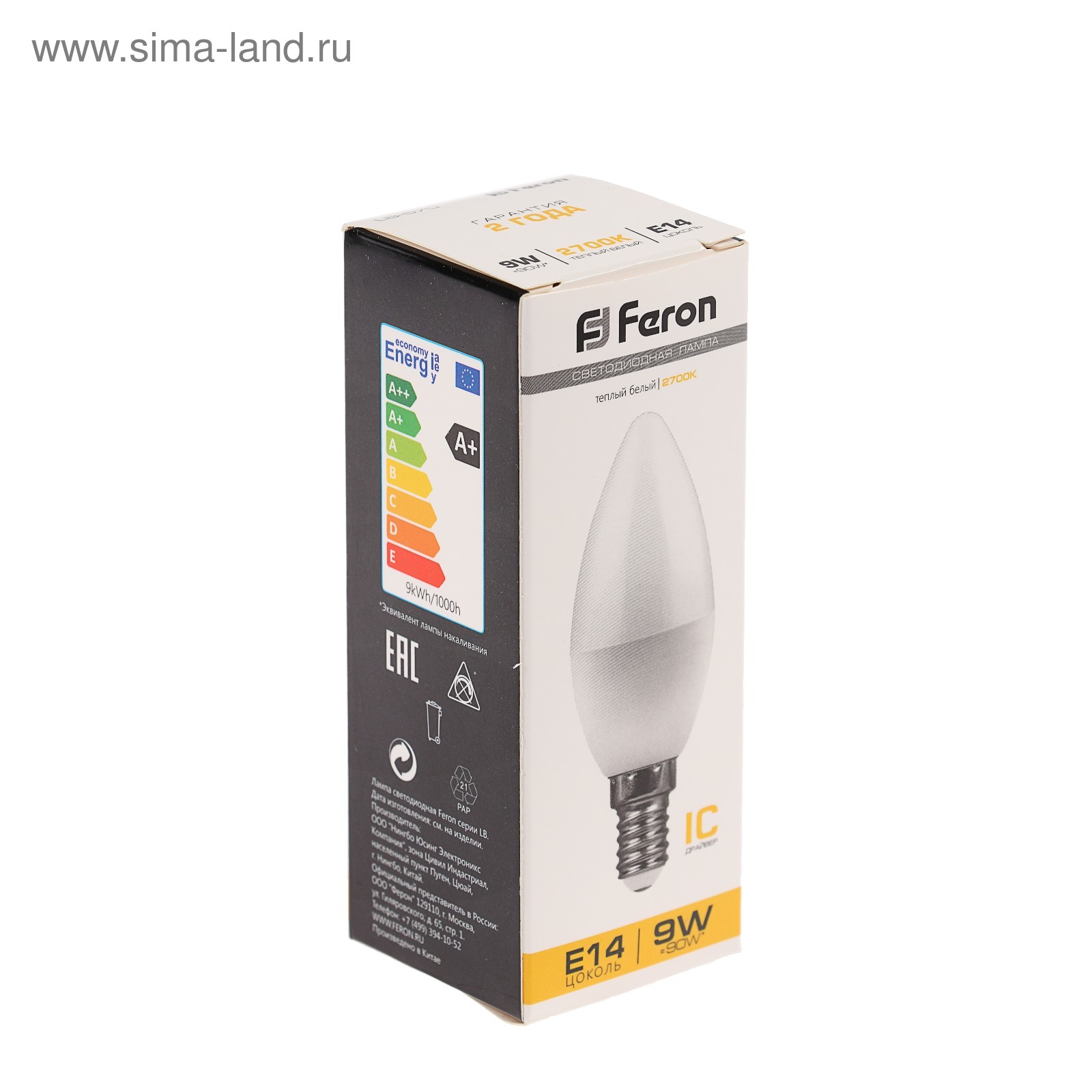 Лампа светодиодная feron, с37, 9 вт, е14, 2700 к, теплый белый. Цвет свечения: Белый Вид лампы: Светодиодная Цоколь: E14 Мощность, Вт: 9 Напряжение, В: 220 Световой поток, лм: 800 Цветовая температура: 2700К Форма лампы: Свеча Температурное ограничение: Нет Индекс цветопередачи: RA > 80 Диммируемая: Нет Класс энергоэффективности: A+  развернуть описание ▼