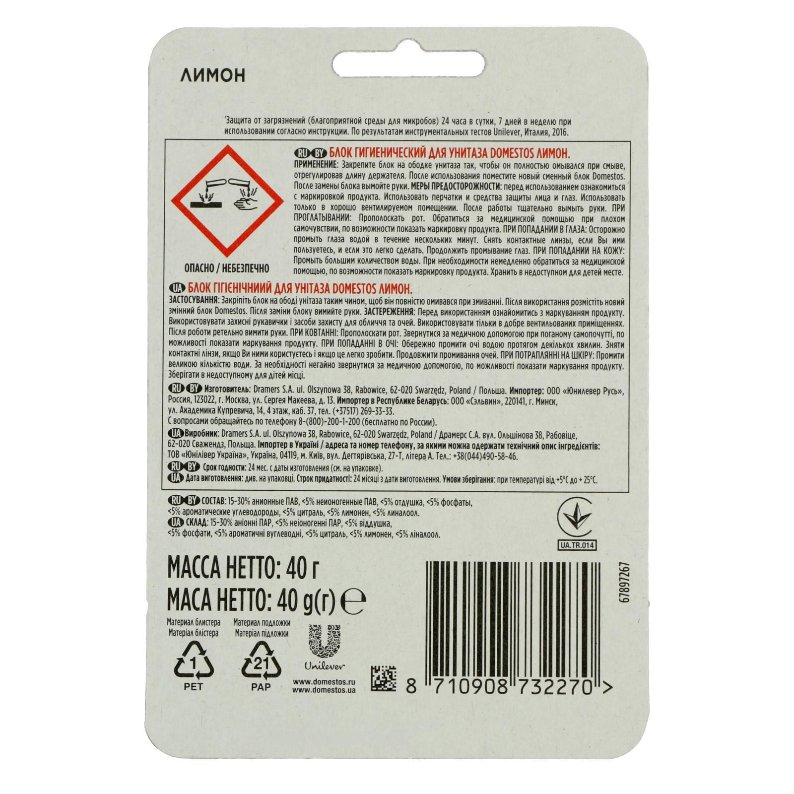 Блок гигиенический для унитаза, domestos "лимон", сила 3 в 1, 40 гр. Блок гигиенический для унитаза 3 в 1 аромат лимон – три действия в одном эффективном средстве. Благодаря формуле с микрочастицами оно содержит целых три преимущества, обеспечивающих защиту от загрязнений, а значит и от микробов: борется с налетом, поддерживает чистоту, добавляет блеск, оставляя свежесть надолго. Способ применения: закрепите блок на ободке унитаза так, чтобы он полностью омывался при смыве, отрегулировав длину держателя. После использования поместите новый сменный блок. После замены тщательно вымыть руки. Меры предосторожности: используйте перчатки и средства защиты лица и глаз. Использовать только в хорошо вентилируемом помещении. При проглатывании прополоскать рот. Обратиться за медицинской помощью при плохом самочувствии, по возможности показать маркировку продукта. При попадании в глаза осторожно промыть глаза водой в течении нескольких минут. Снять контактные линзы, если вы ими пользуетесь, и если это легко сделать. Продолжить промывание. Состав: 15-30% анаонные ПАВ, 5% неиногенные ПАВ, 5% отдушка, 5% фосфаты, 5% ароматические углевороды, 5% цитраль, 5% лимонен, 5% линалоол. Аромат: Лимон : 0 Температурное ограничение: Нет Вид средства: Сменный блок  развернуть описание ▼