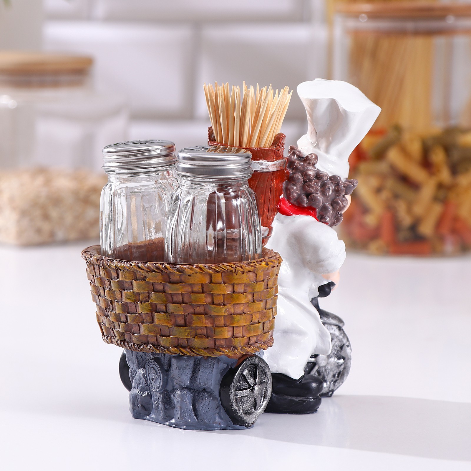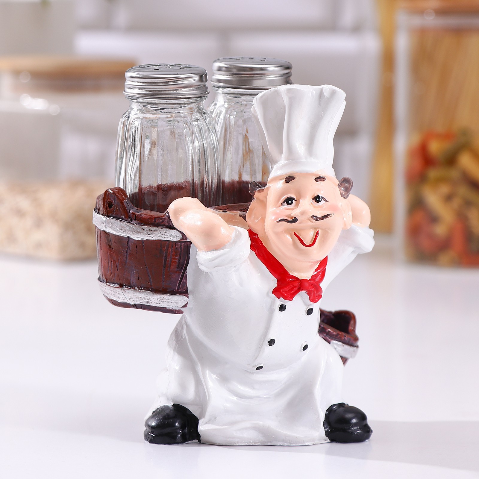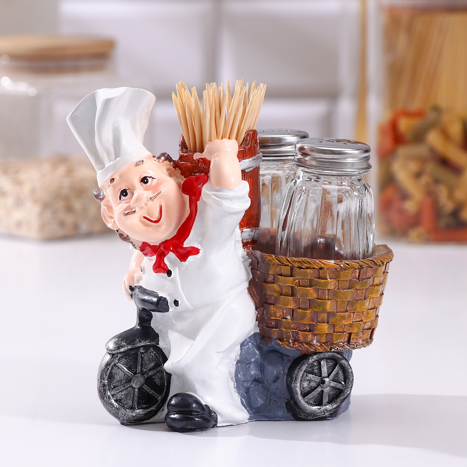 Набор для специй на подставке «повар», 3 предмета: солонка 50 мл, перечница 50 мл, подставка с ёмкостью для зубочисток, фигурка