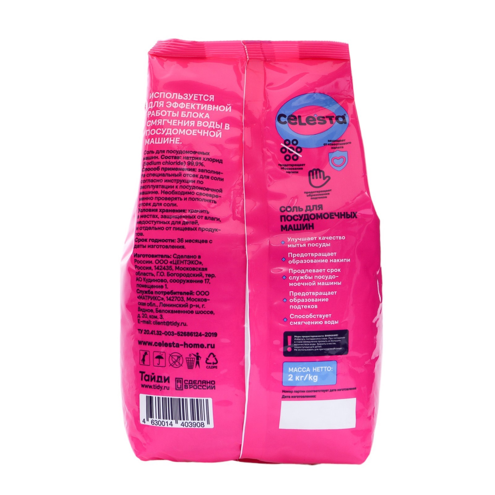 Соль для посудомоечных машин celesta, 2 кг. Специальная соль для посудомоечных машин используется для эффективной работы блока смягчения воды в посудомоечной машине. Специальная соль увеличивает ресурс посудомоечной машины, обеспечивает ее нормальную работу, улучшает качество мытья посуды и предотвращает появление подтеков на ней, защищает нагревательные элементы от образования известкового налета и продлевает срок их службы. Состав: натрия хлорид. Вес, кг: 2 Форма выпуска: Кристалл  развернуть описание ▼