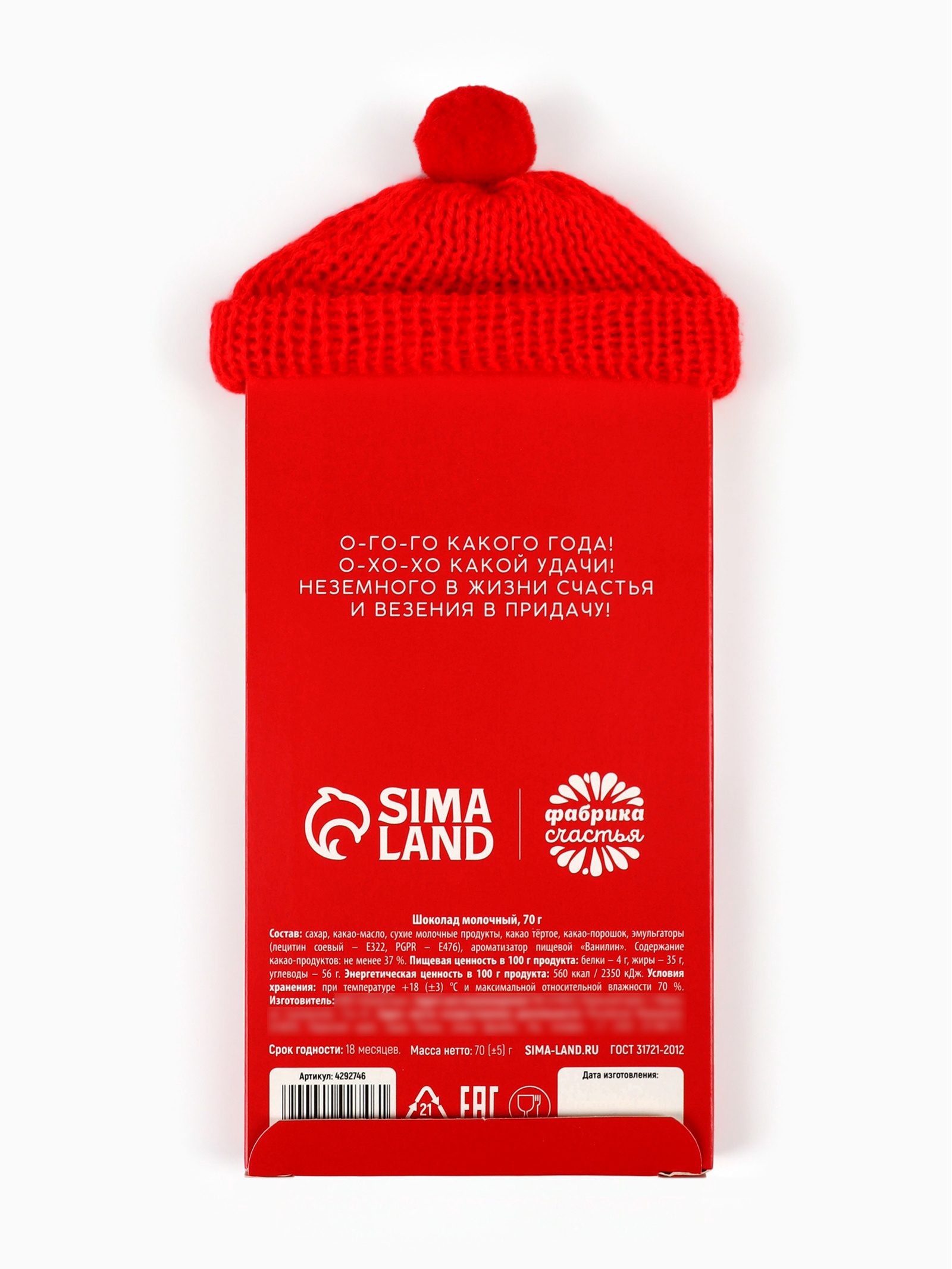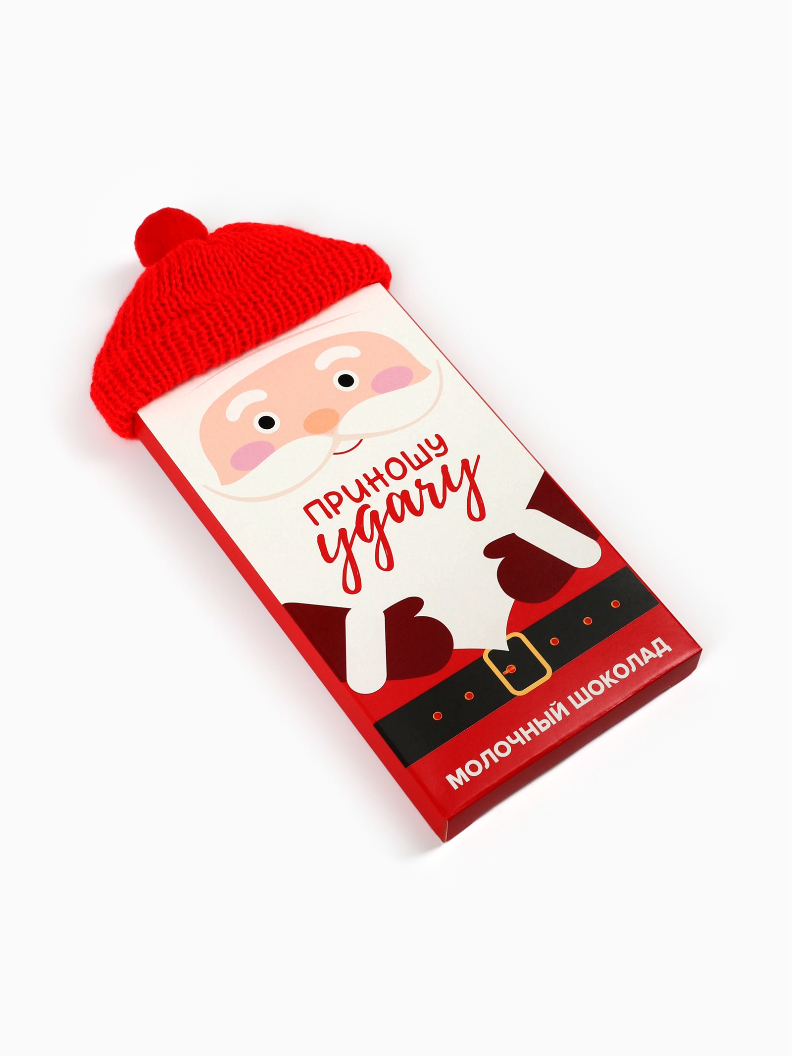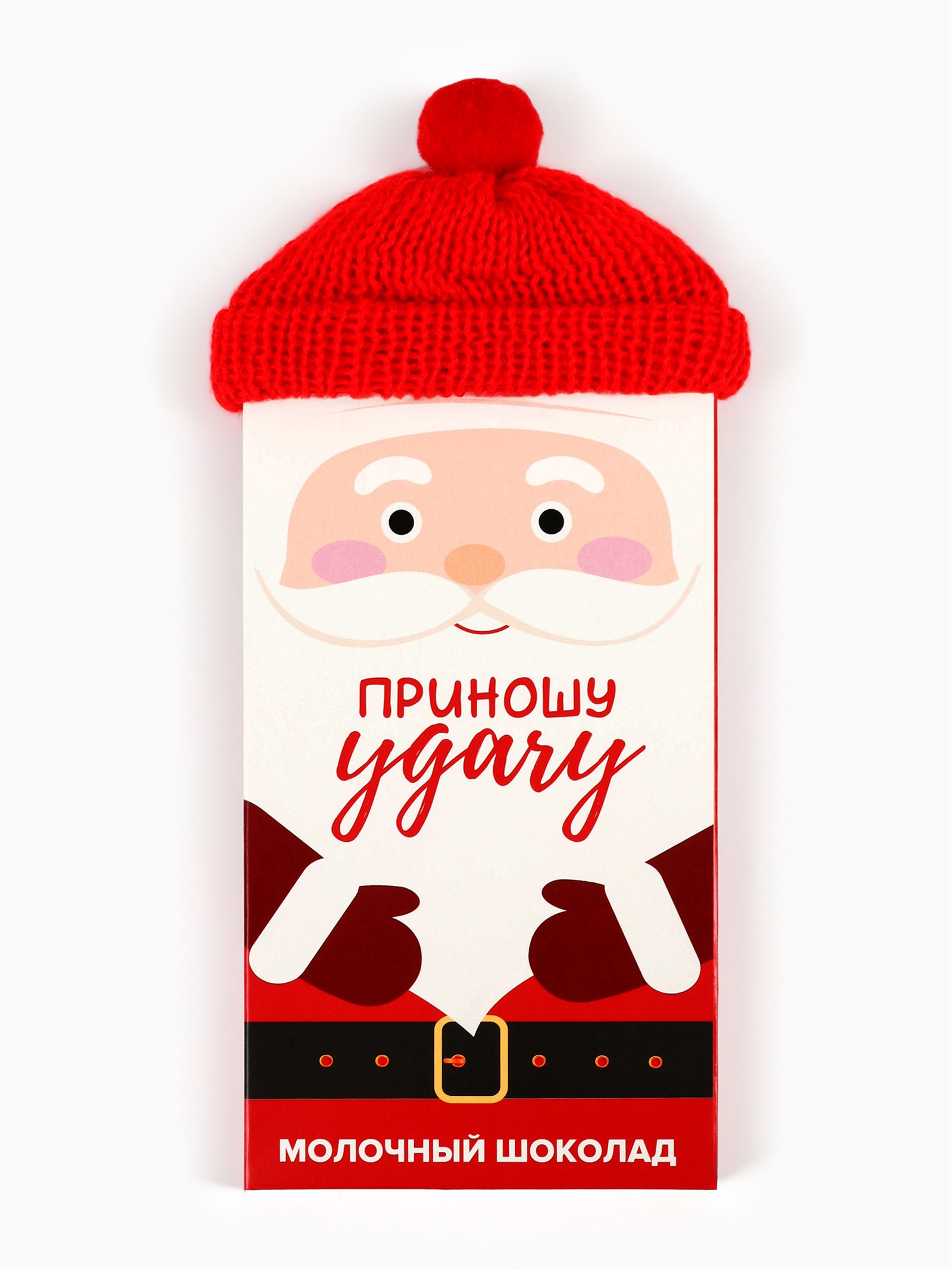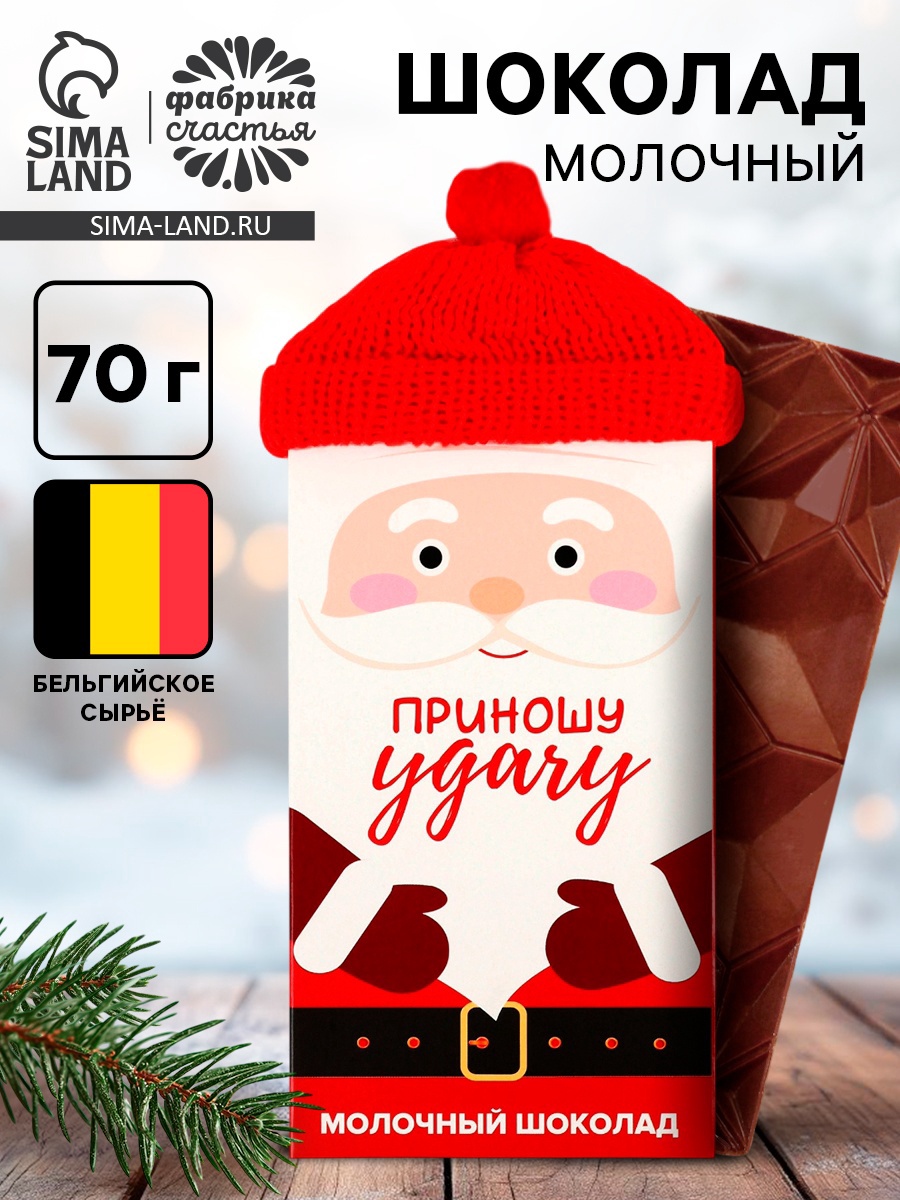 Шоколад новогодний молочный «приношу удачу»: в шапочке, 70 г.. При оформление заказа, просим запрашивать актуальные сроки годности у менеджера Состав: сахар, какао - масло, сухие молочные продукты, какао тёртое, какао - порошок, эмульгаторы (лецитин соевый - Е322, PGPR), ароматизатор пищевой Ванилин. Содержание какао - продуктов: не менее 37%. Пищевая ценность в 100 г: белки - 4 г, жиры - 35 г, углеводы - 56 г. Энергетическая ценность в 100 г: 560 ккал/2350 кДж. Срок годности: 12 месяцев Масса нетто: 70 г Белки, г:4.5|Жиры, г:35|Углеводы, г:56|Вес нетто, г:70|Энергетическая ценность, ккал:560|Символ года:Нет|Тематика праздника:Новый год|Форма:Плитка|Вид шоколада:Молочный|Добавки:Без добавок|Страна:Россия  развернуть описание ▼