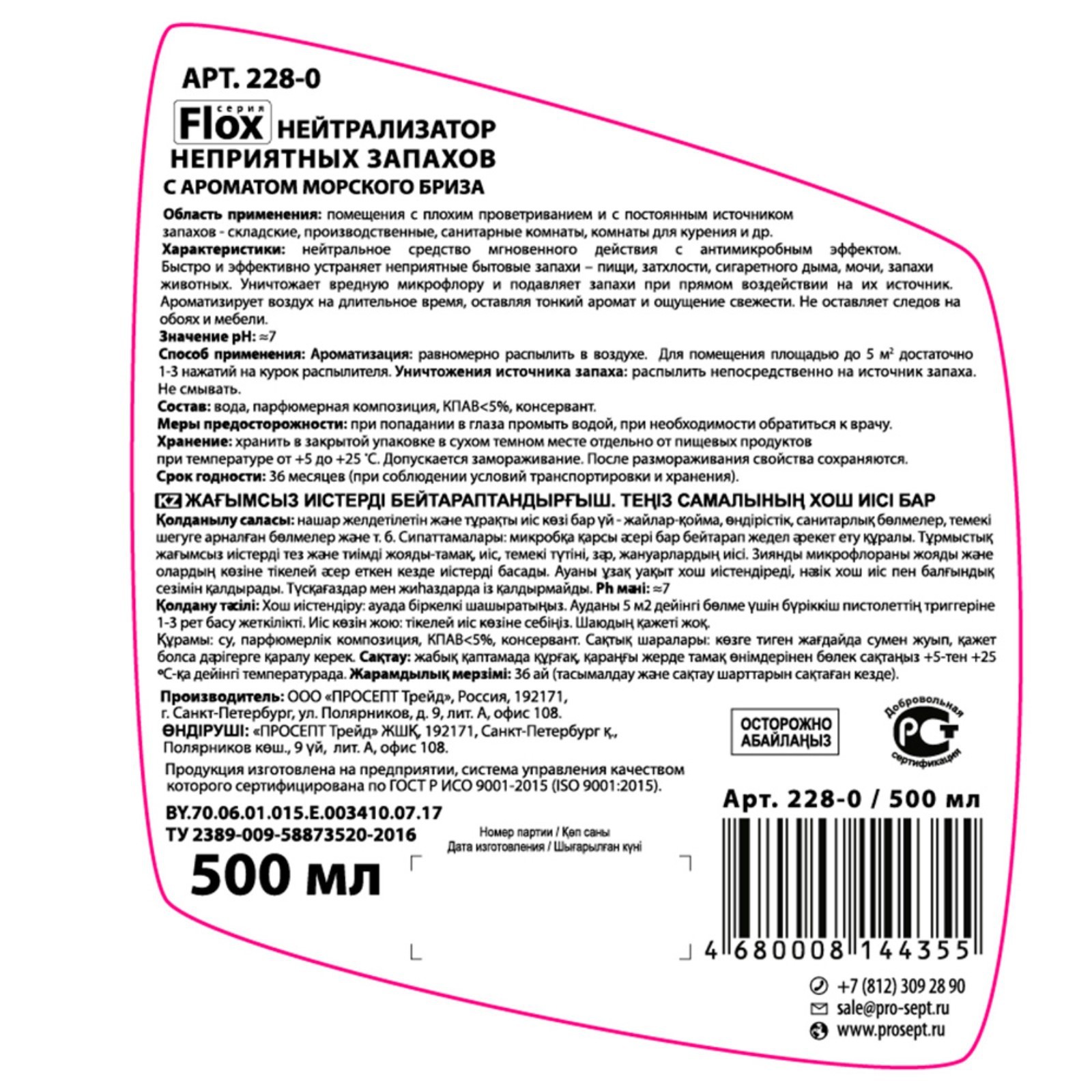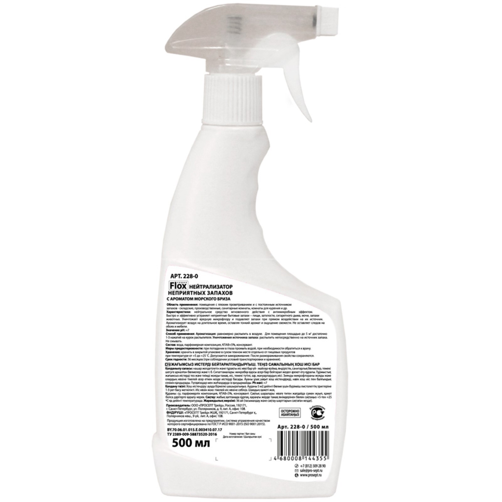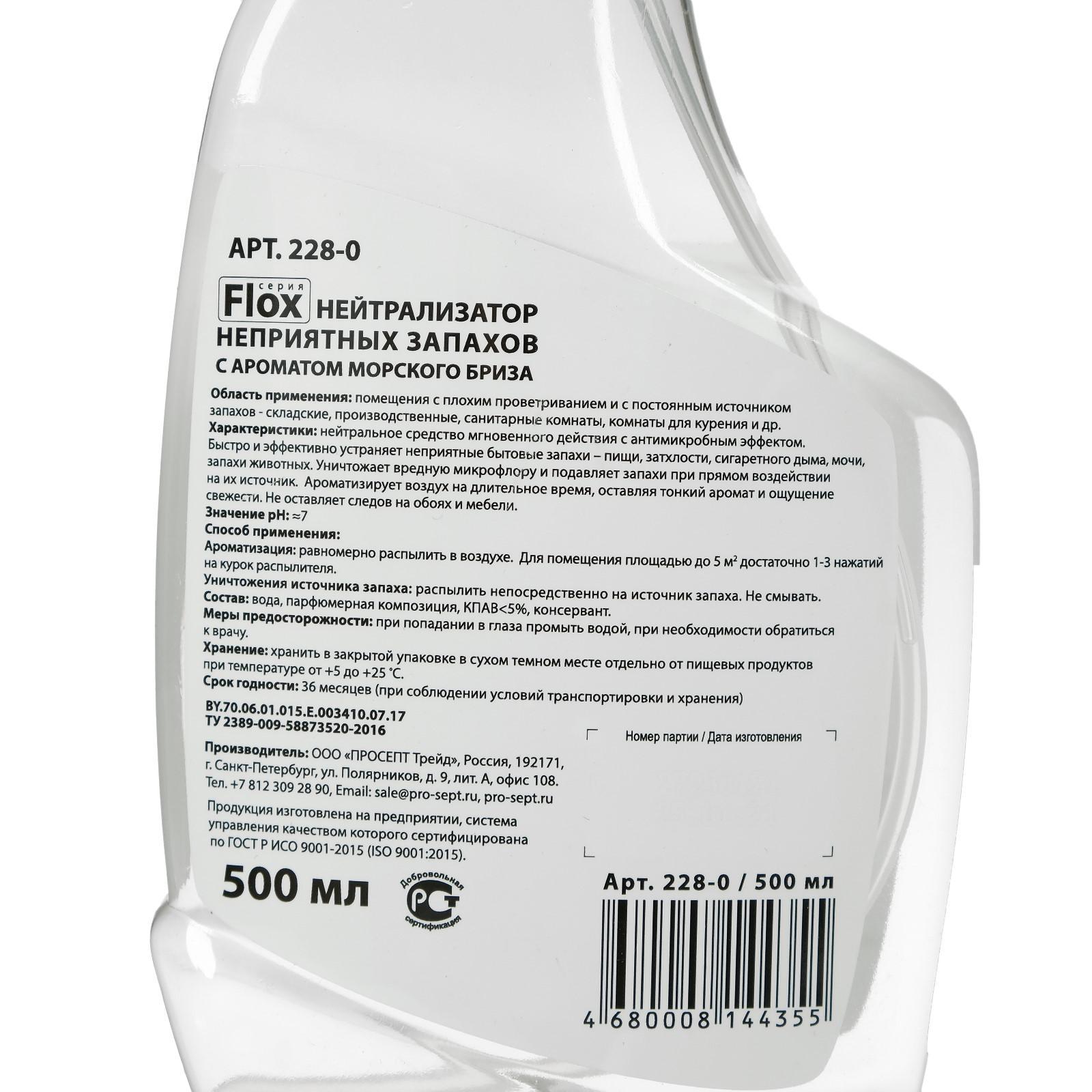 Нейтрализатор запаха flox sea i "морской бриз, 0,5 л. Нейтрализатор запаха Flox Sea I Prosept – средство мгновенного действия с антимикробным эффектом и бодрящим ароматом морского бриза. Быстро и эффективно устраняет неприятные бытовые запахи – пищи, затхлости, сигаретного дыма, мочи, запахи животных. Особенно рекомендуется для использования в помещениях, предназначенных для курения и туалетных комнатах. Химически стабильно в воде и на воздухе. Преимущества: • уничтожает источник вредной микрофлоры неприятного запаха; • ароматизация на длительное время; • не оставляет следов на мебели и обоях; • экологически безопасно. Способ применения: Для ароматизации: • Равномерно распылить в воздухе. • Для помещения площадью до 5 кв. м достаточно 1-3 нажатий на курок распылителя! Для уничтожения источника запаха: • Распылить непосредственно на источник запаха. Не смывать! Меры предосторожности: при попадании в глаза промыть водой, при необходимости обратиться к врачу. Не использовать вблизи открытого огня и включённых нагревательных приборов! Беречь от детей! Объём, мл: 500 Аромат: Морской бриз Форма выпуска: Спрей Принцип работы: Ручной Вид распыления: Водное Температурное ограничение: Нет  развернуть описание ▼