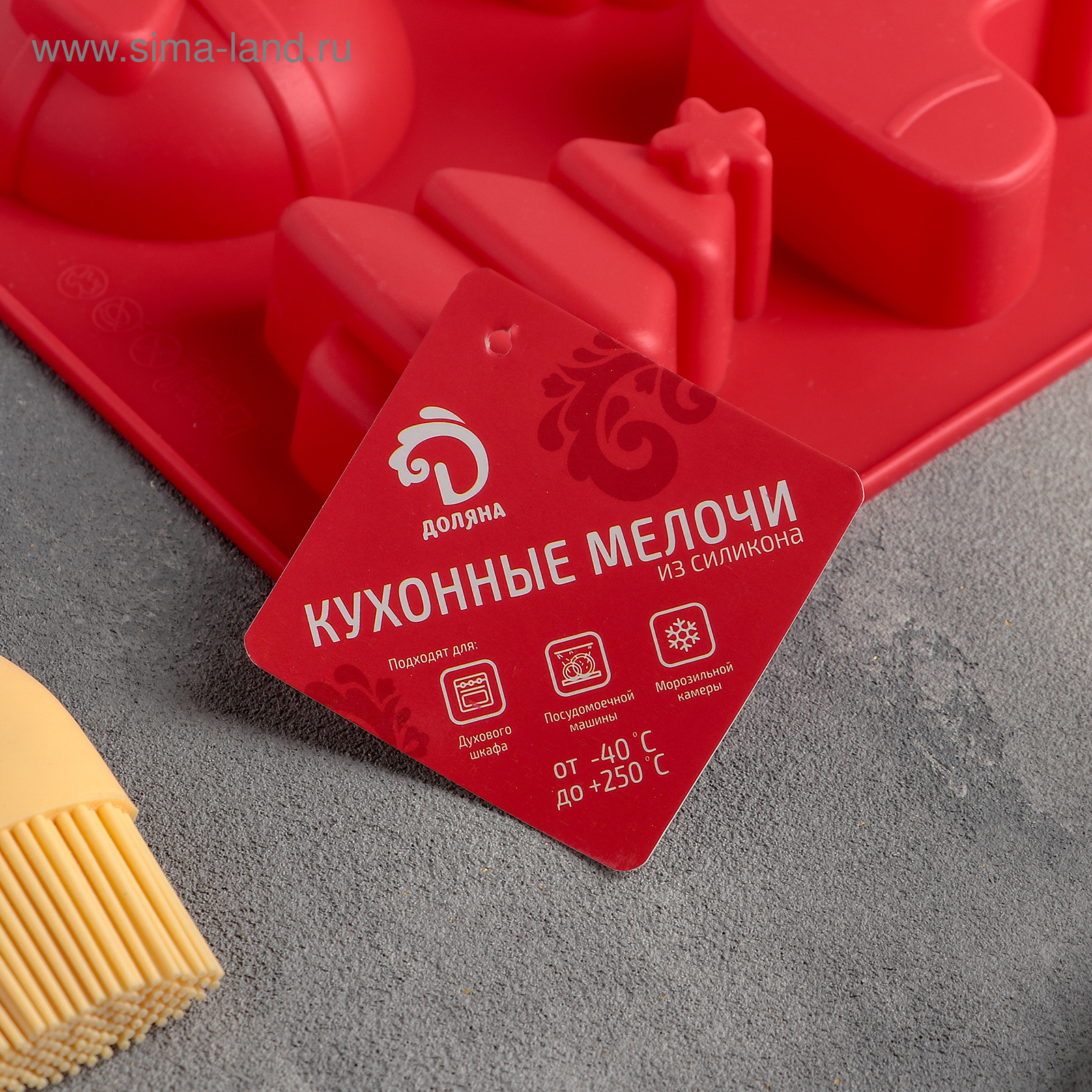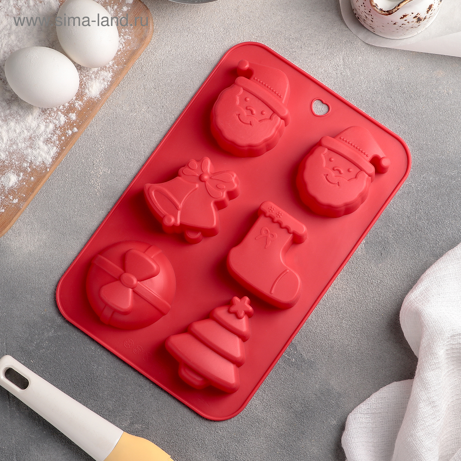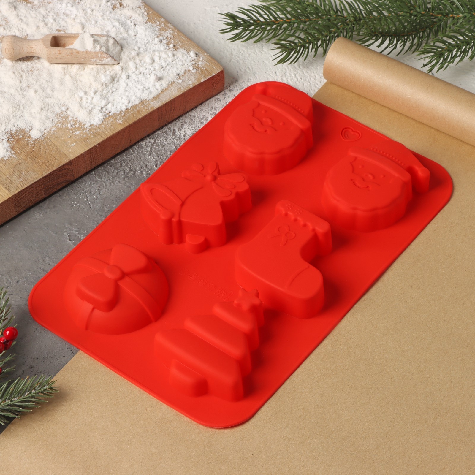 Форма силиконовая для выпечки доляна «новый год. праздник к нам приходит», 26x17,5 см, 6 ячеек, цвет красный. Силиконовая форма подойдёт для приготовления любых блюд. Изделие обладает антипригарными свойствами, за счёт чего выпечка легко вынимается и не пригорает. Форма не прихотлива, её легко мыть и удобно хранить, выдерживает температуру –40. . . +230°С. Она не вступает в химическую реакцию с продуктами и не выделяет вредных веществ. Используйте форму в духовых шкафах, микроволновых печах и аэрогрилях. Главное, избегайте контакта с открытым огнём. Цвет: Красный Фасовка, шт.: 1 Крышка: Нет Материал: Силикон Тип покрытия: Без покрытия Ячейки: Да Наличие палочек для форм: Нет Тип формы: Для печенья и пирожных Разъёмная форма: Нет Съёмное дно: Нет Можно мыть в посудомоечной машине: Да  развернуть описание ▼