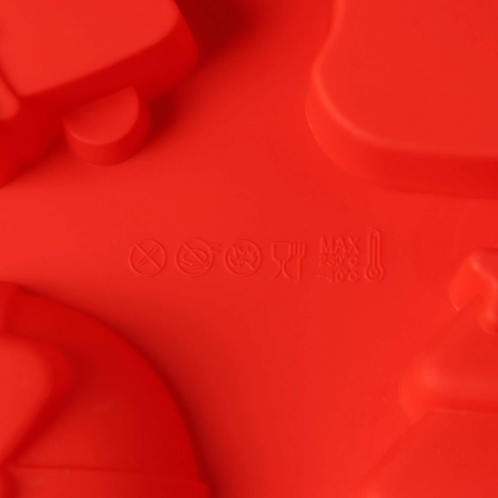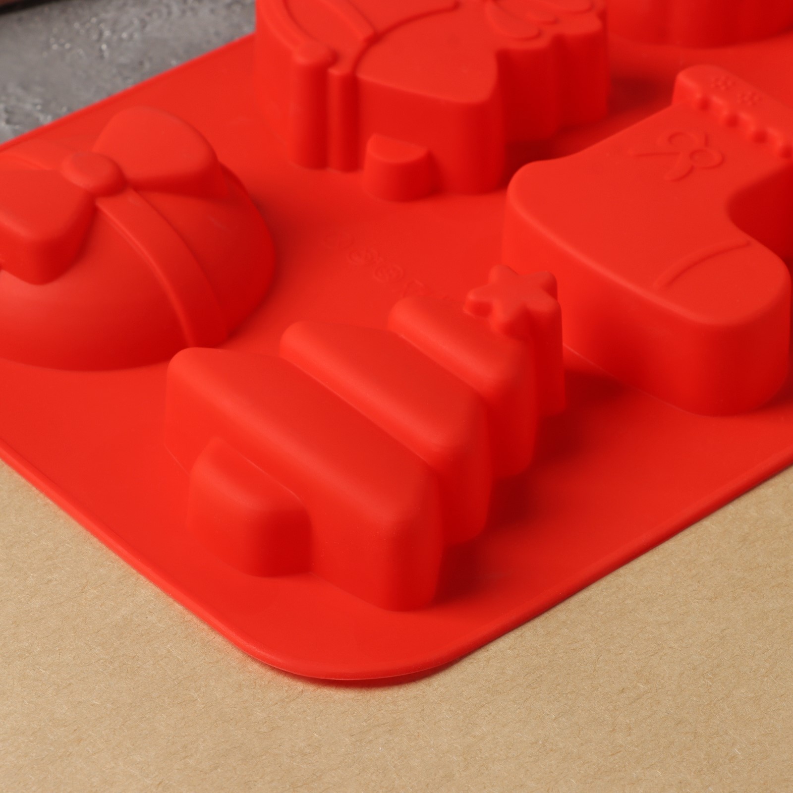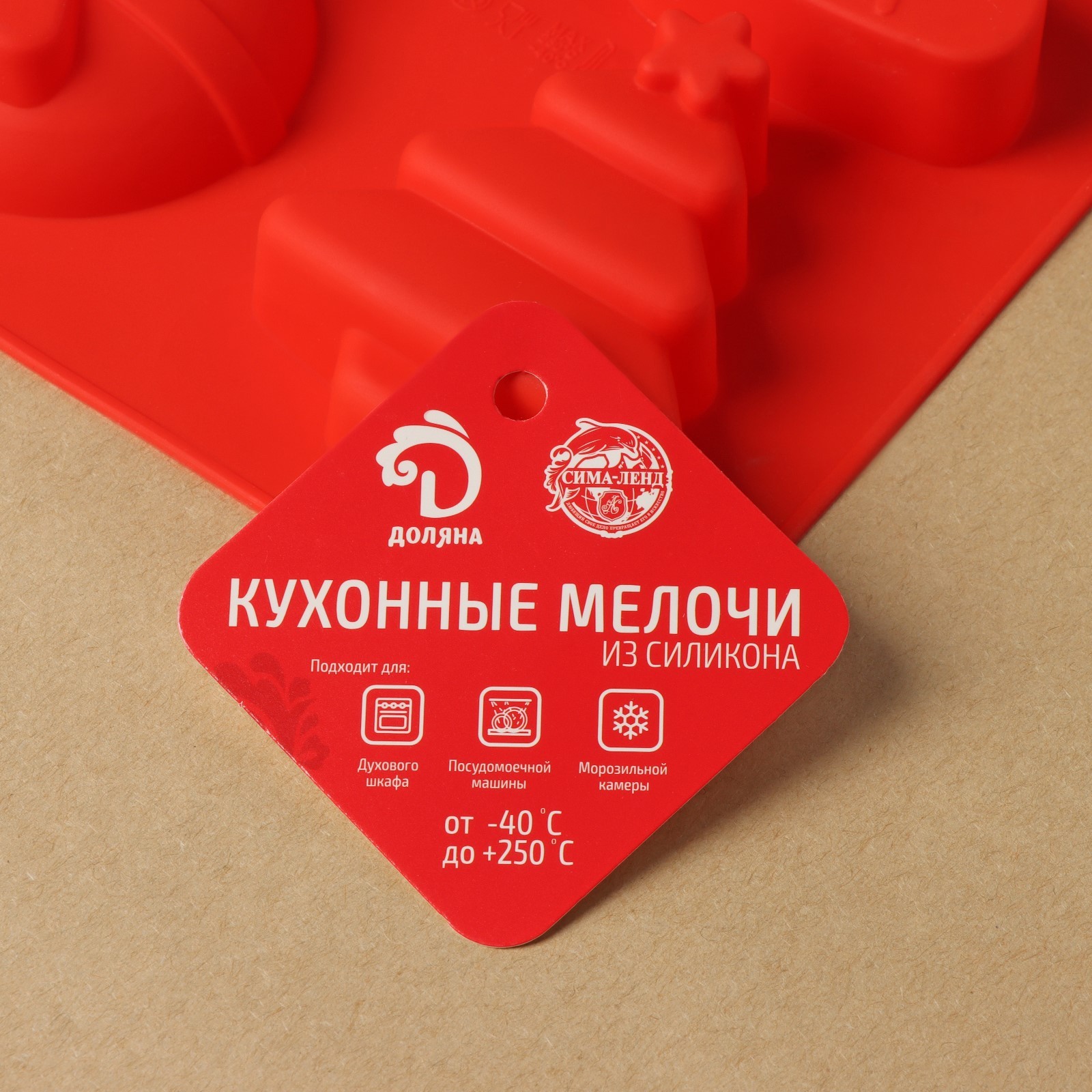 Форма силиконовая для выпечки доляна «новый год. праздник к нам приходит», 26x17,5 см, 6 ячеек, цвет красный. Силиконовая форма подойдёт для приготовления любых блюд. Изделие обладает антипригарными свойствами, за счёт чего выпечка легко вынимается и не пригорает. Форма не прихотлива, её легко мыть и удобно хранить, выдерживает температуру –40. . . +230°С. Она не вступает в химическую реакцию с продуктами и не выделяет вредных веществ. Используйте форму в духовых шкафах, микроволновых печах и аэрогрилях. Главное, избегайте контакта с открытым огнём. Цвет: Красный Фасовка, шт.: 1 Крышка: Нет Материал: Силикон Тип покрытия: Без покрытия Ячейки: Да Наличие палочек для форм: Нет Тип формы: Для печенья и пирожных Разъёмная форма: Нет Съёмное дно: Нет Можно мыть в посудомоечной машине: Да  развернуть описание ▼